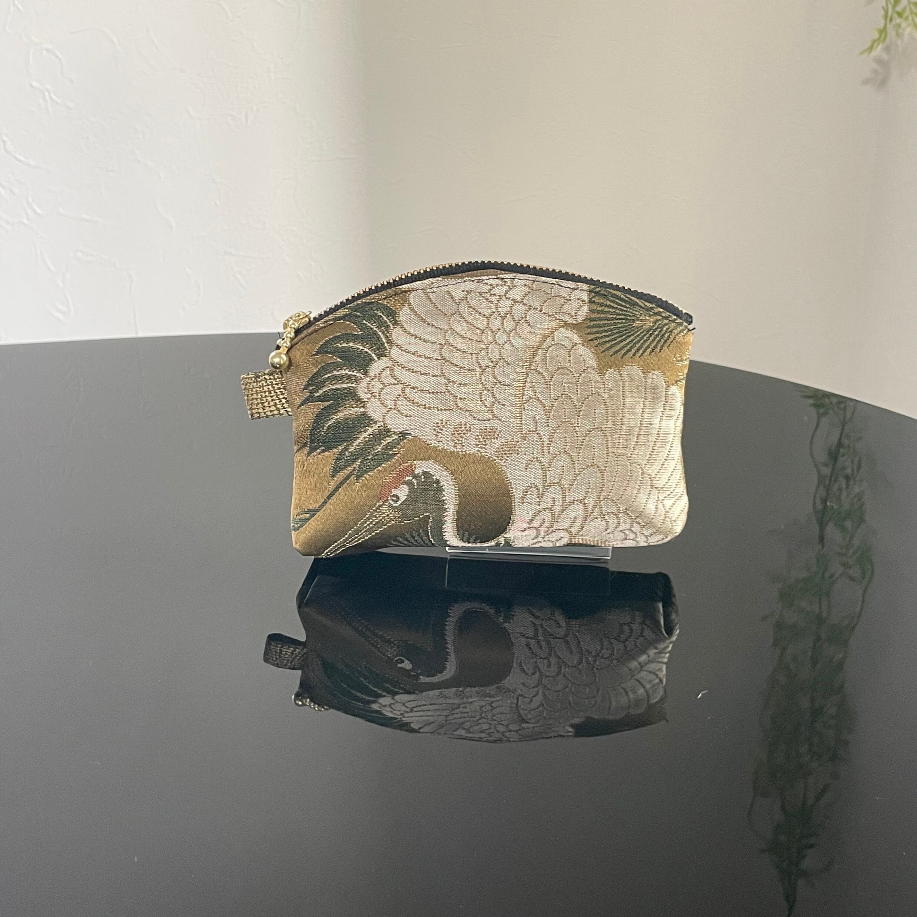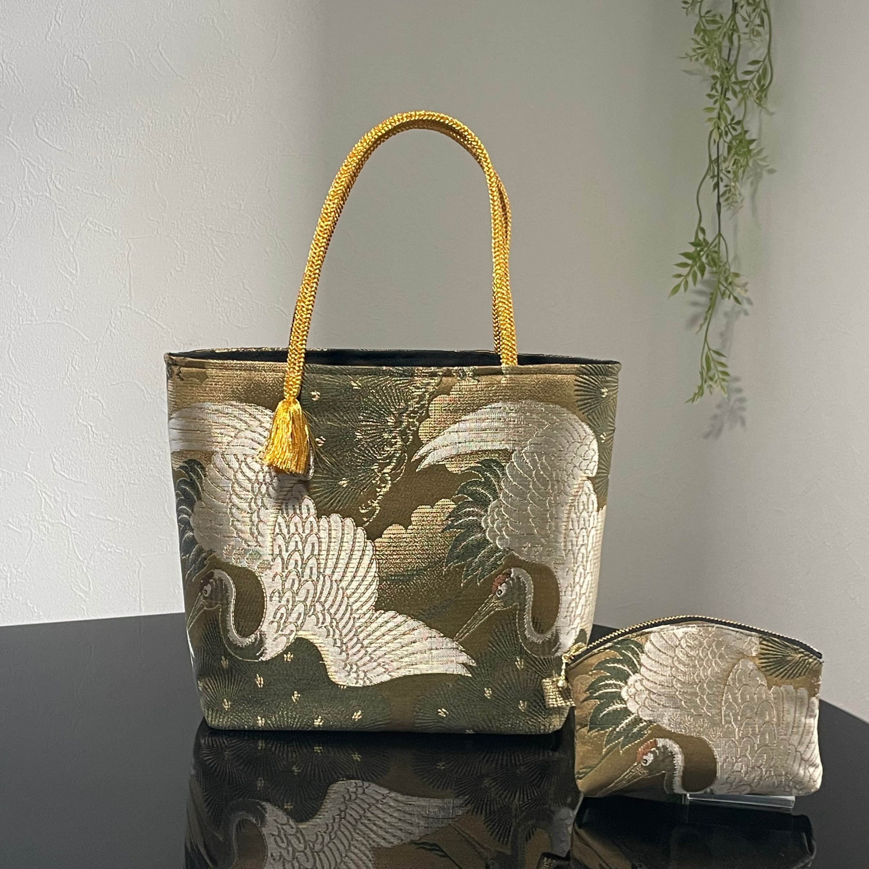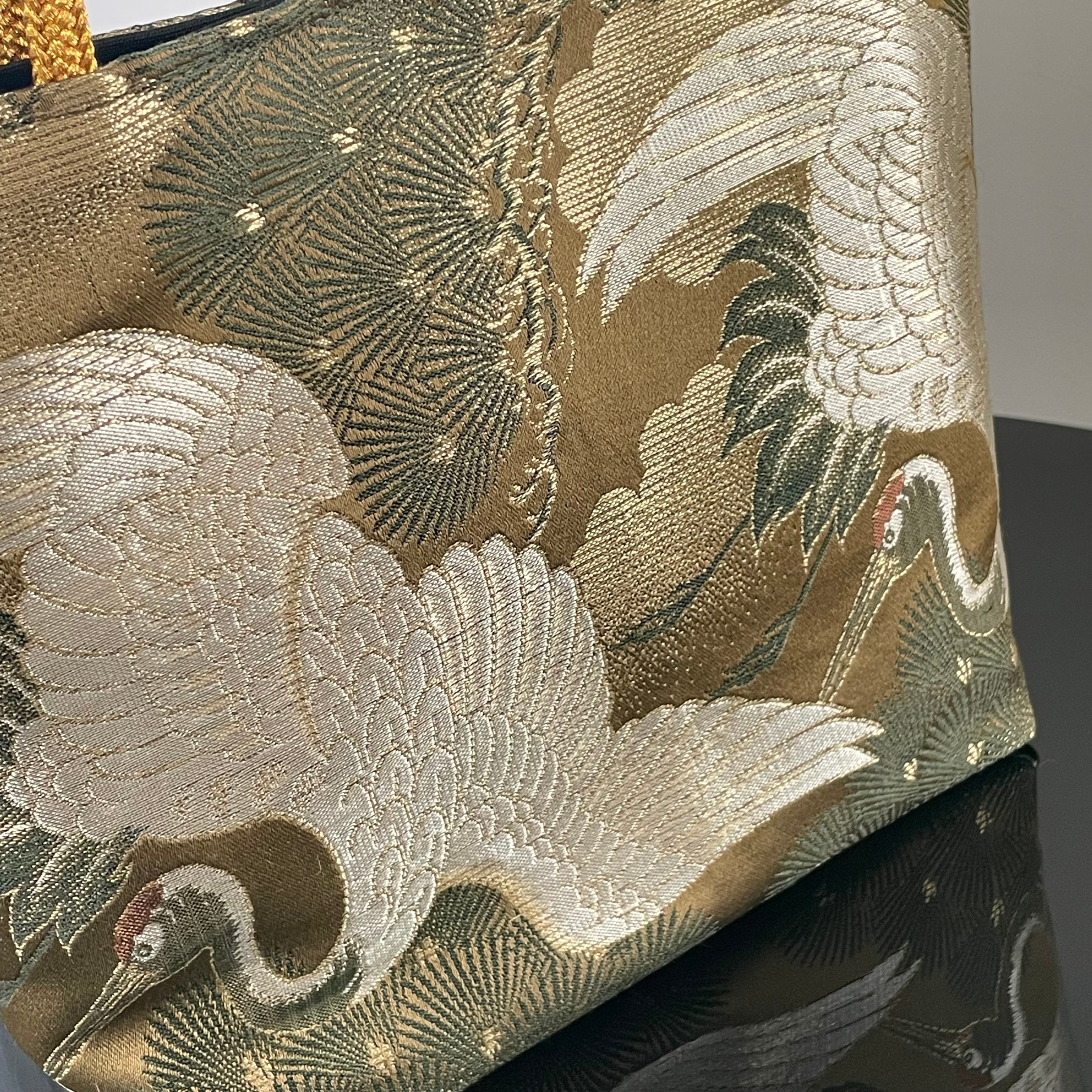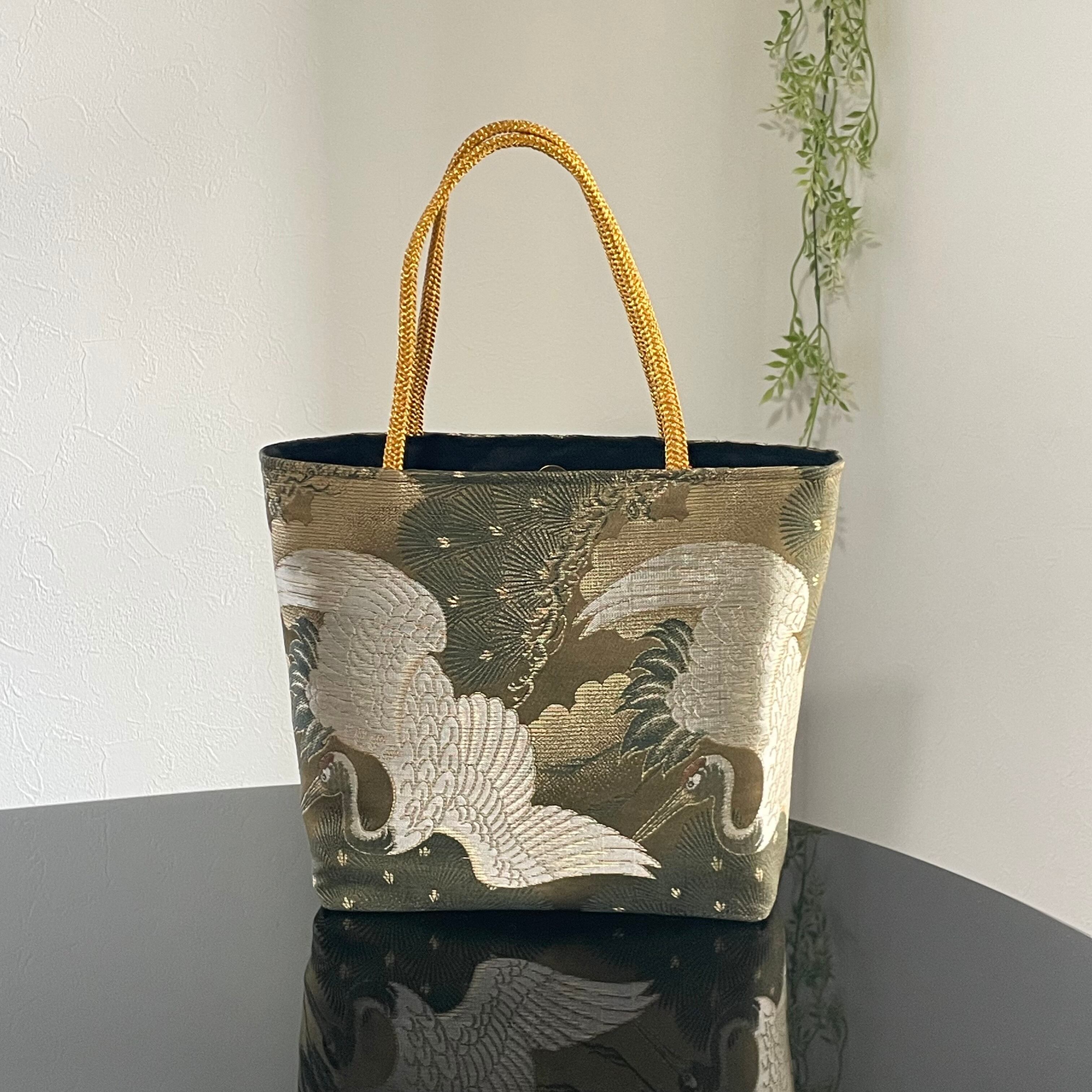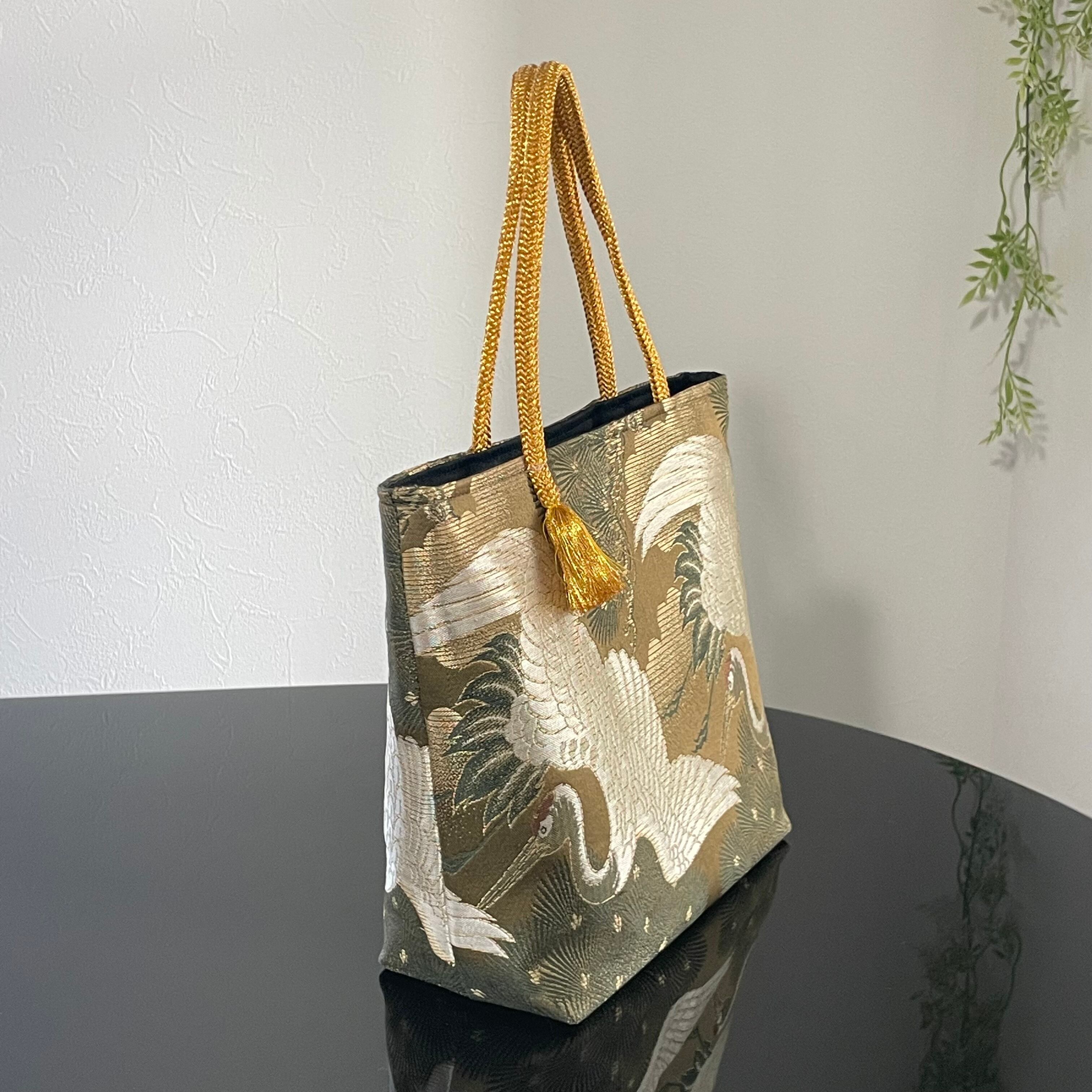 帯リメイクバッグ 丸帯 二羽の鶴 トートバッグ Mサイズ 和装バッグ