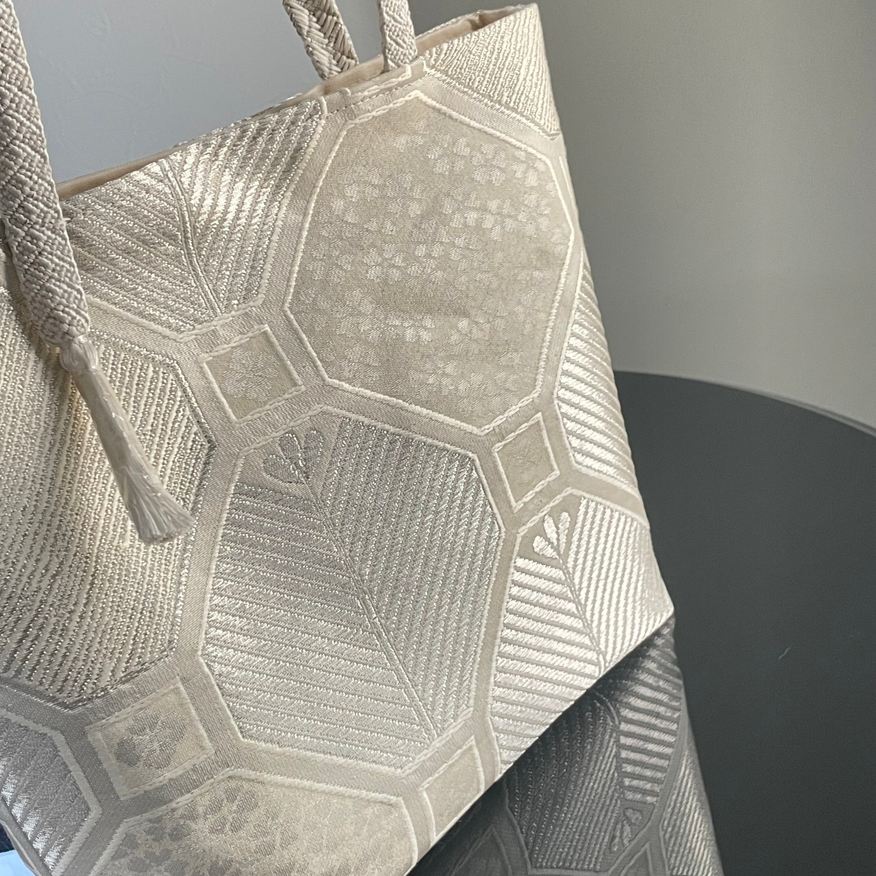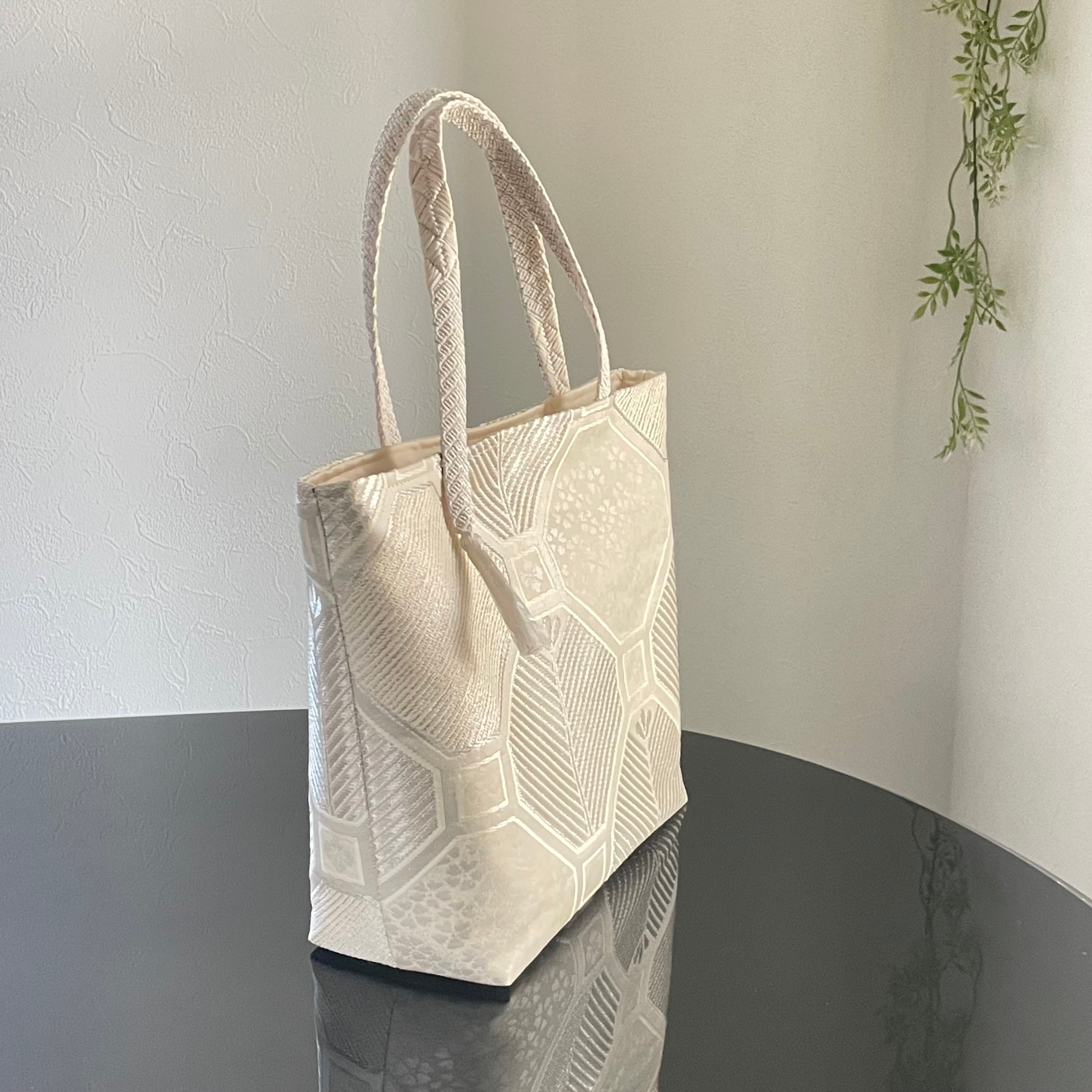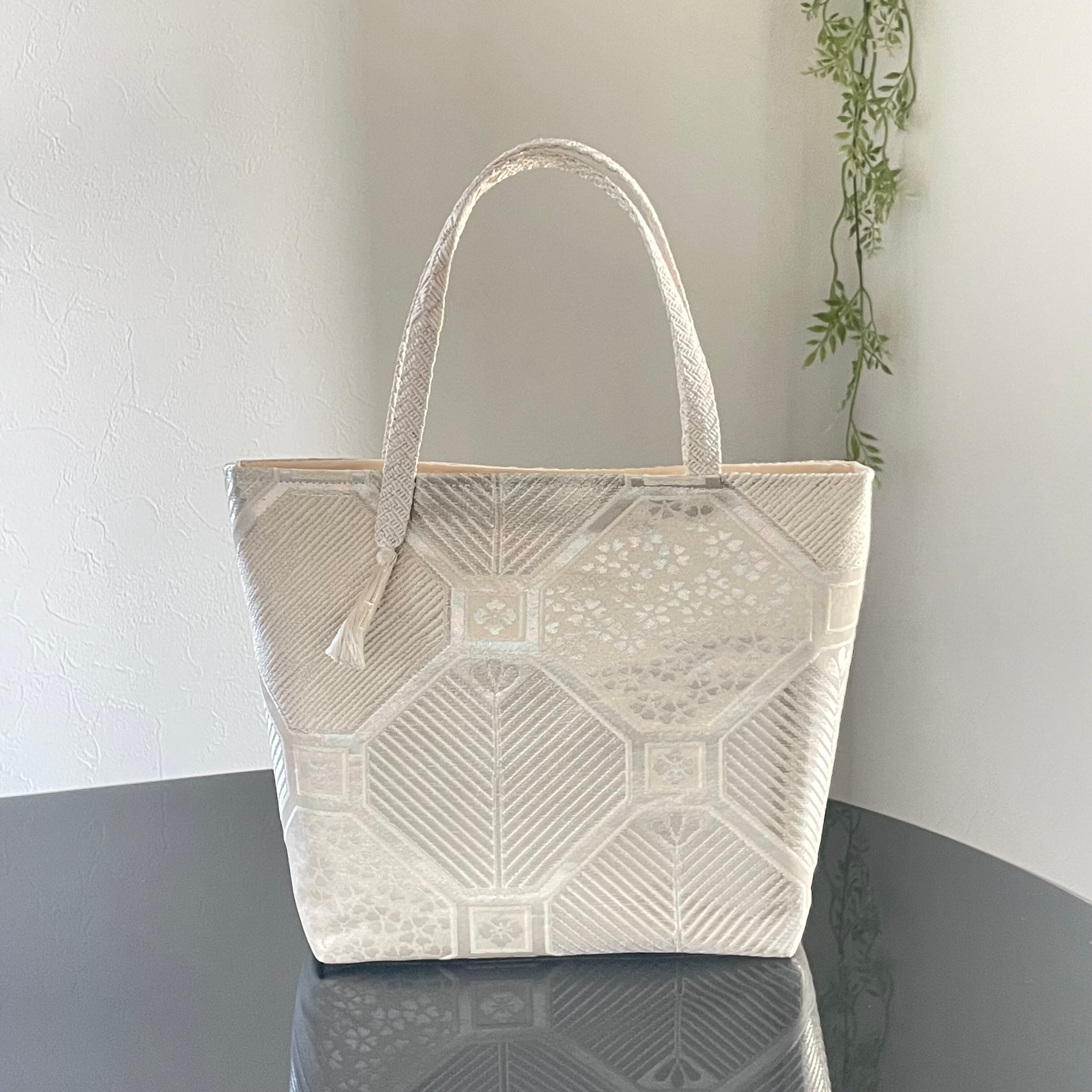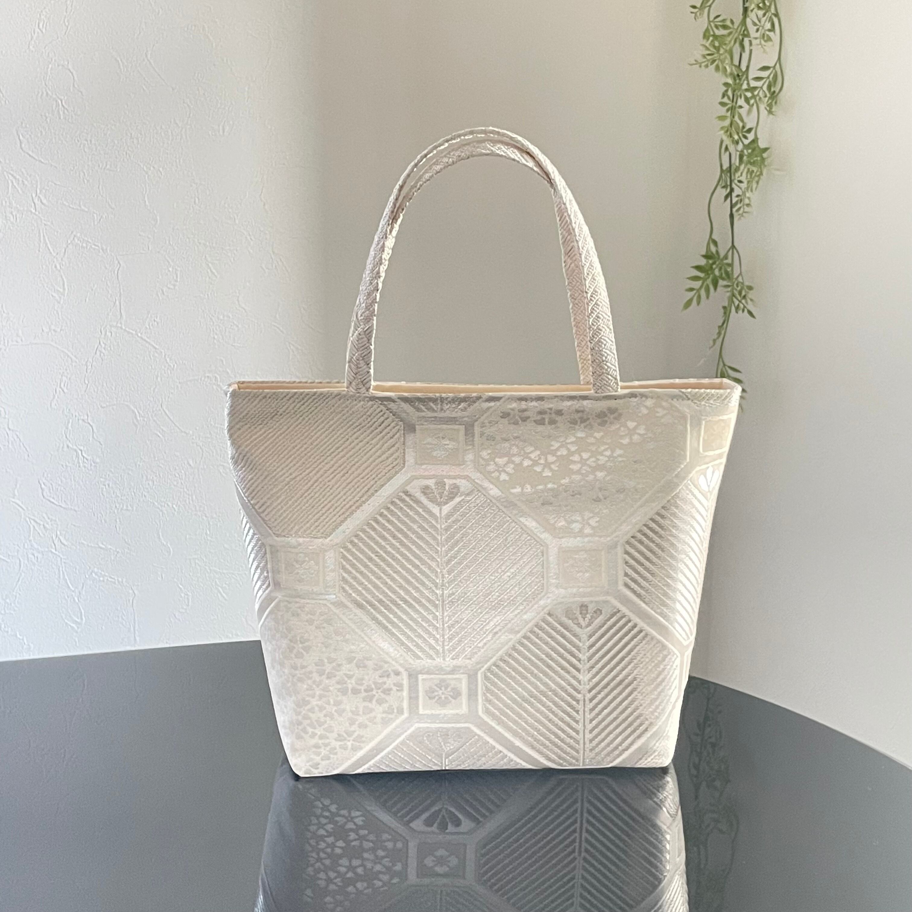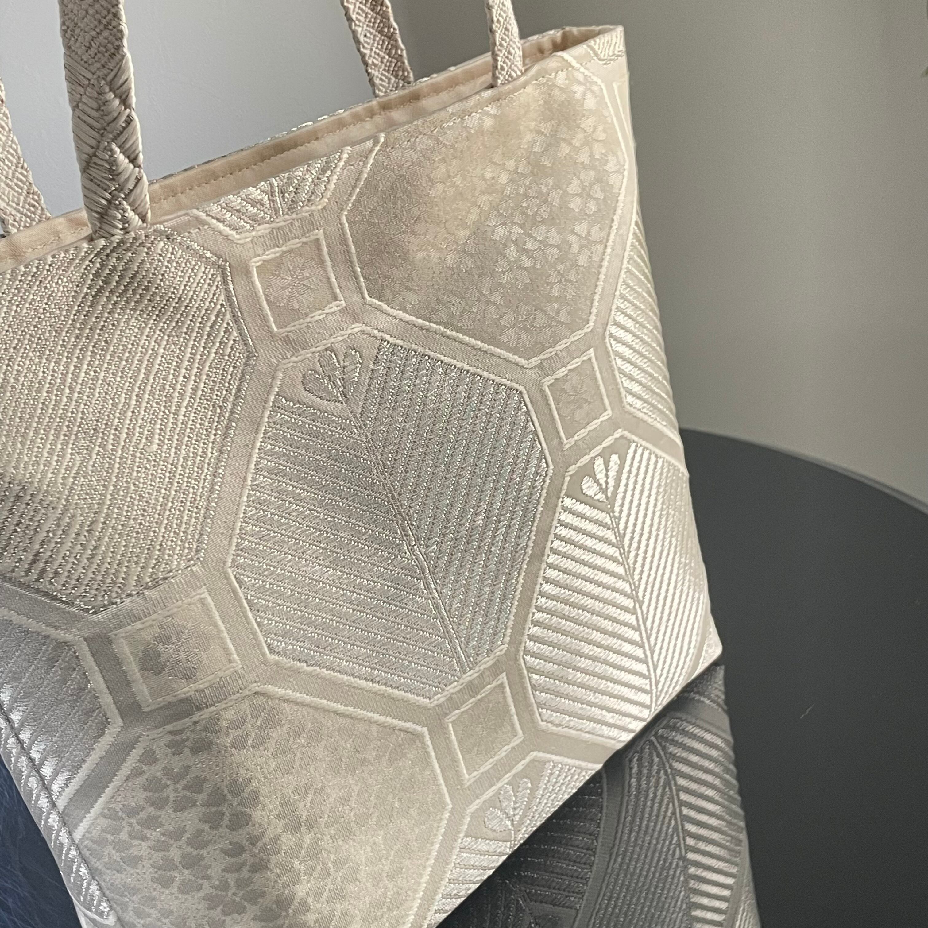 蜀江文様の中に桜、松、松ぼっくりをイメージした柄が織られています。とても美しいシルバーの輝きが上品な、凛とした印象のバッグとなりました。
