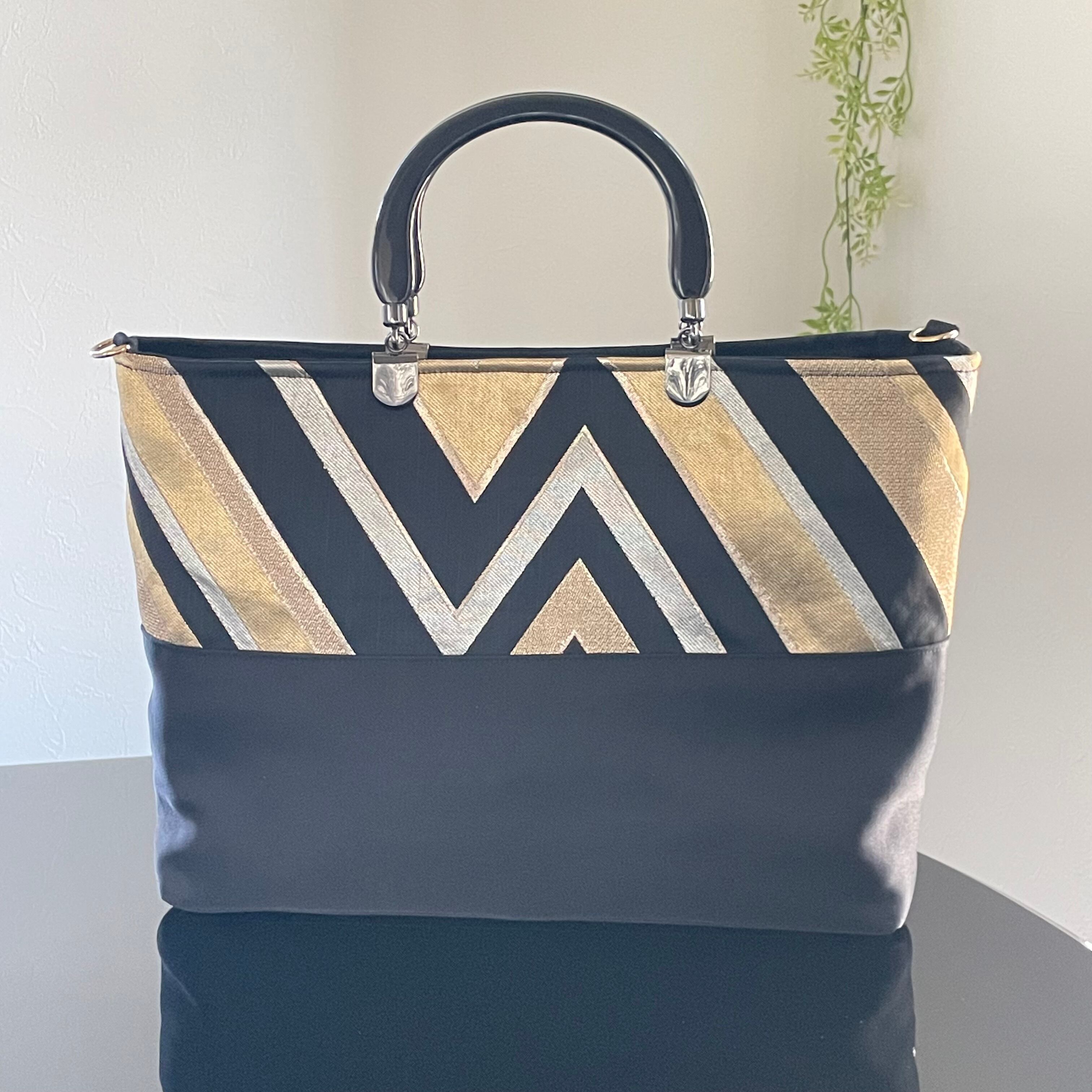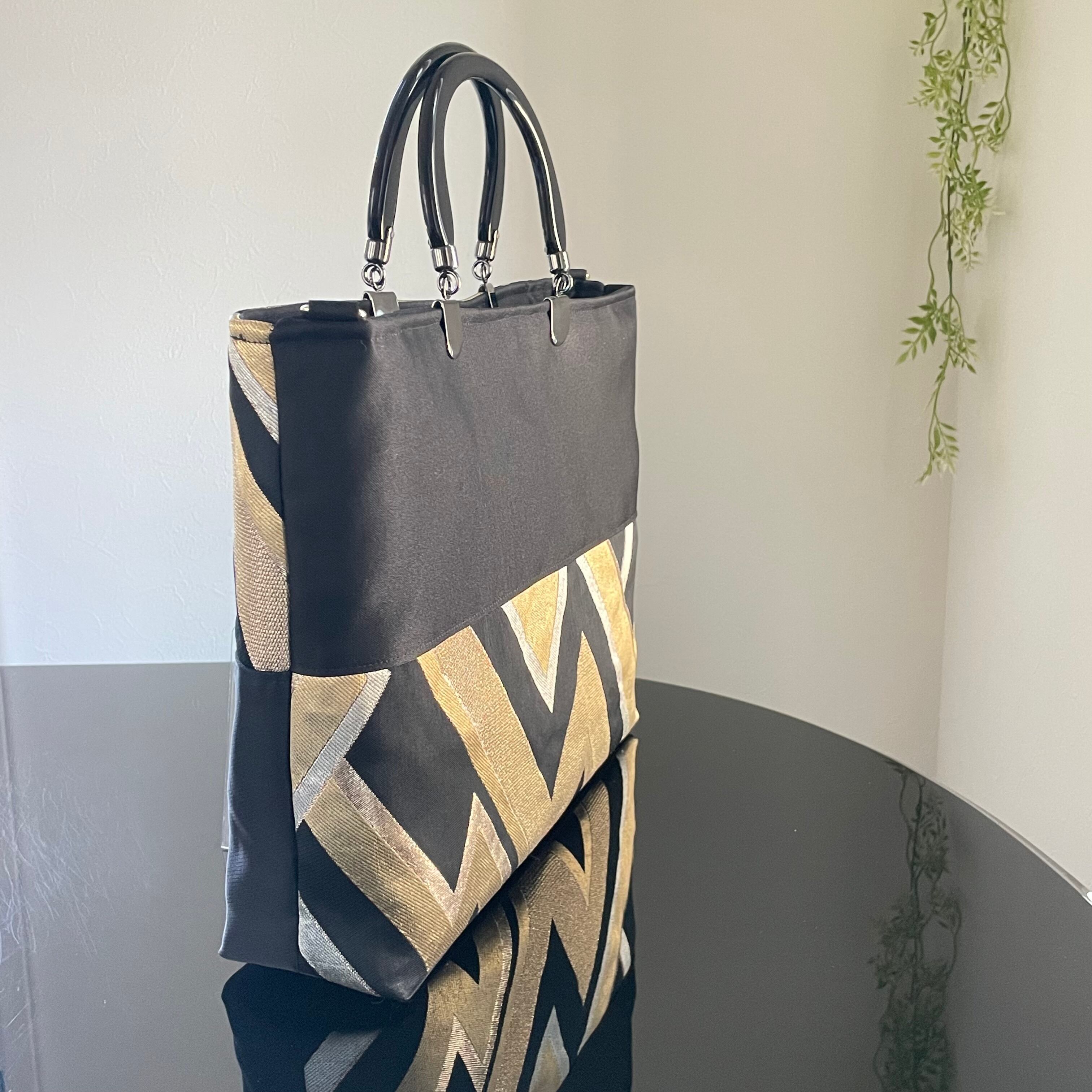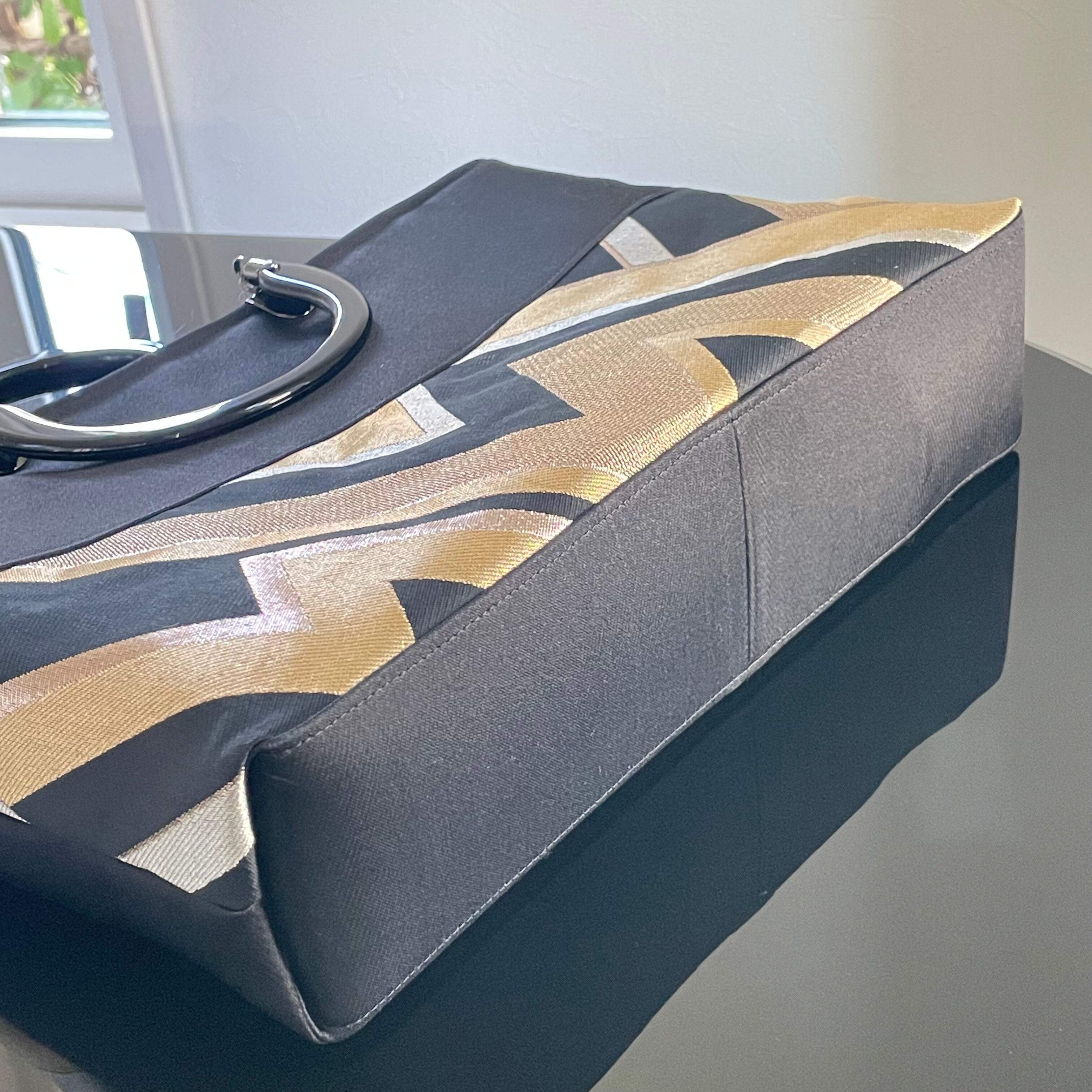 帯リメイクバッグ 黒と金の幾何学文様 トートバッグ A4サイズ 和装バッグ