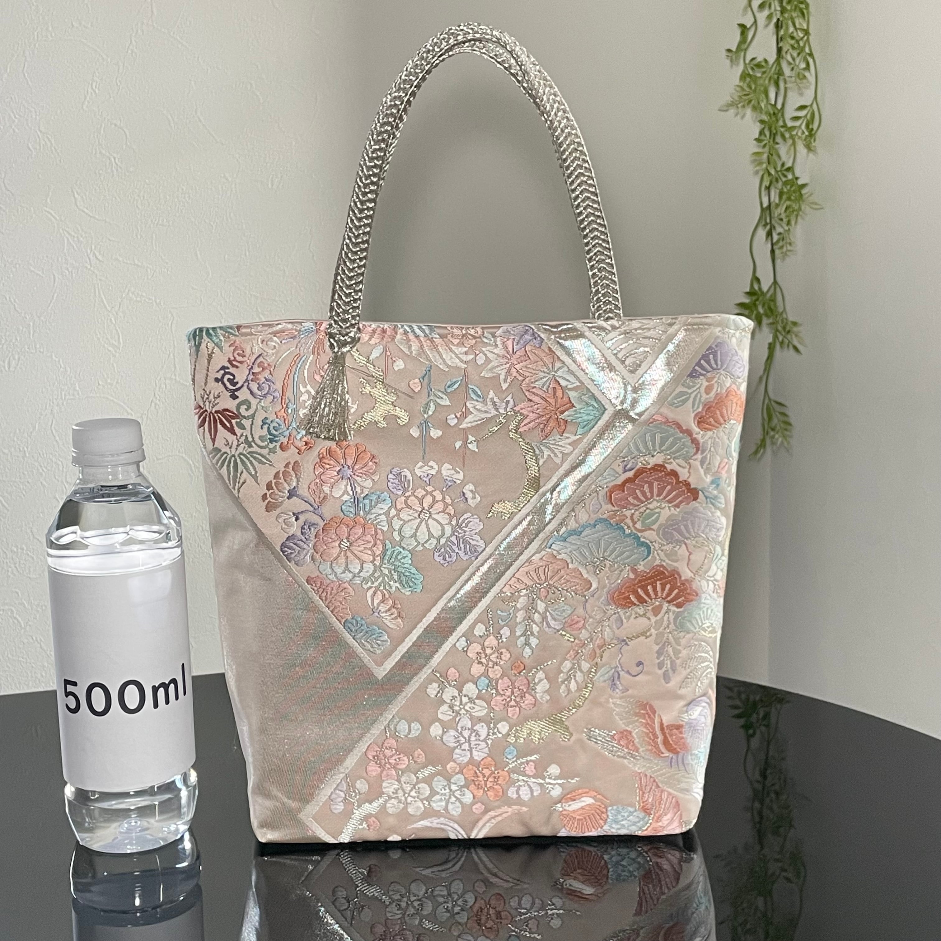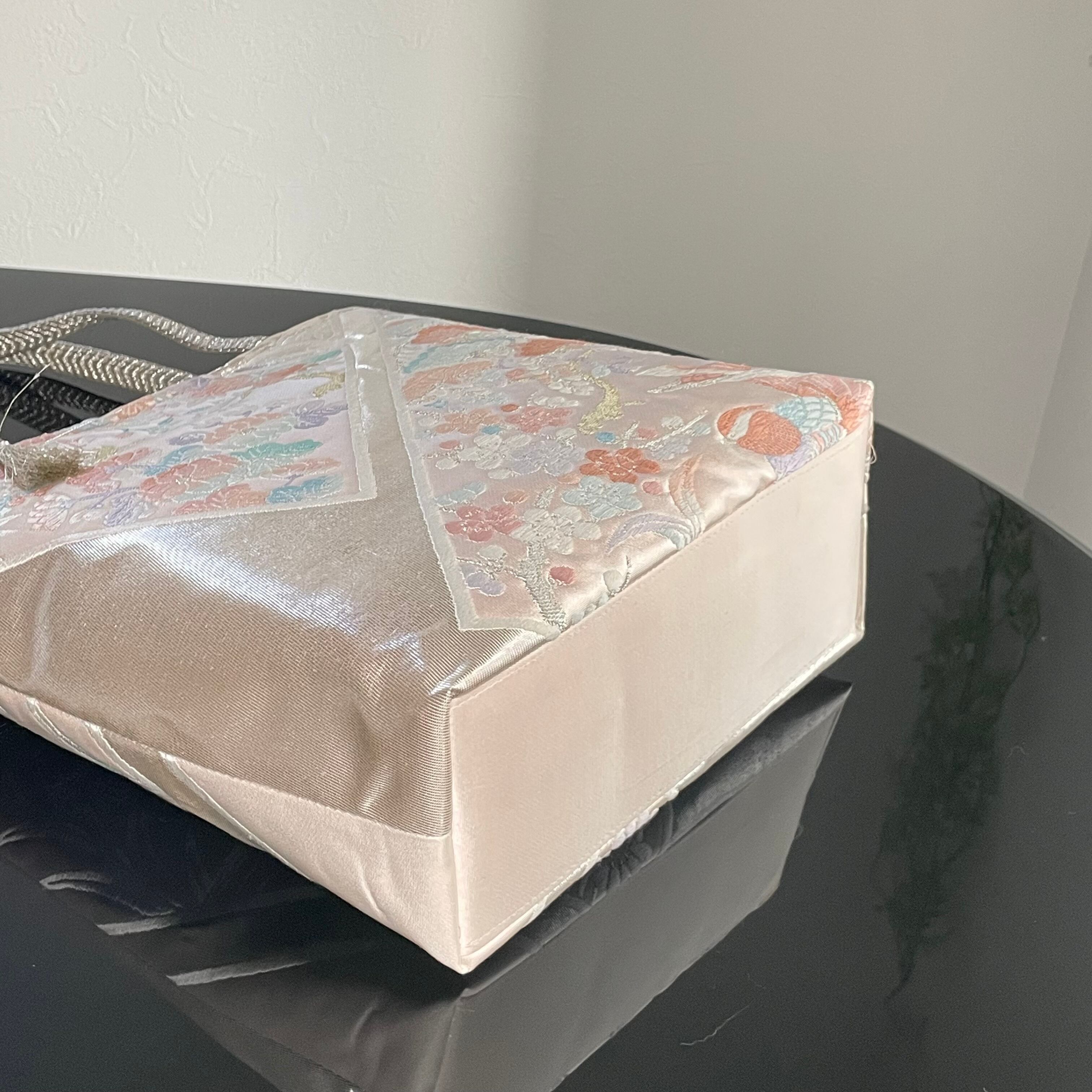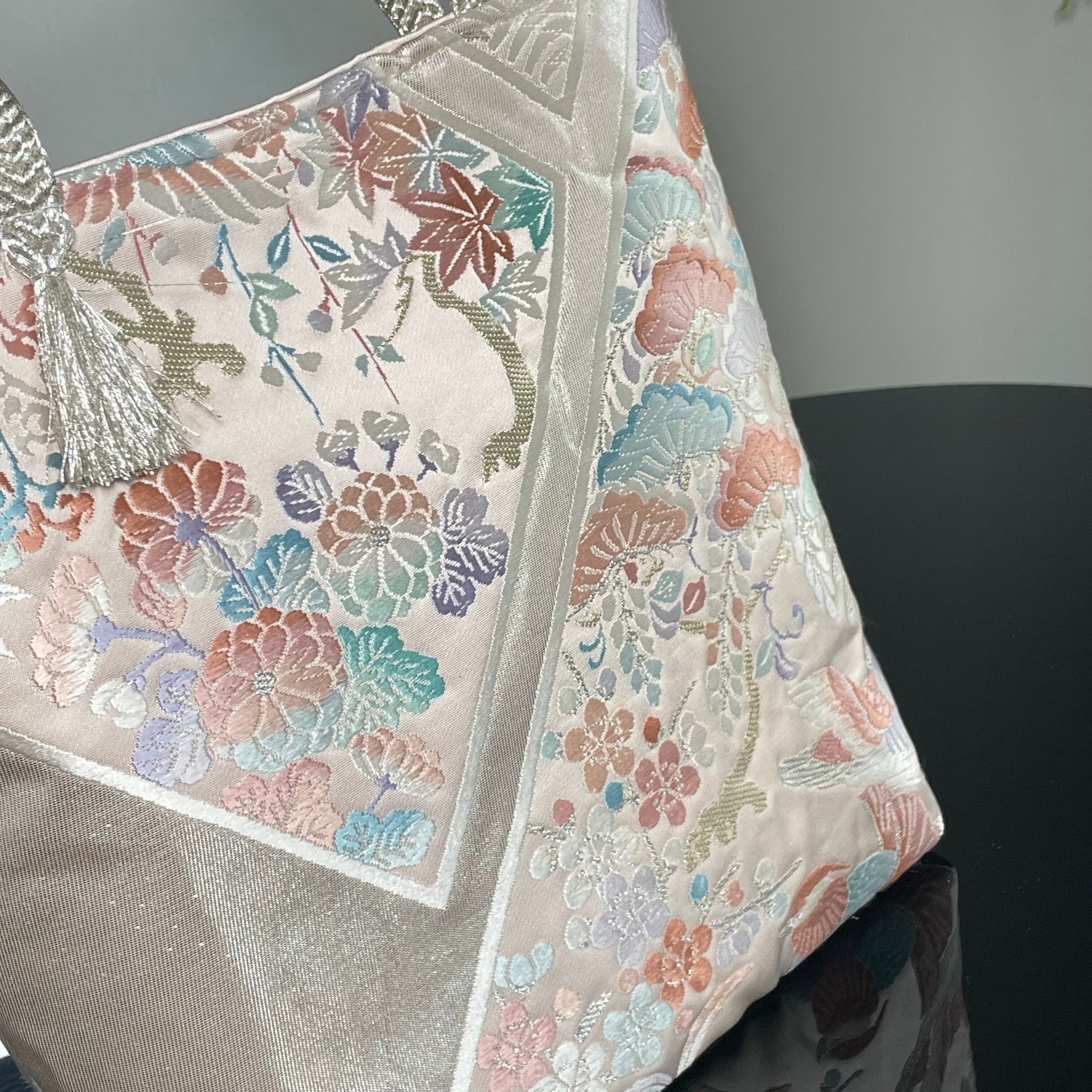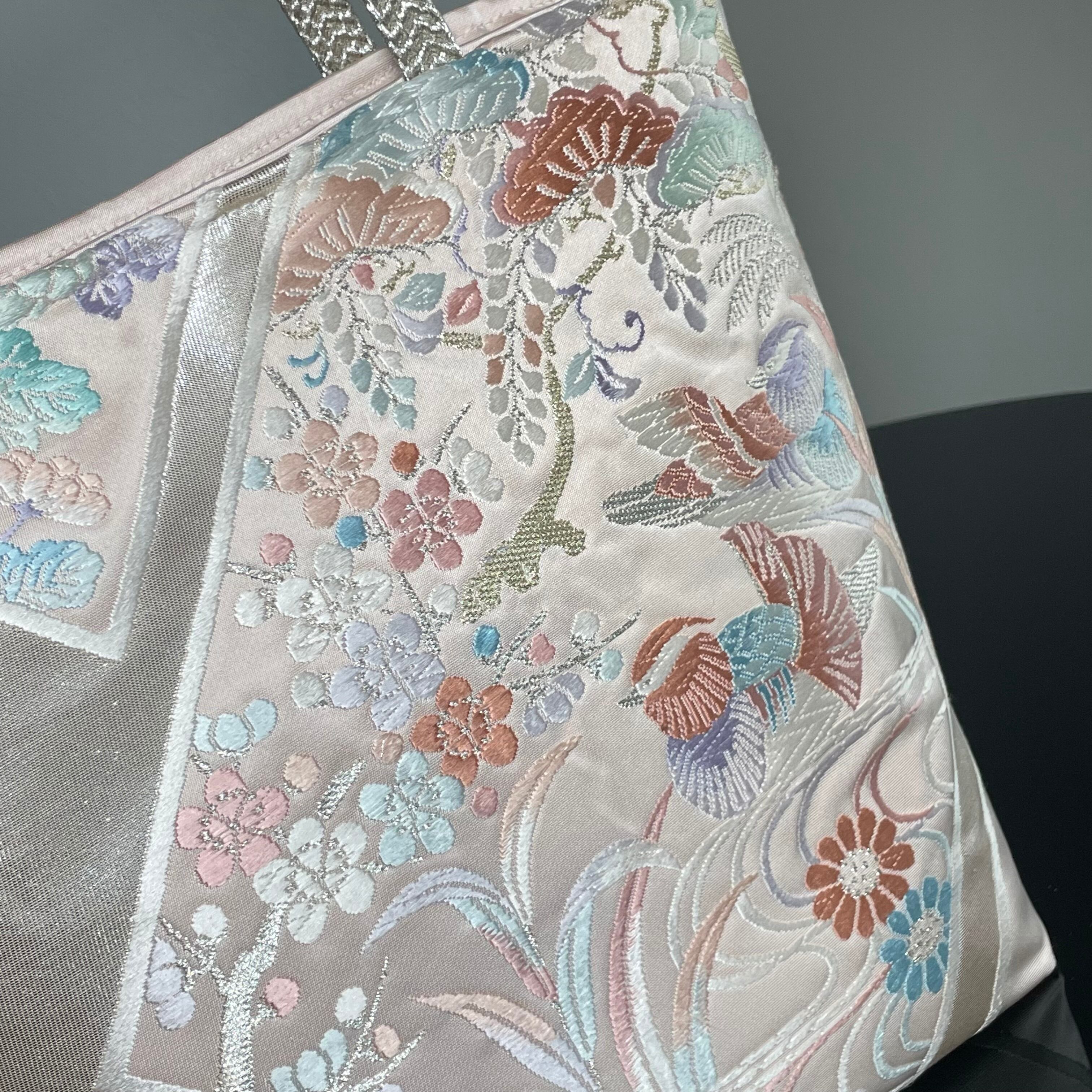 帯リメイクバッグ ピンクにオシドリと花々 B5サイズ 和装バッグ 帯バッグ