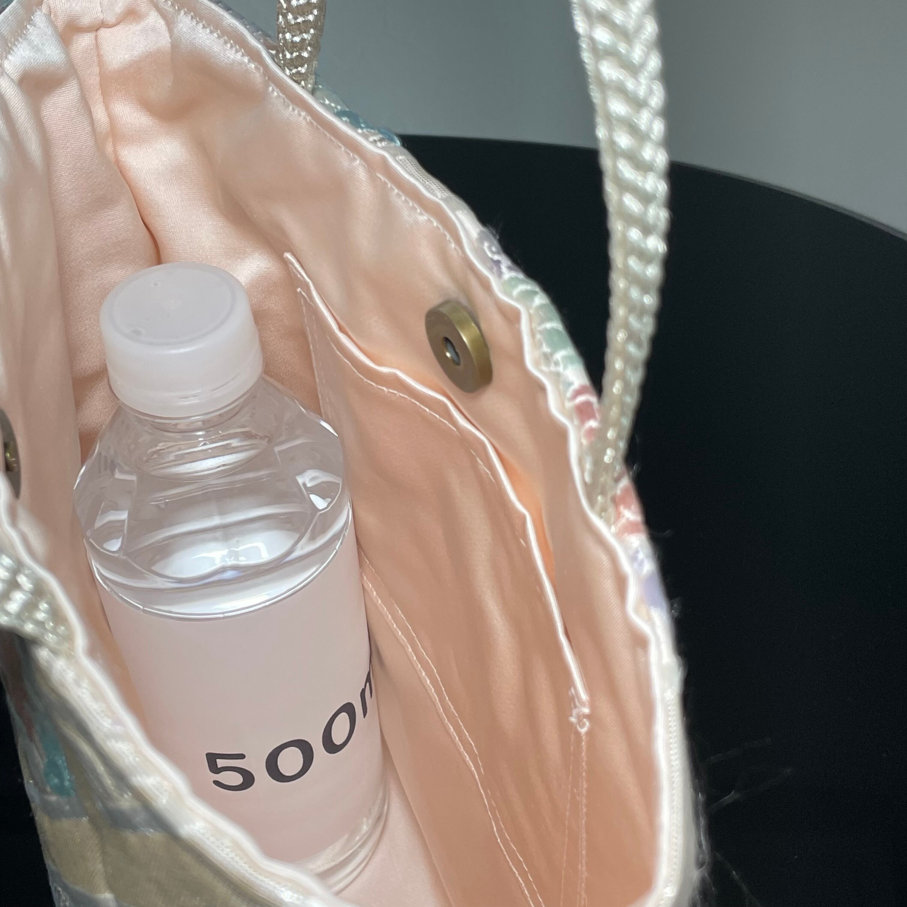 大変に状態の良いリユース帯をリメイ クし、トートバッグを作成いたしました。こちらはB5サイズです。