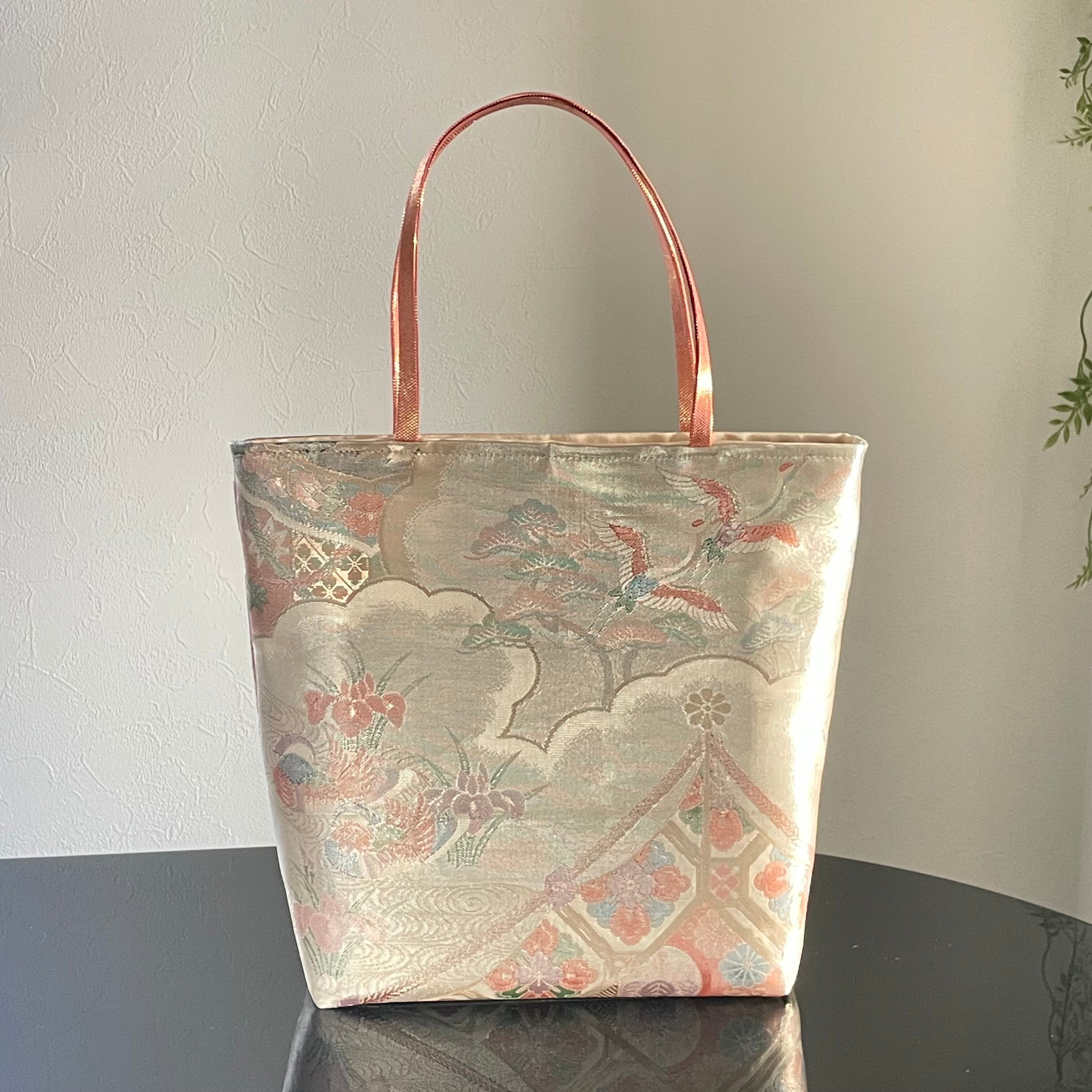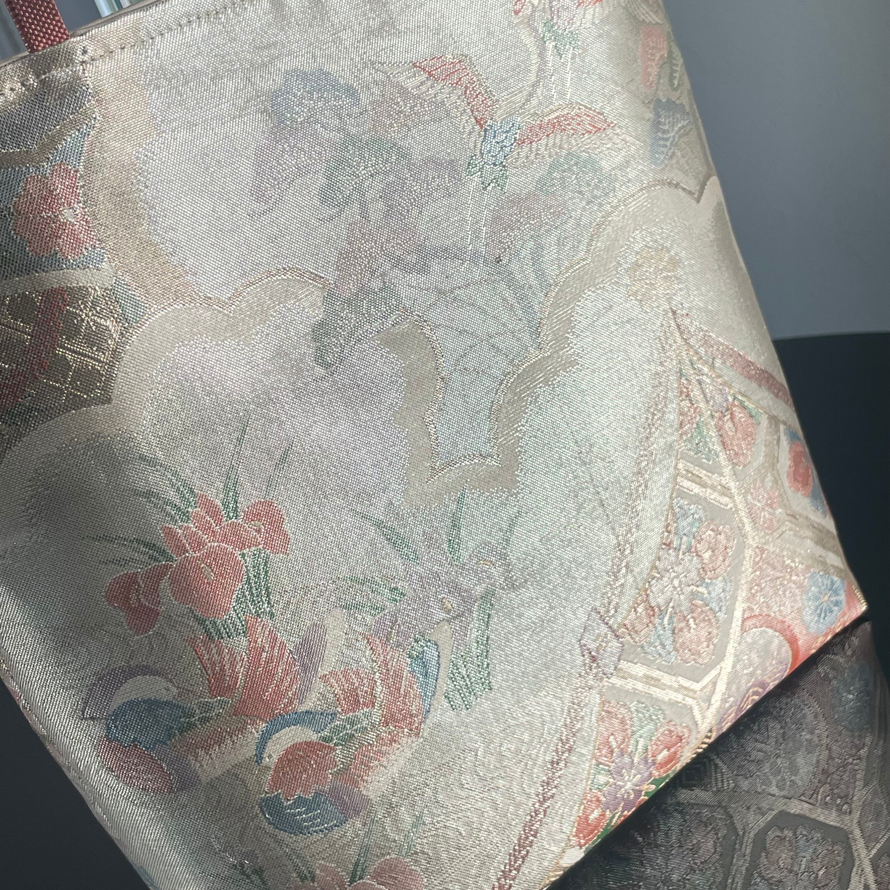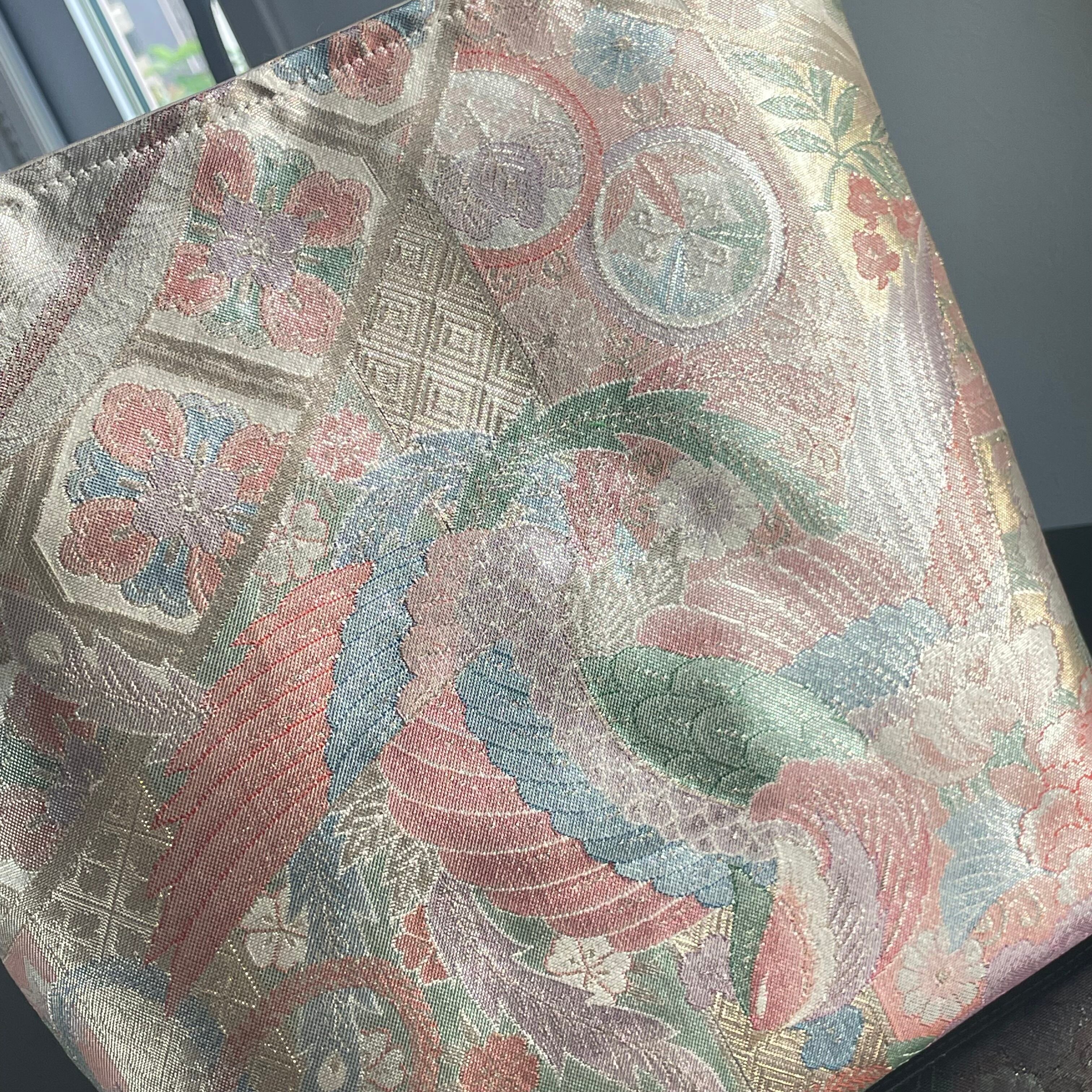 リユースの帯をリメイクして、トートバッグを作成いたしました。こちらはB5サイズ、一点物です。