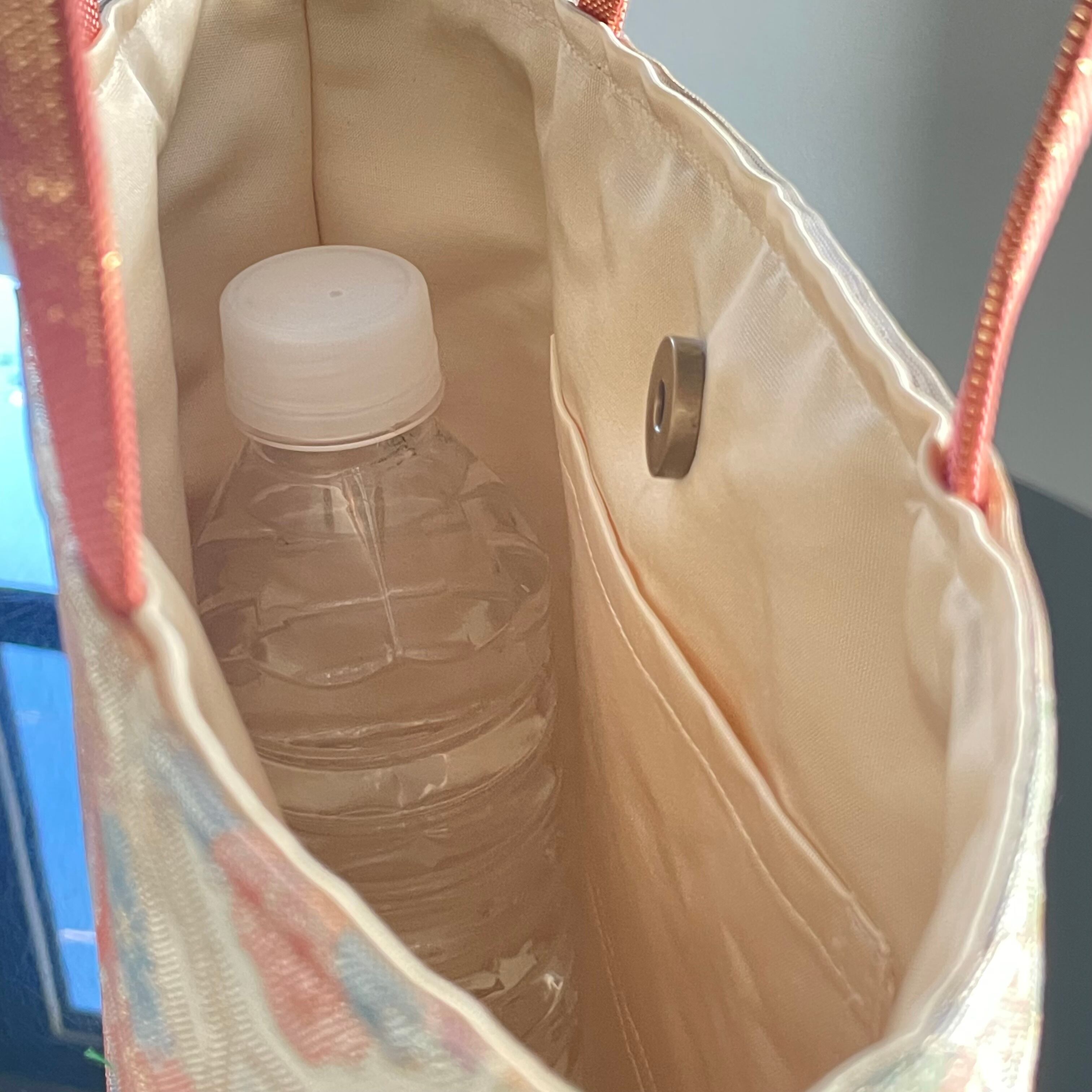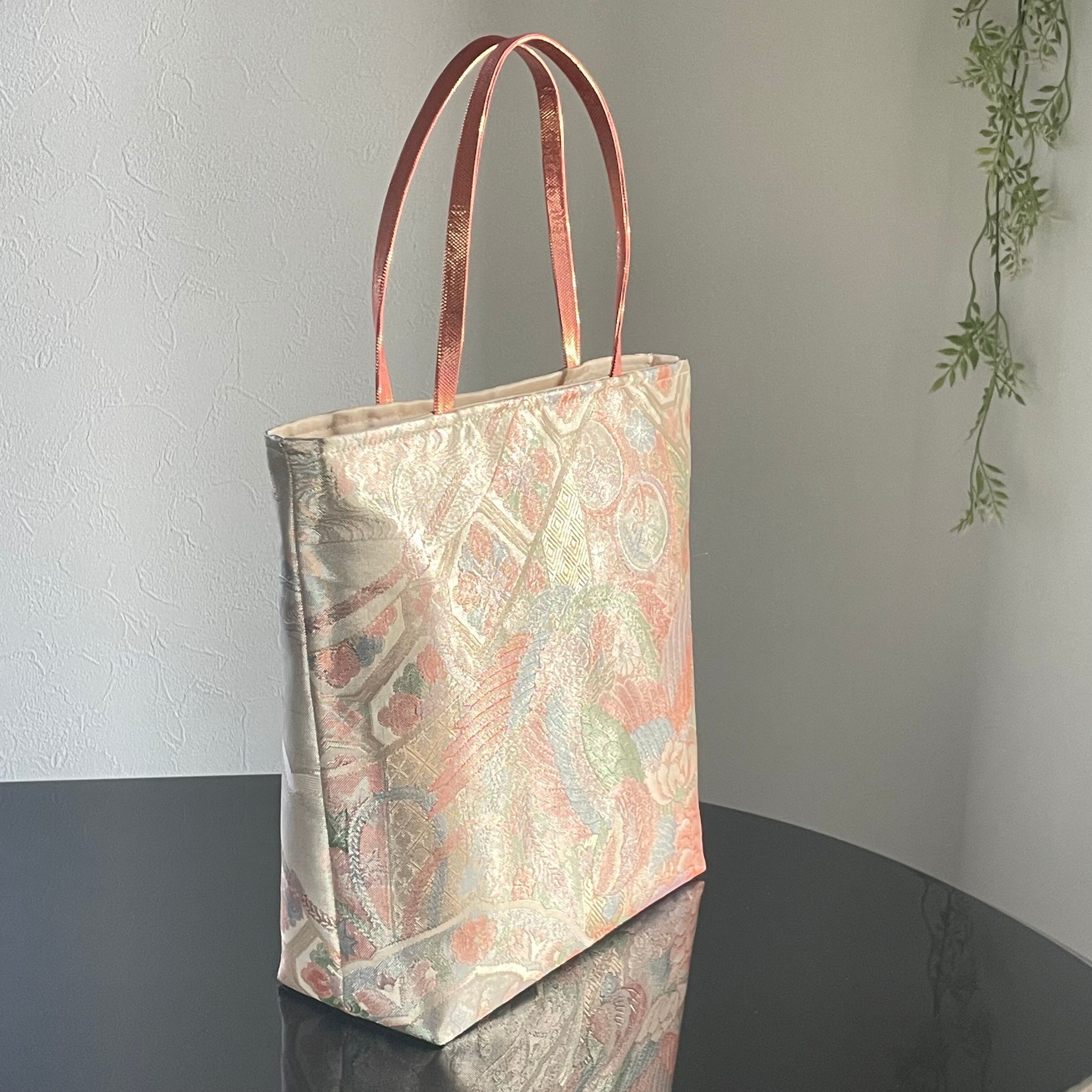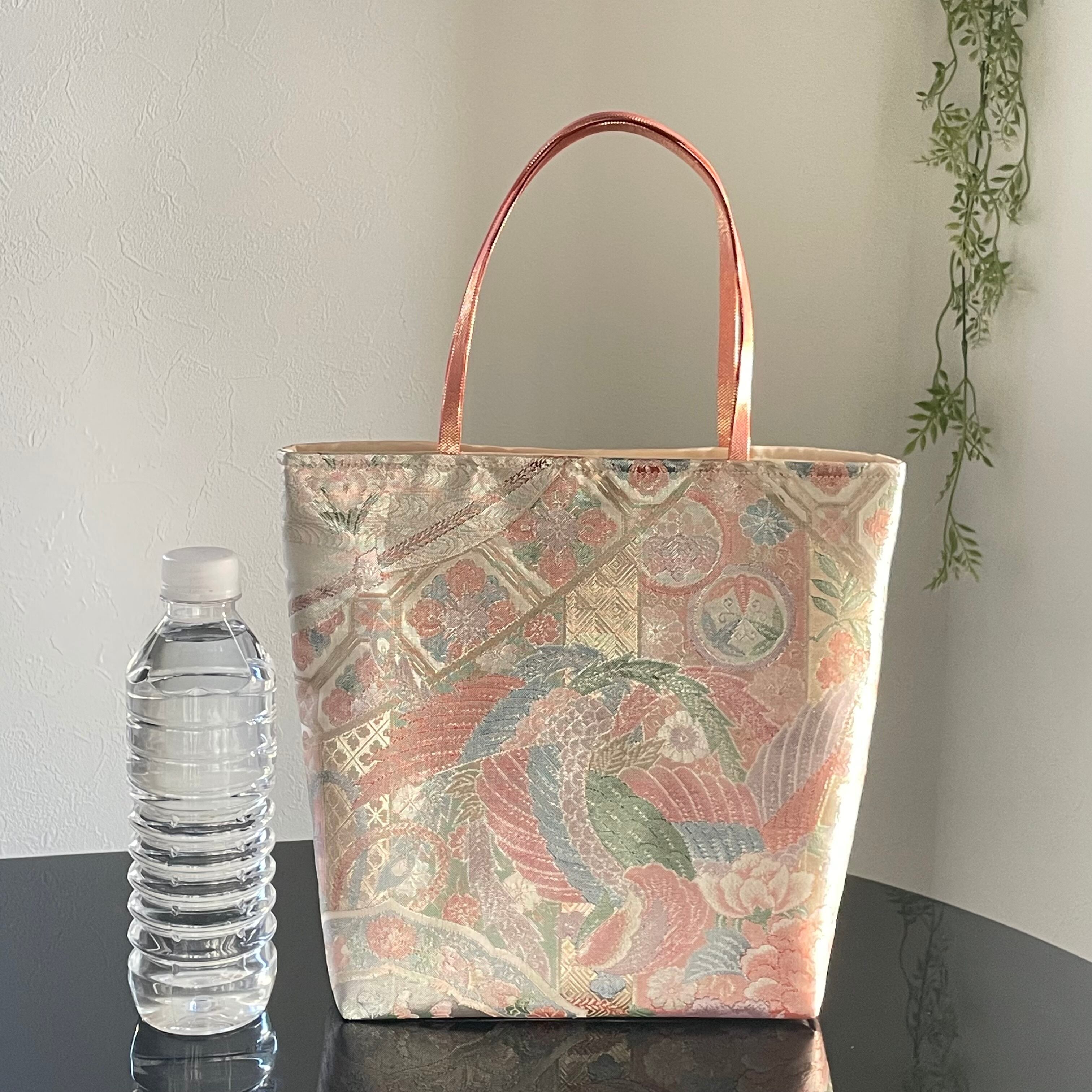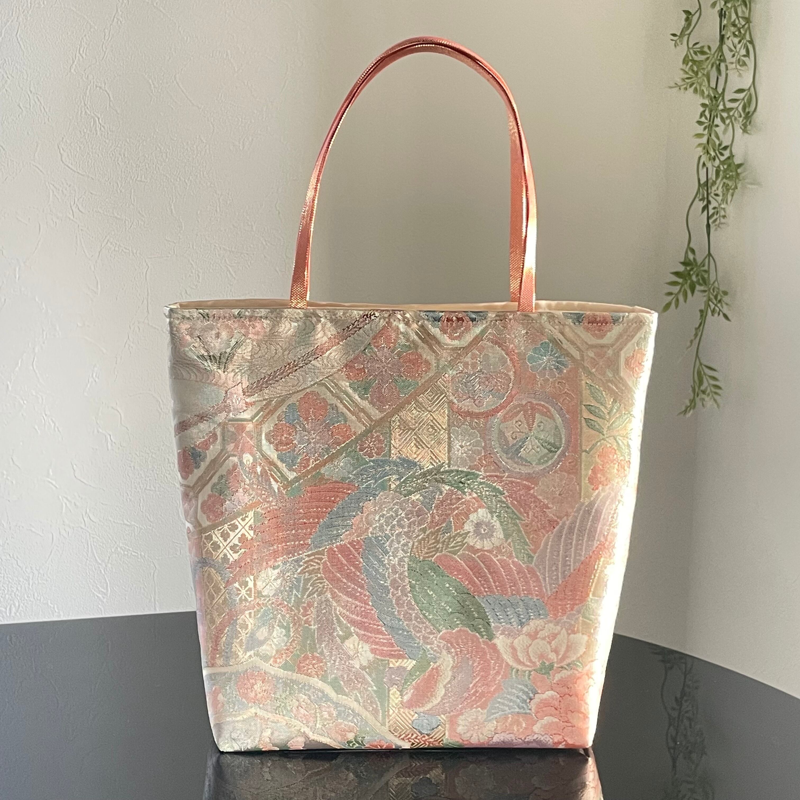 リユースの帯をリメイクして、トートバッグを作成いたしました。こちらはB5サイズ、一点物です。