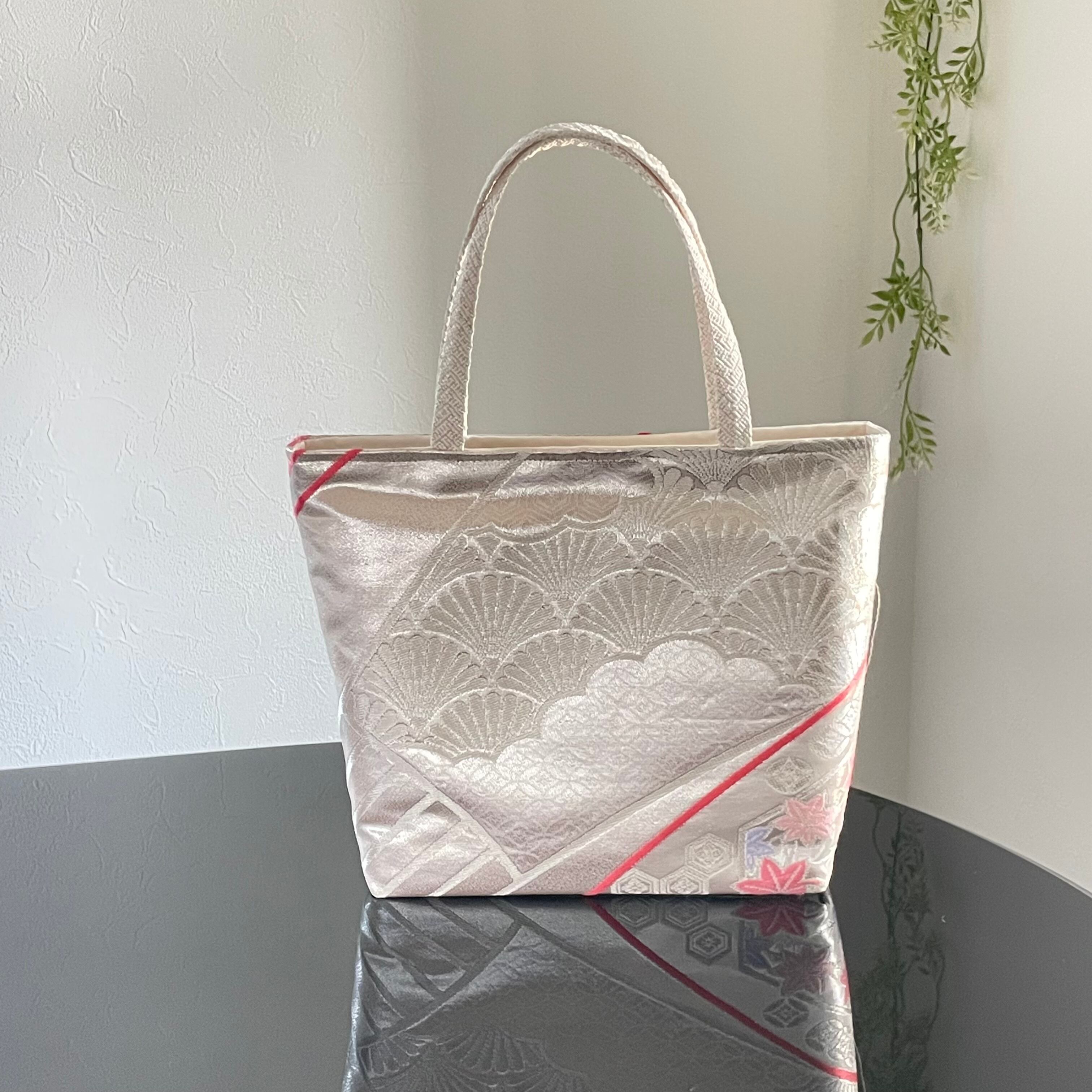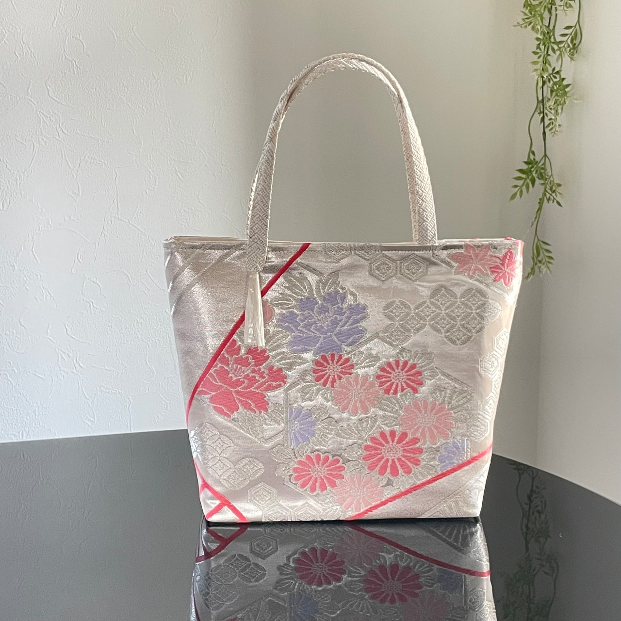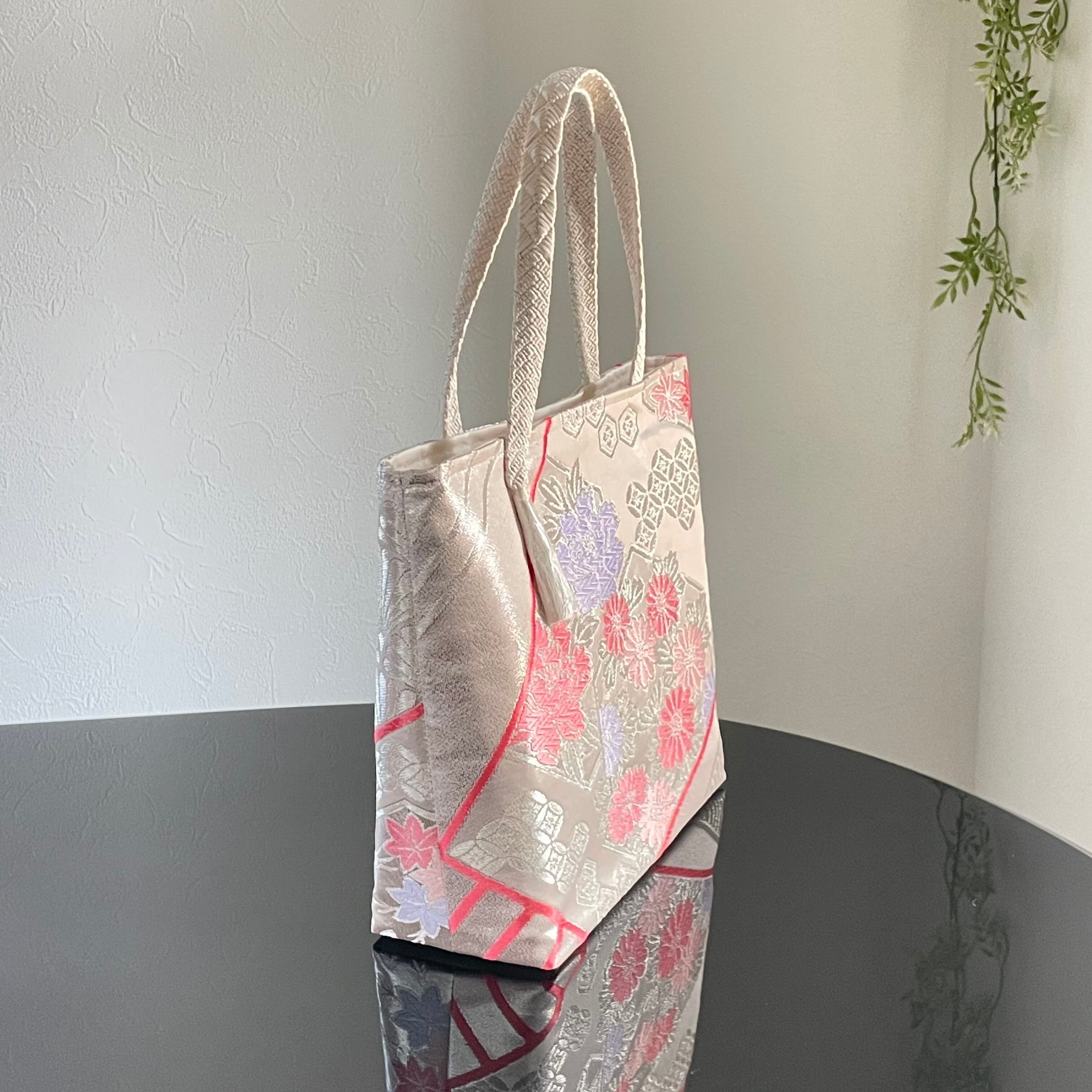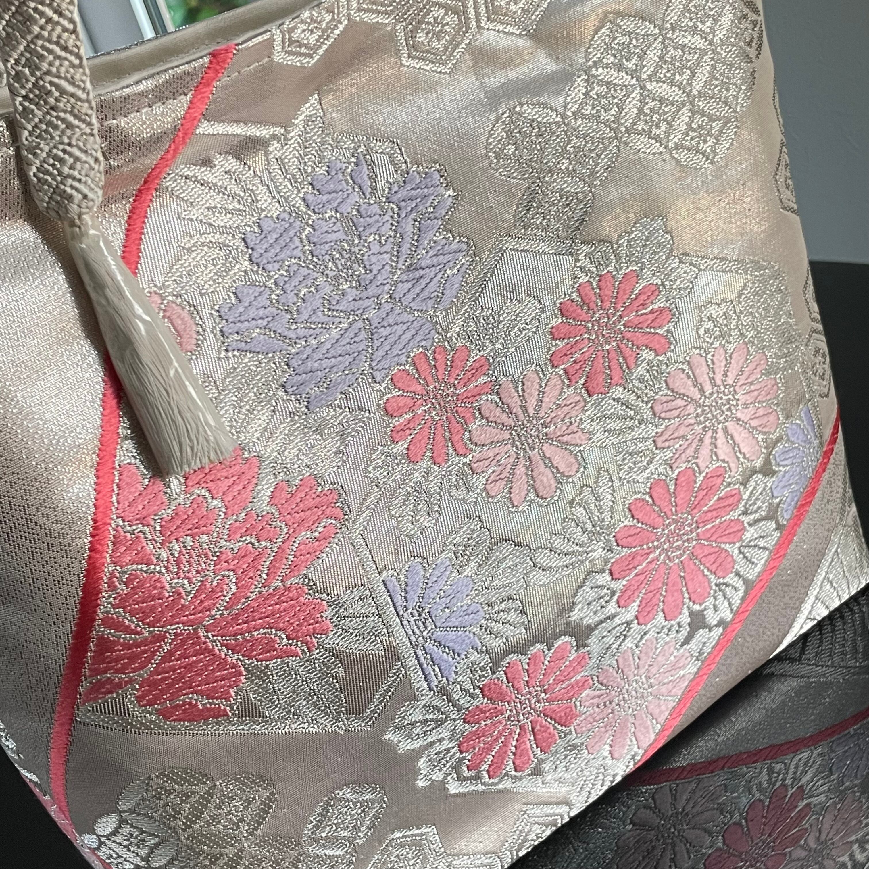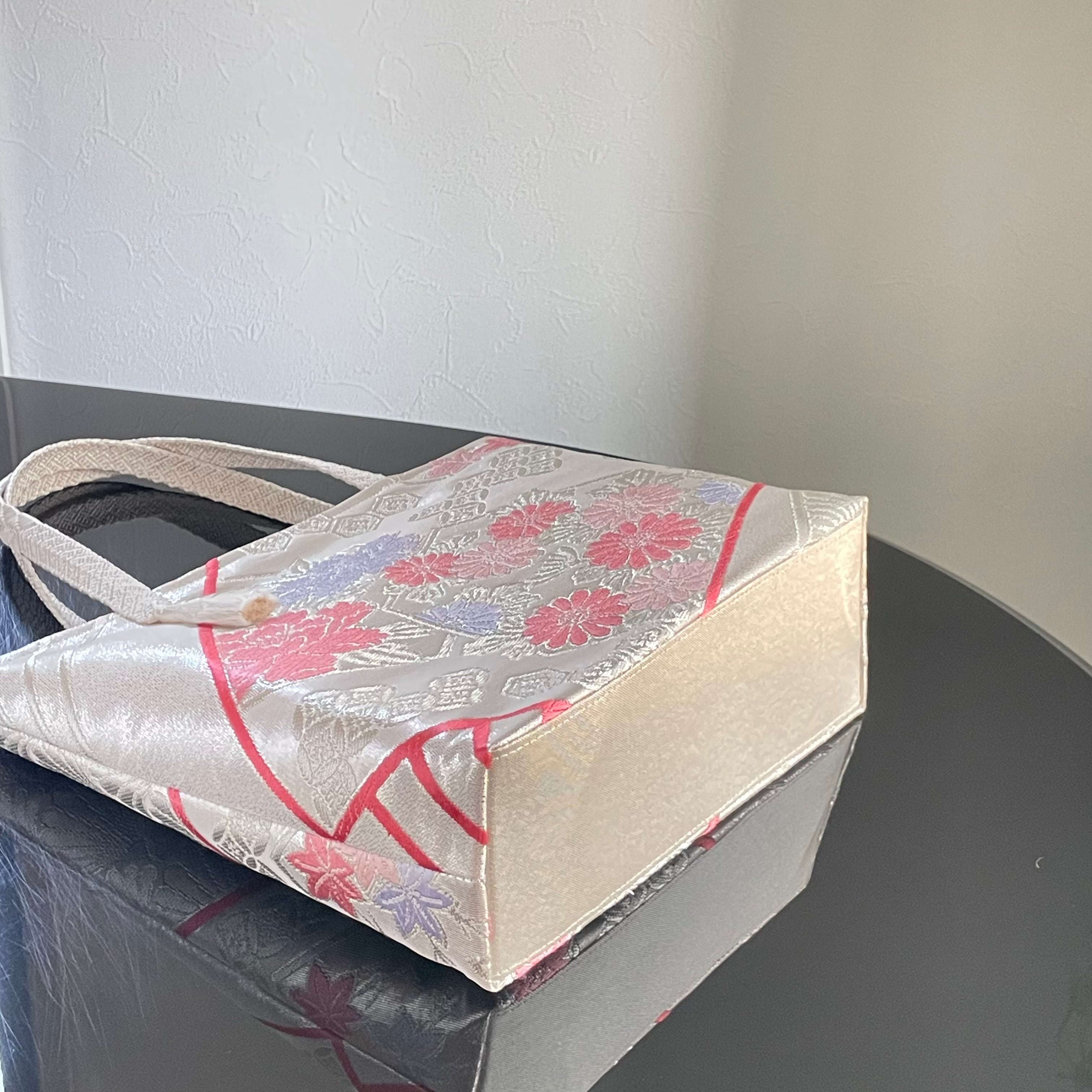 帯リメイクバッグ ピンクの扇面に花 トートバッグ Mサイズ 和装バッグ