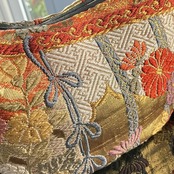 平安時代を彷彿とさせる几帳の柄を織った帯からのリメイクです。几帳(きちょう)は、平安時代以降公家の邸宅に使われた、二本のT字型の柱に薄絹を下げた間仕切りの一種です。