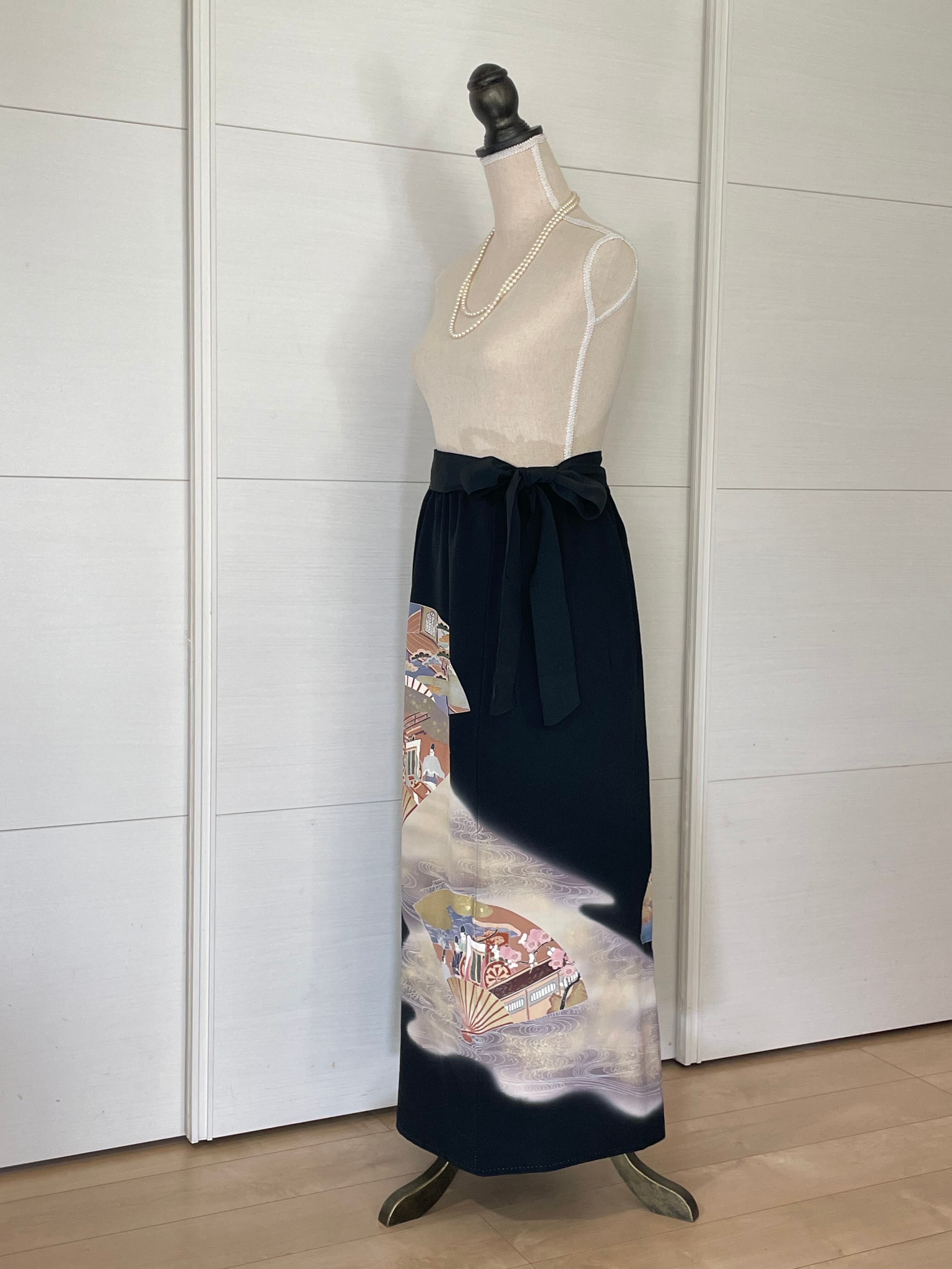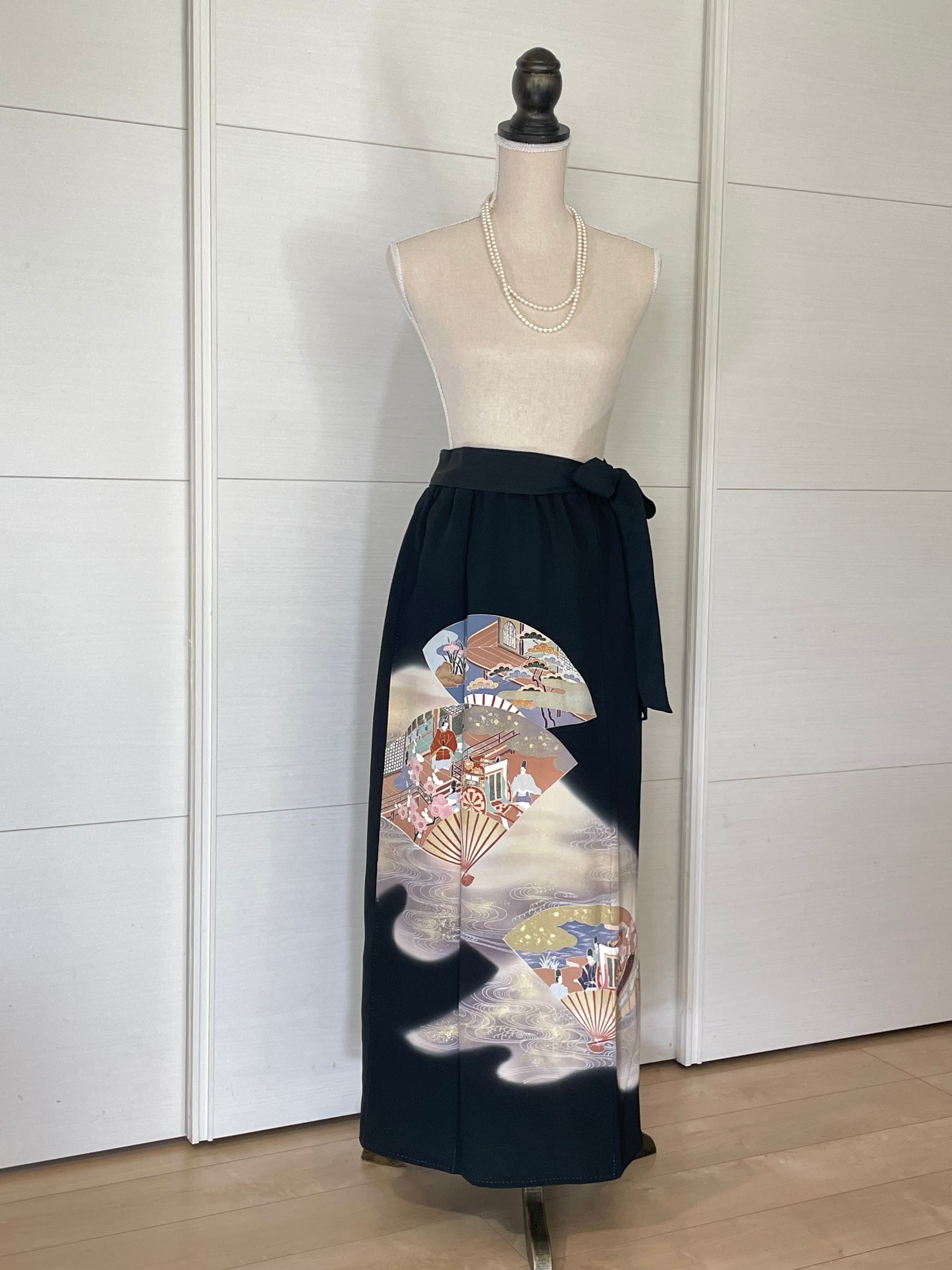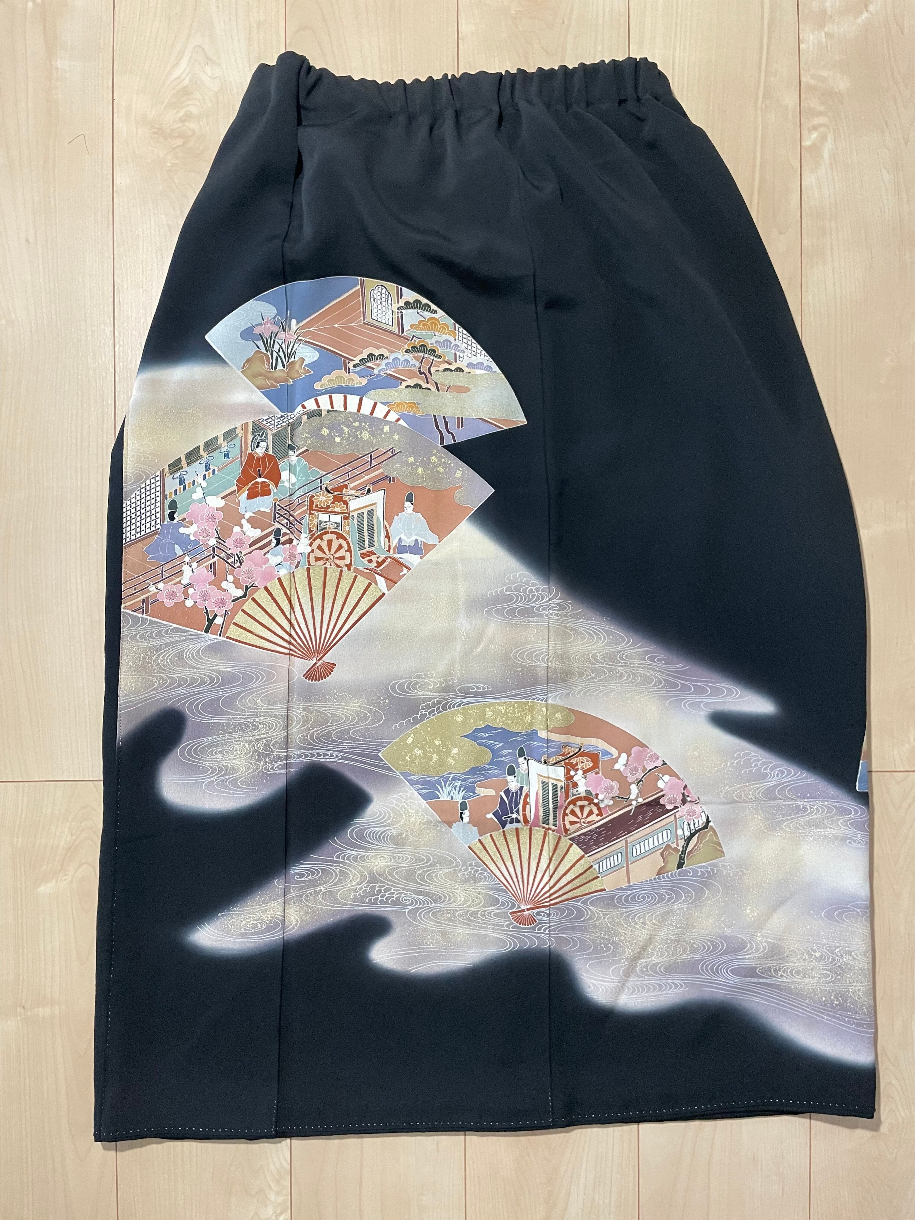 黒留袖リメイク 扇面に平安貴族 ロングスカート 正絹 フリーサイズ 大きなサイズ
