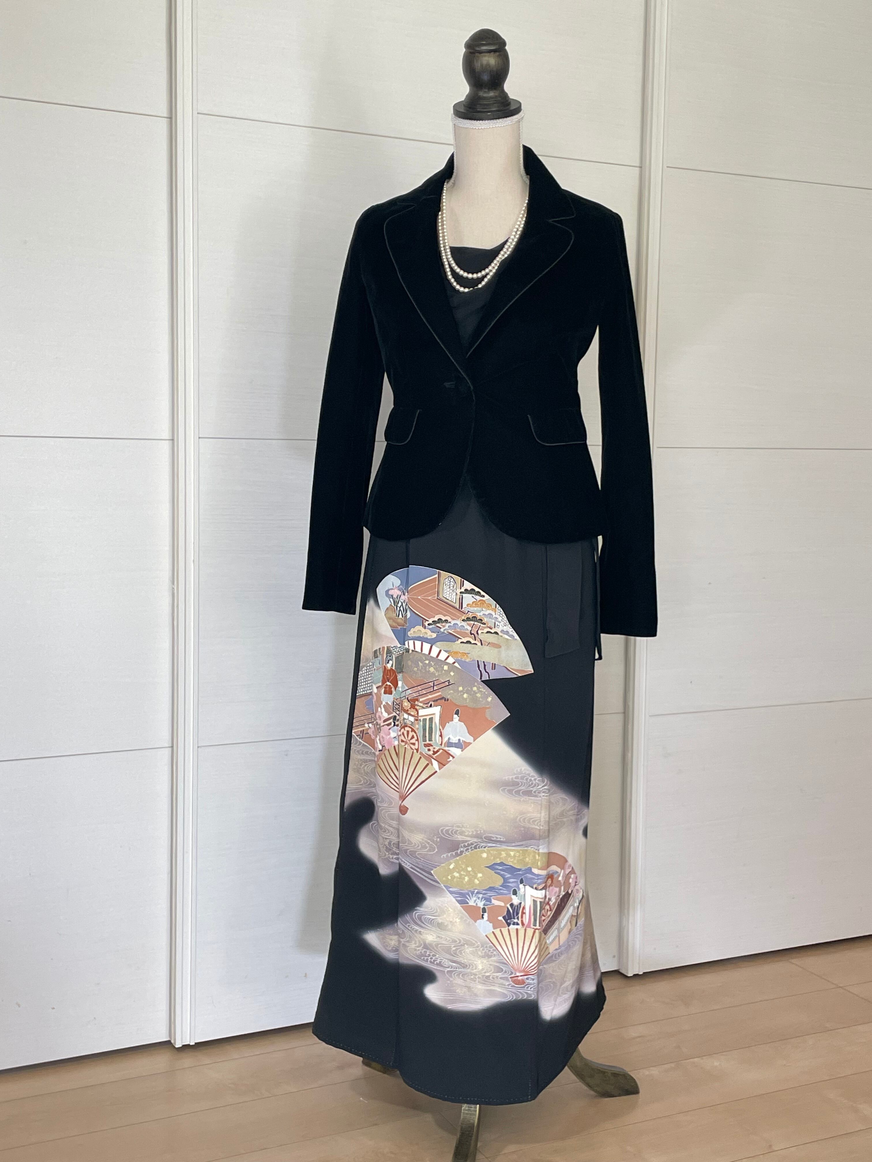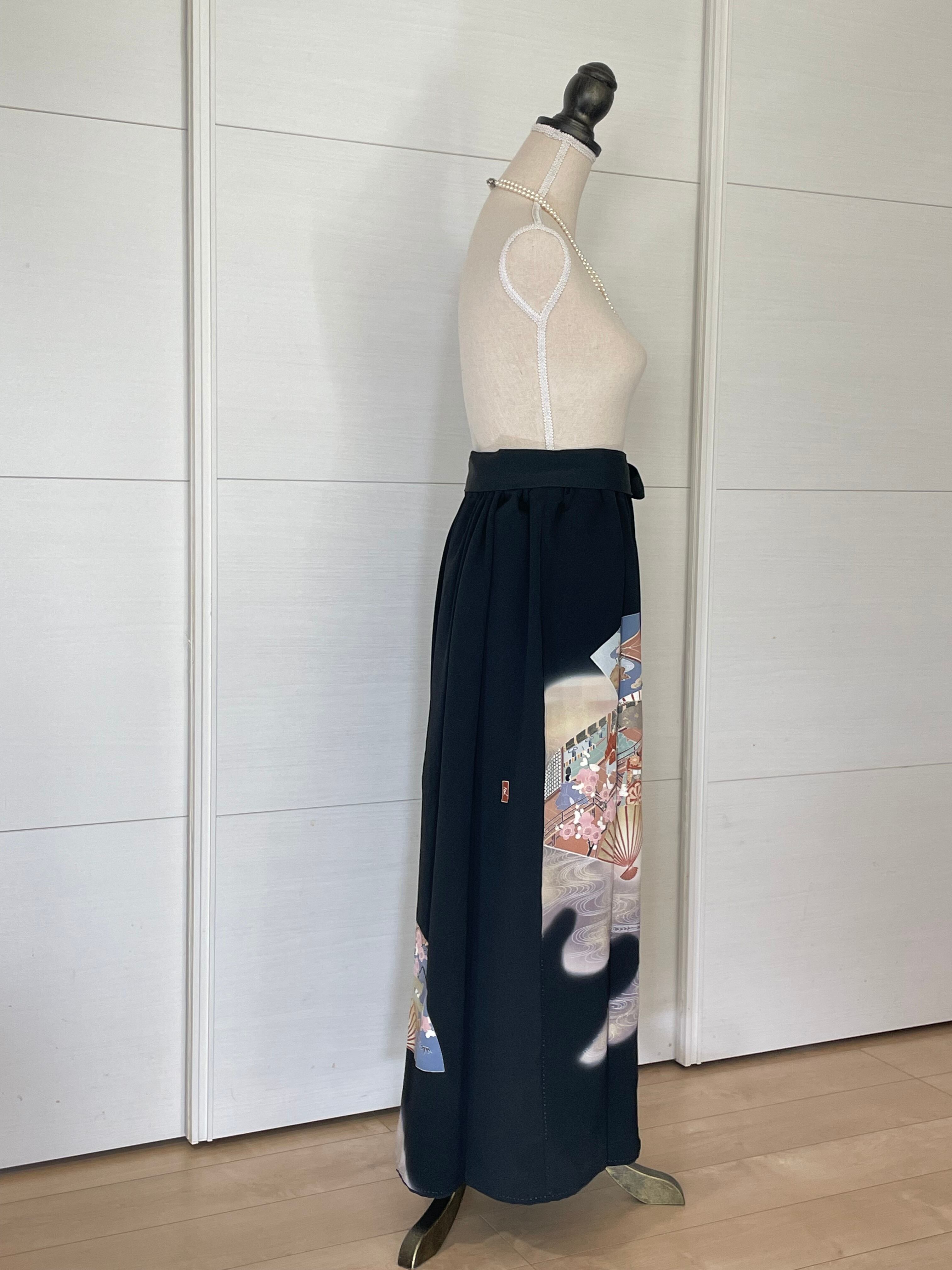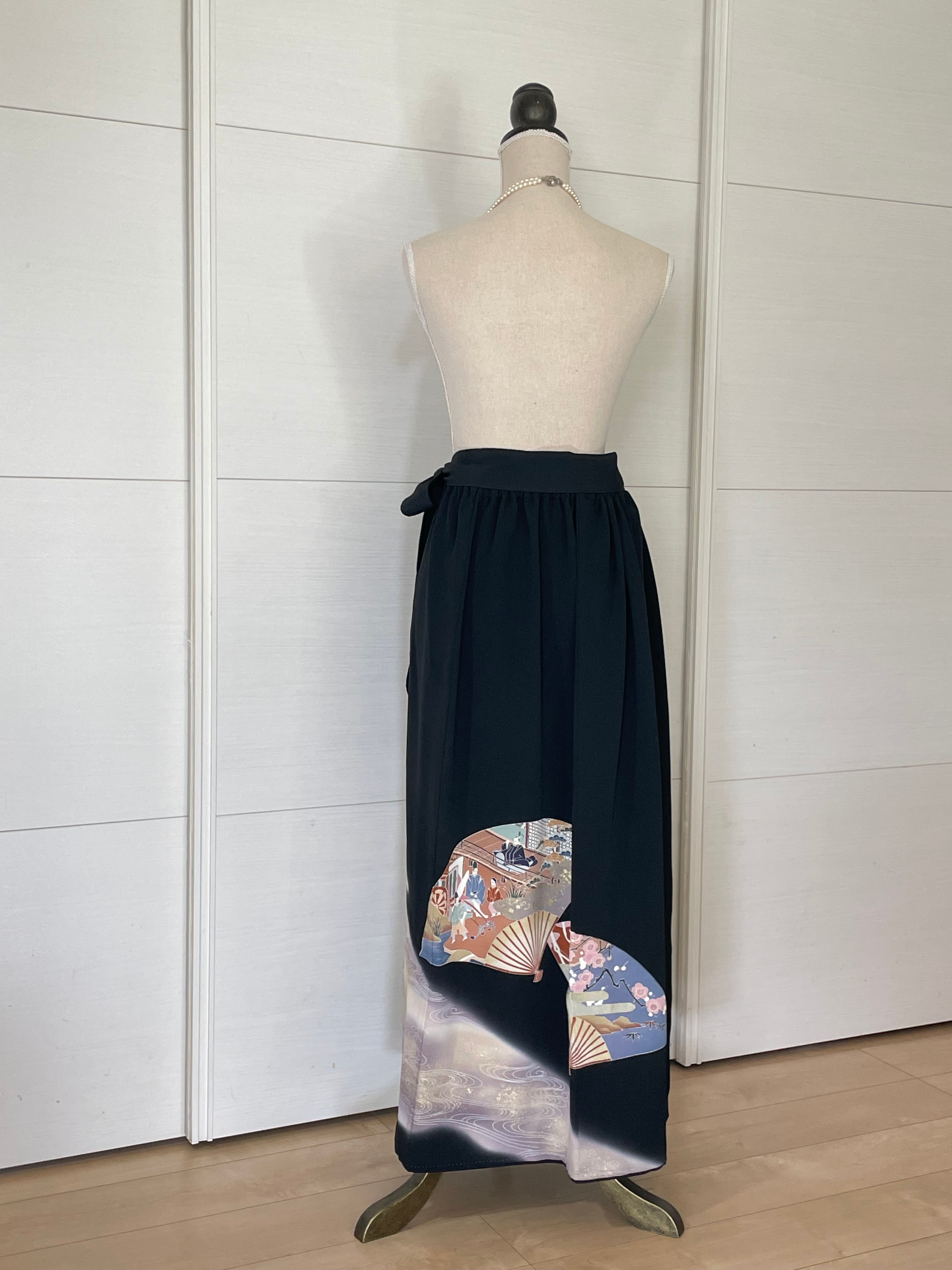 黒留袖リメイク 扇面に平安貴族 ロングスカート 正絹 フリーサイズ 大きなサイズ