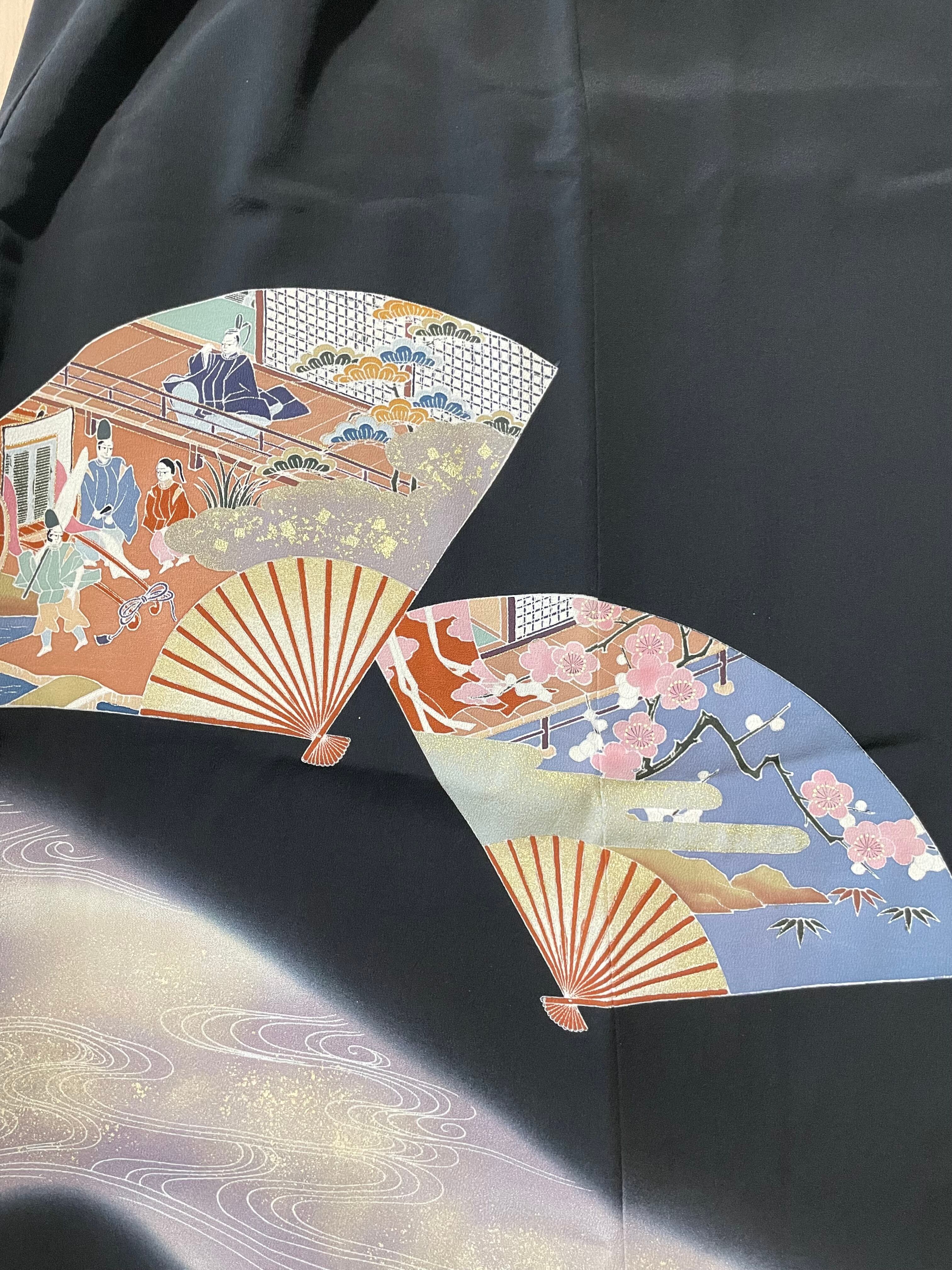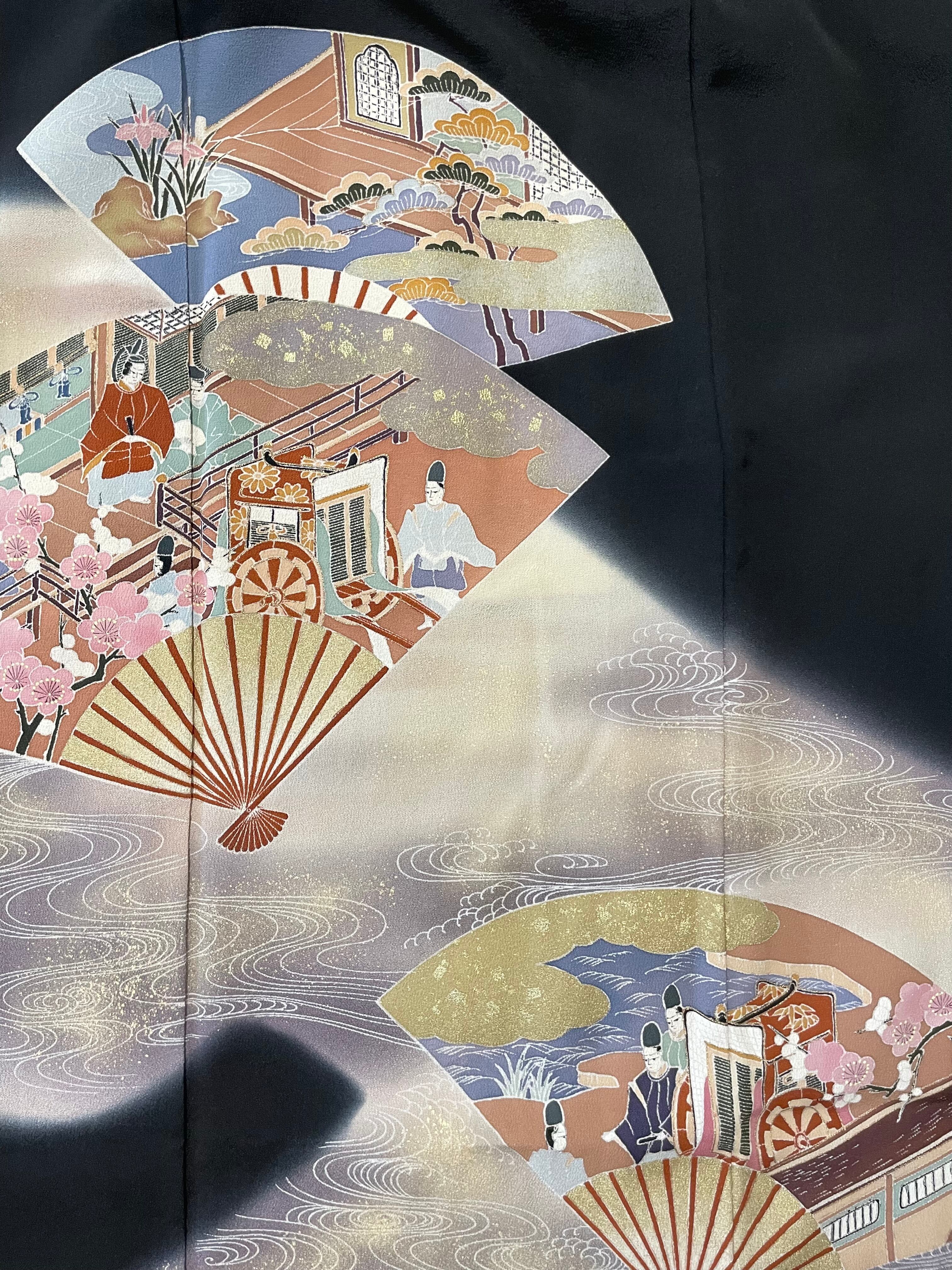 大きな扇面に平安貴族の暮らしが表現されています。寝殿造りや調度品、御所車。貴族たちの会話が聞こえてくるような文様です。雅な世界に誘われ、現実の世界から逸脱しそうな雰囲気の黒留袖からのリメイクです。