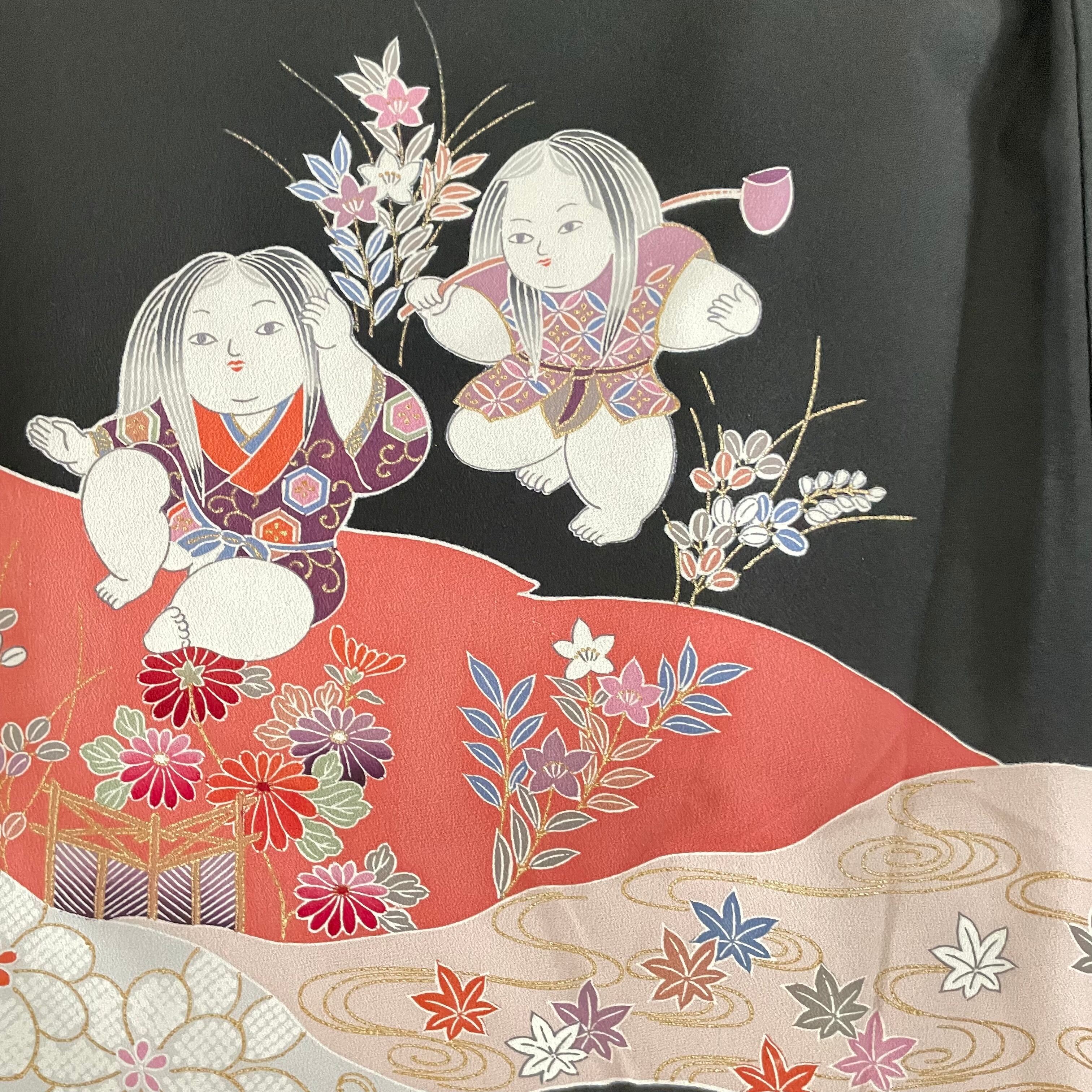 桃色、薄紅色、桜色などいくつものピンク色と淡いブルーの中に、季節の花々、青海波が美しく並んでいます。ぷっくりした童が6人、楽しそうに遊んでいる様子は可愛らしくて、ほっこり笑みがこぼれてしまいます。童の文様は子孫繁栄を意味します。結婚式などのお祝いの席にぴったりです。