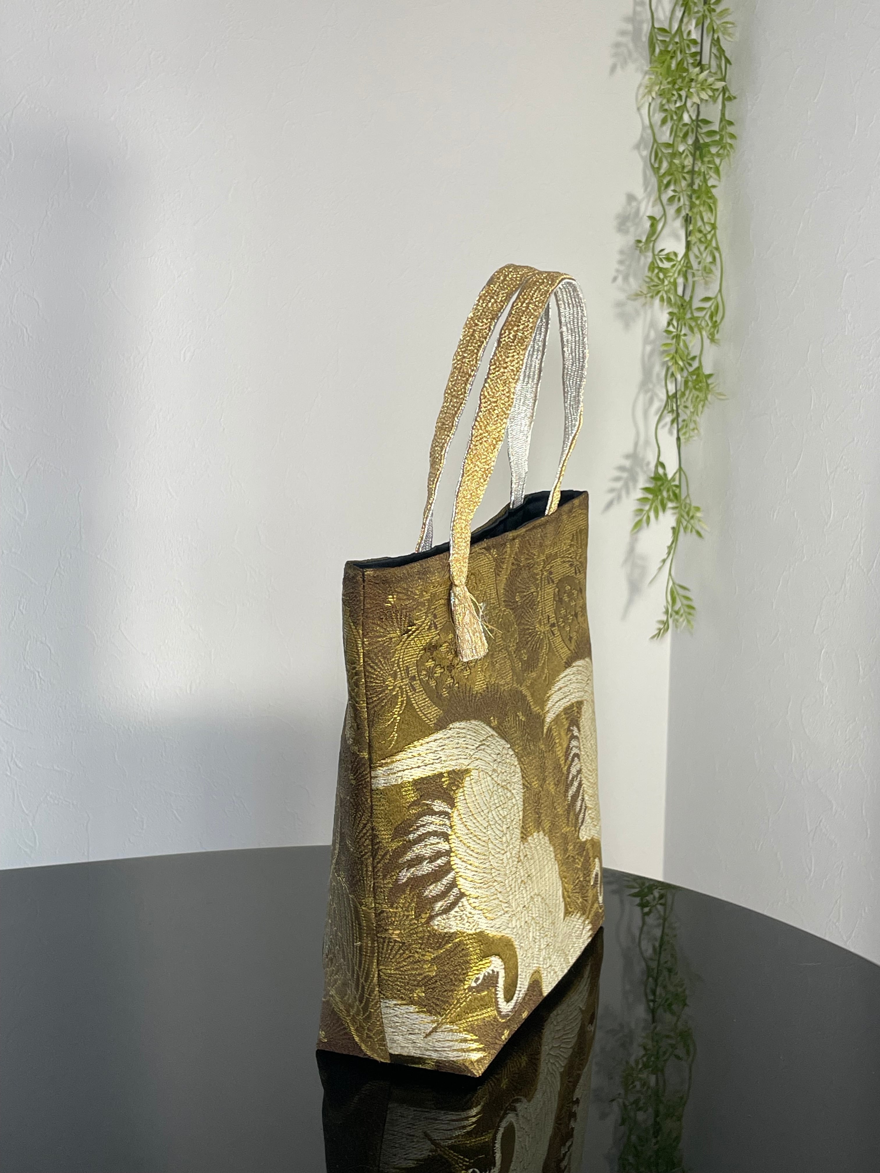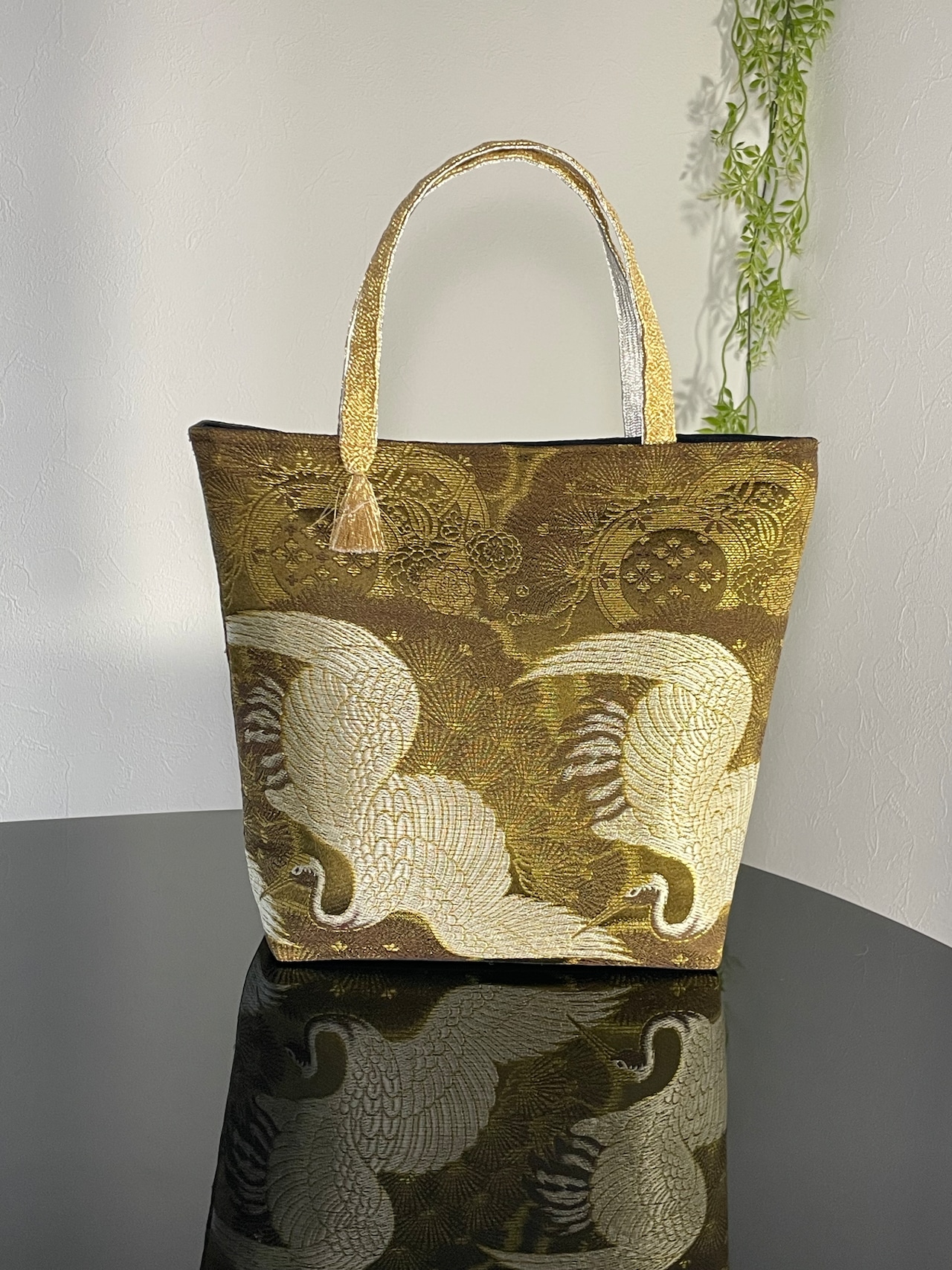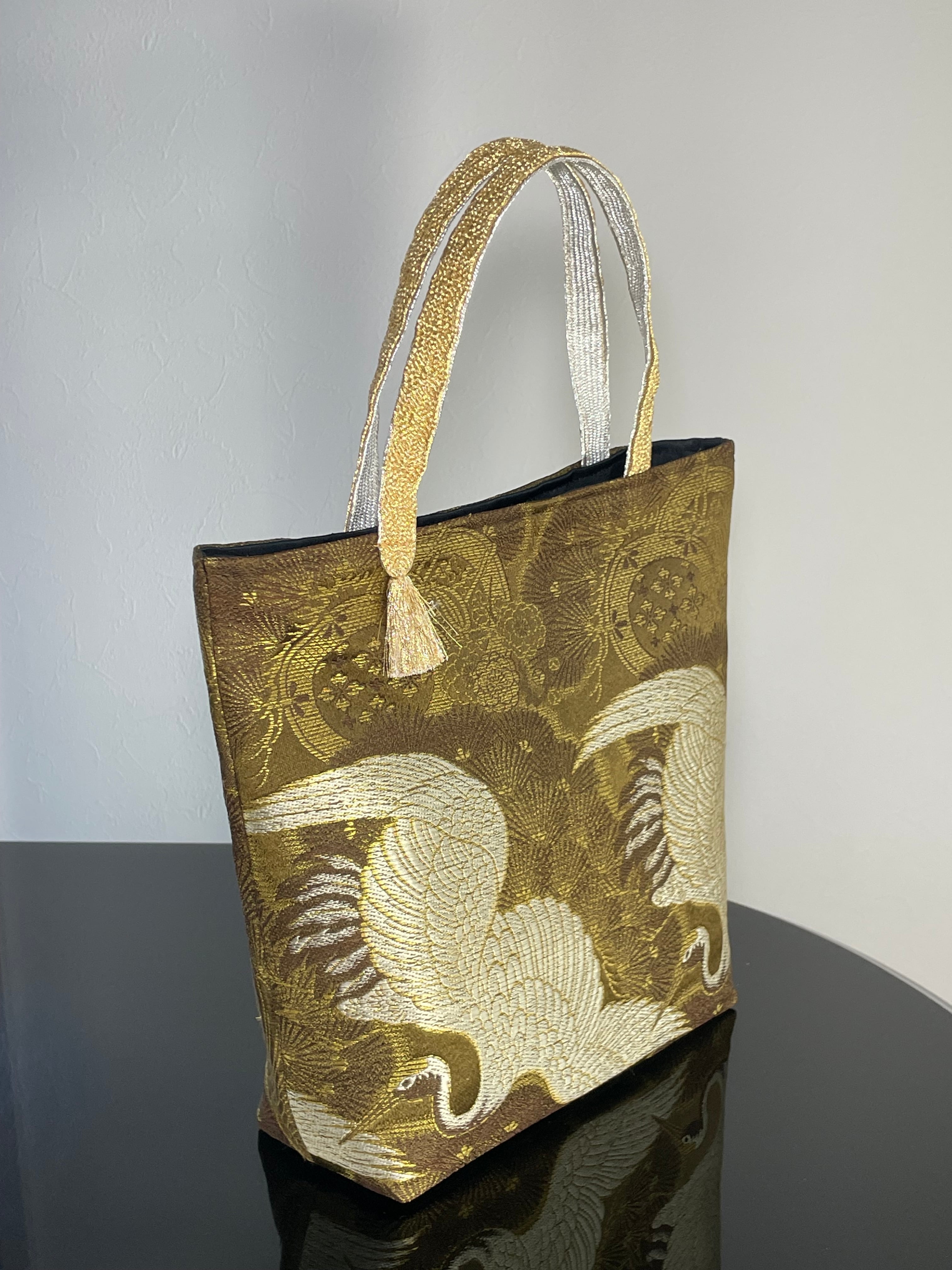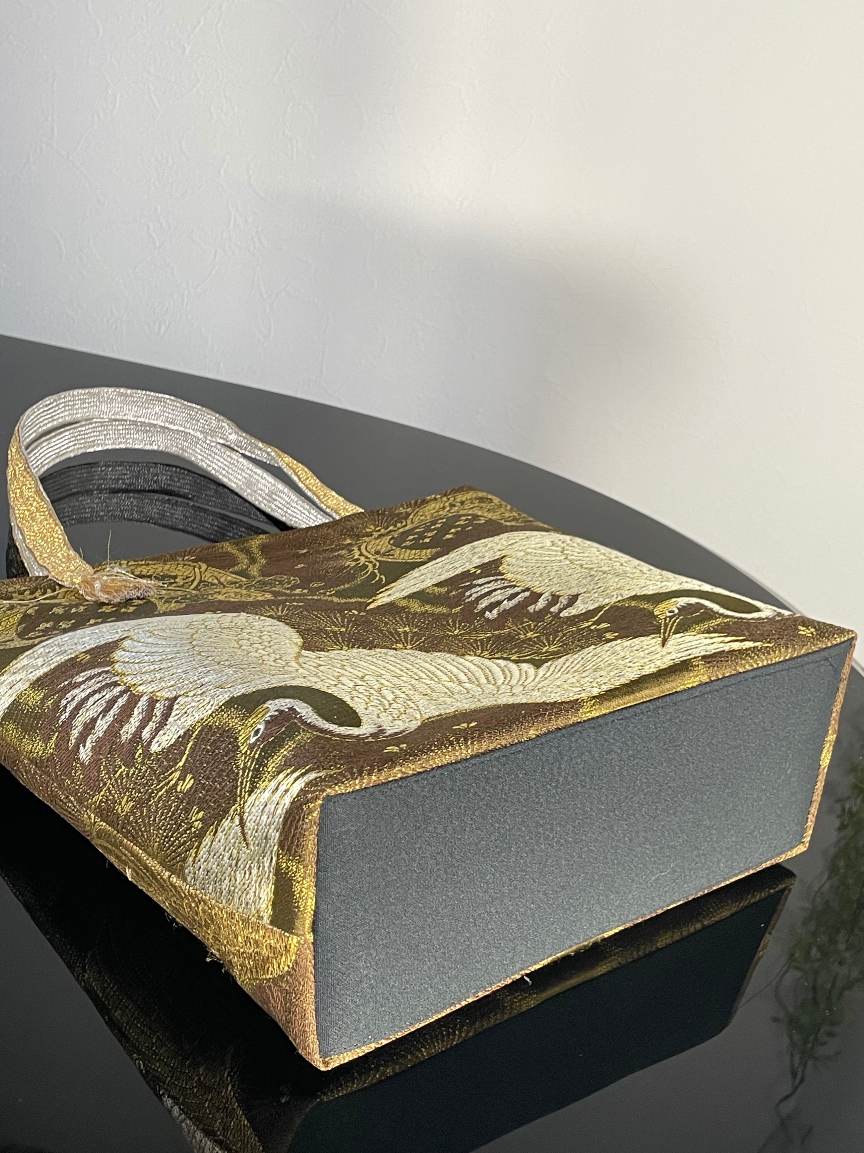 帯リメイクバッグ 丸帯 金銀の鶴 トートバッグ B5サイズ 和装バッグ