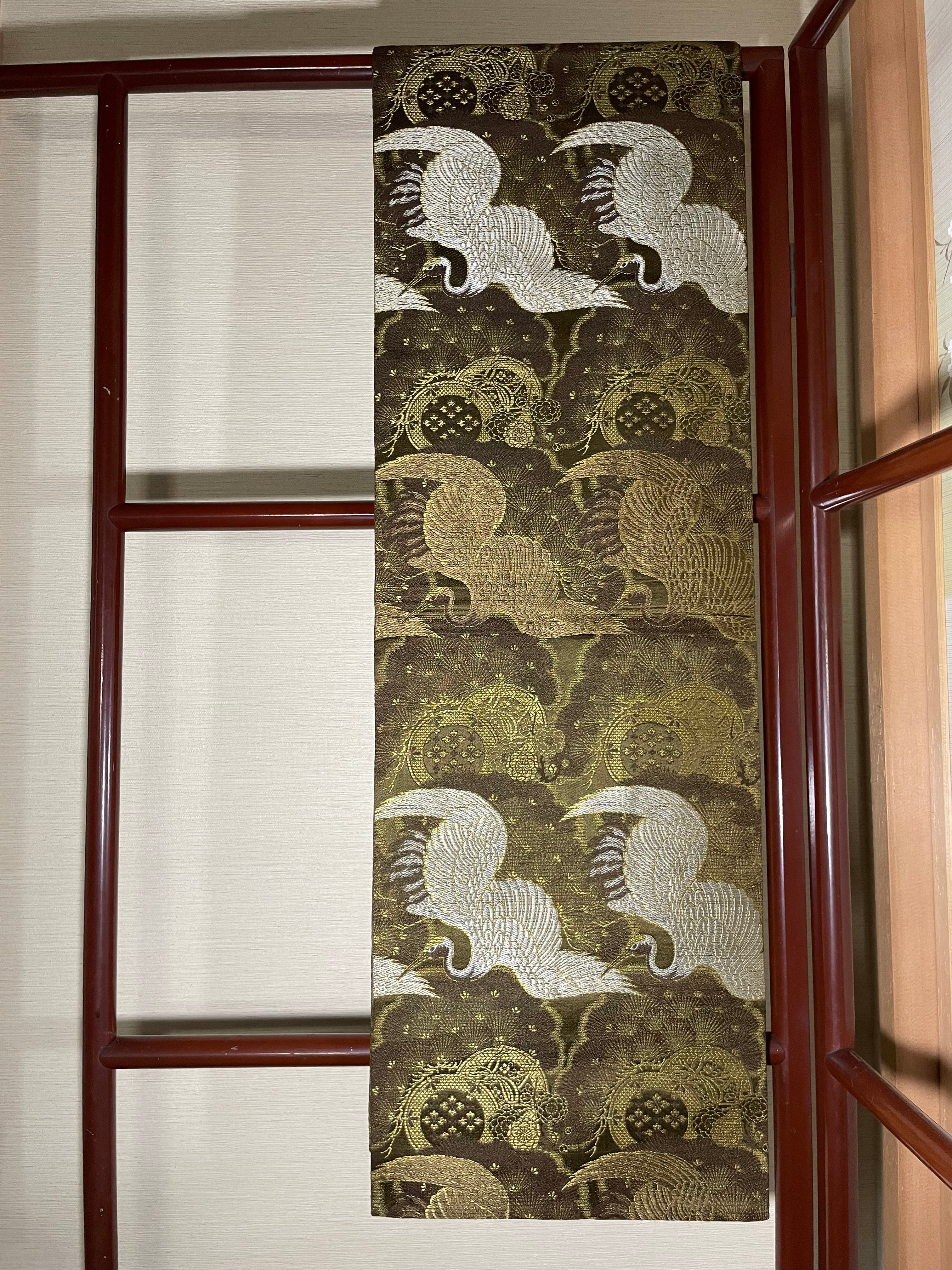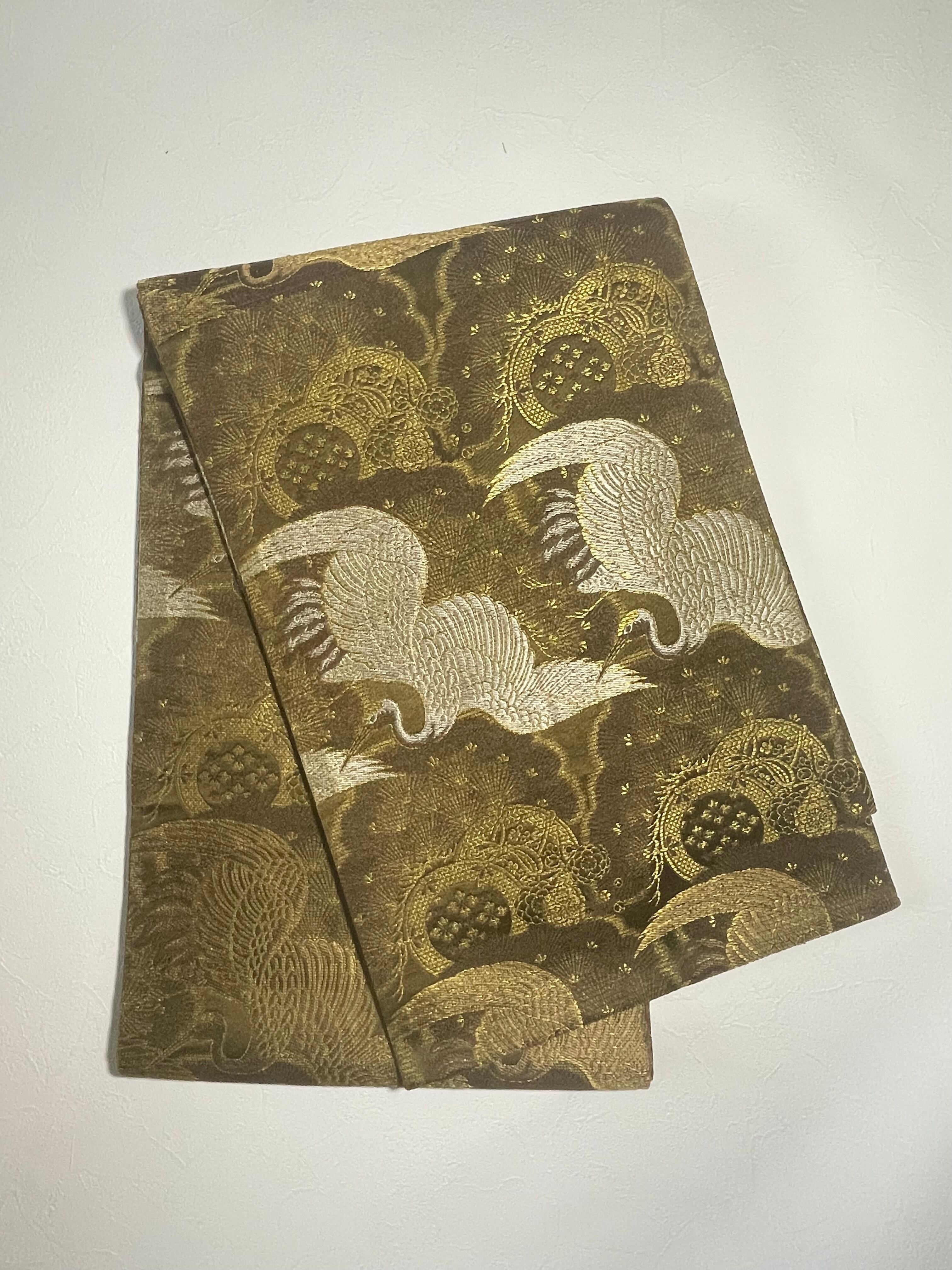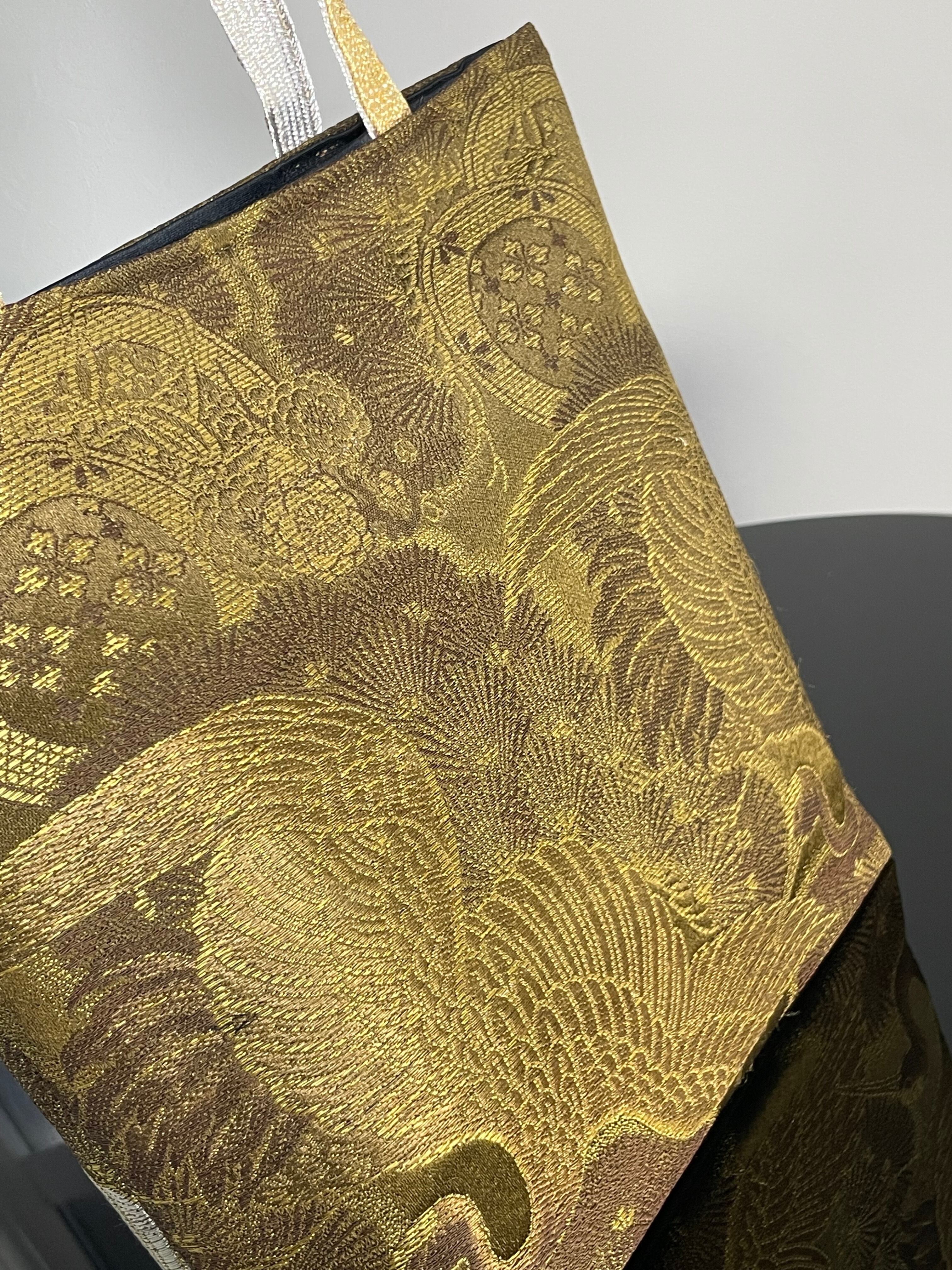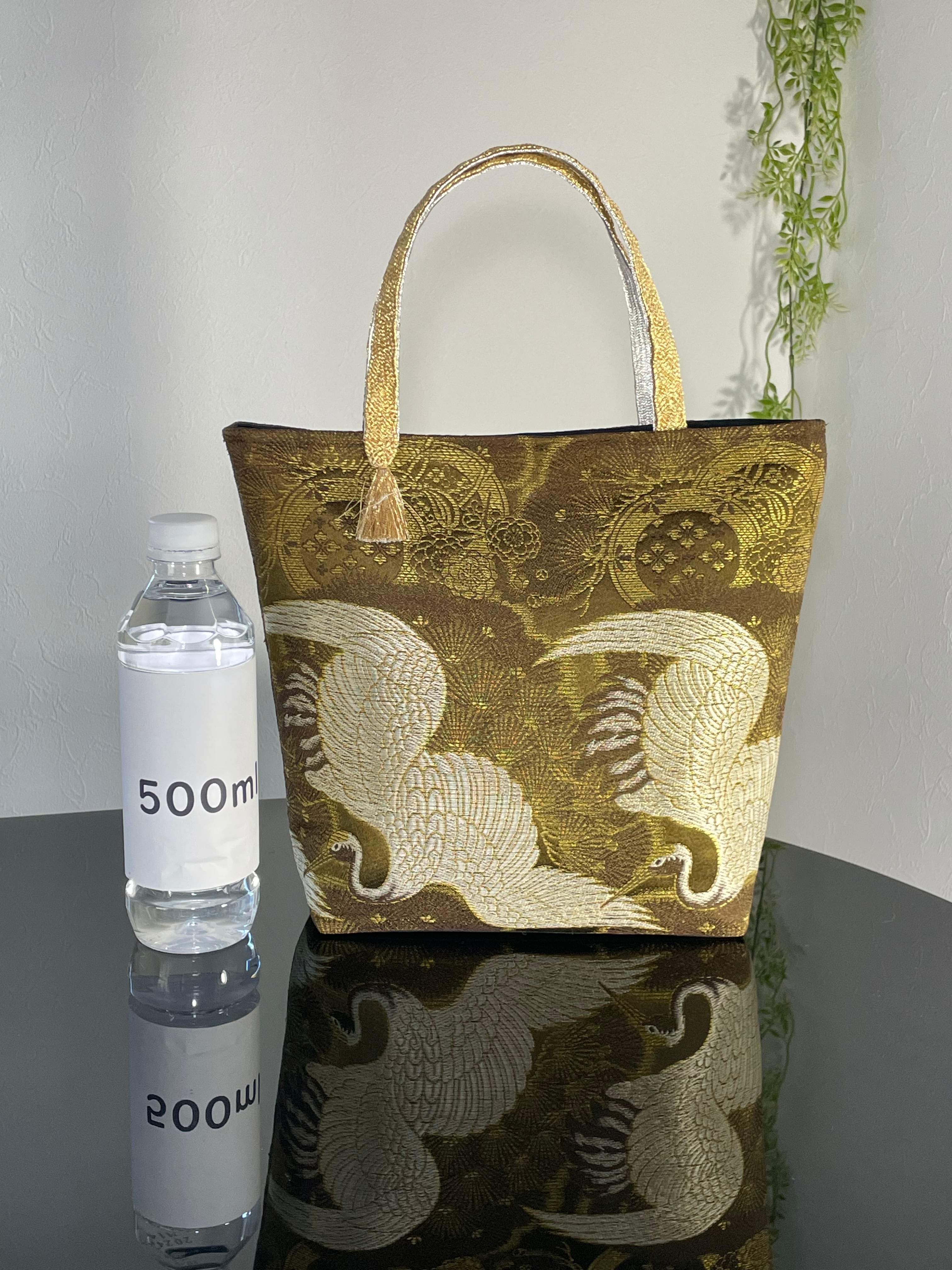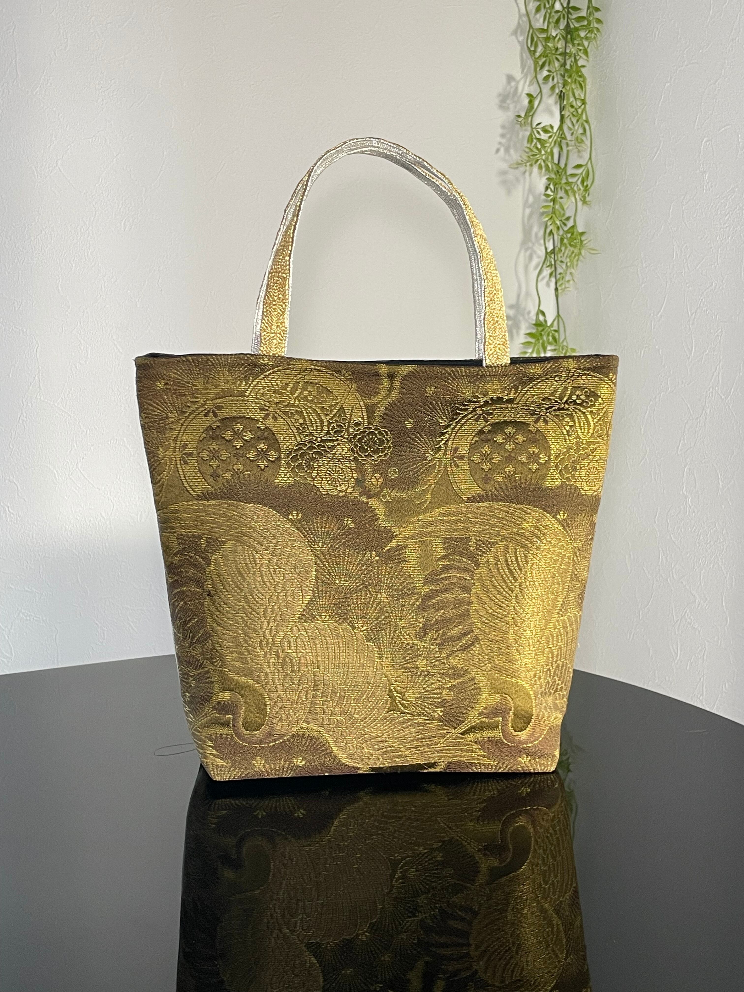 帯リメイクバッグ 丸帯 金銀の鶴 トートバッグ B5サイズ 和装バッグ