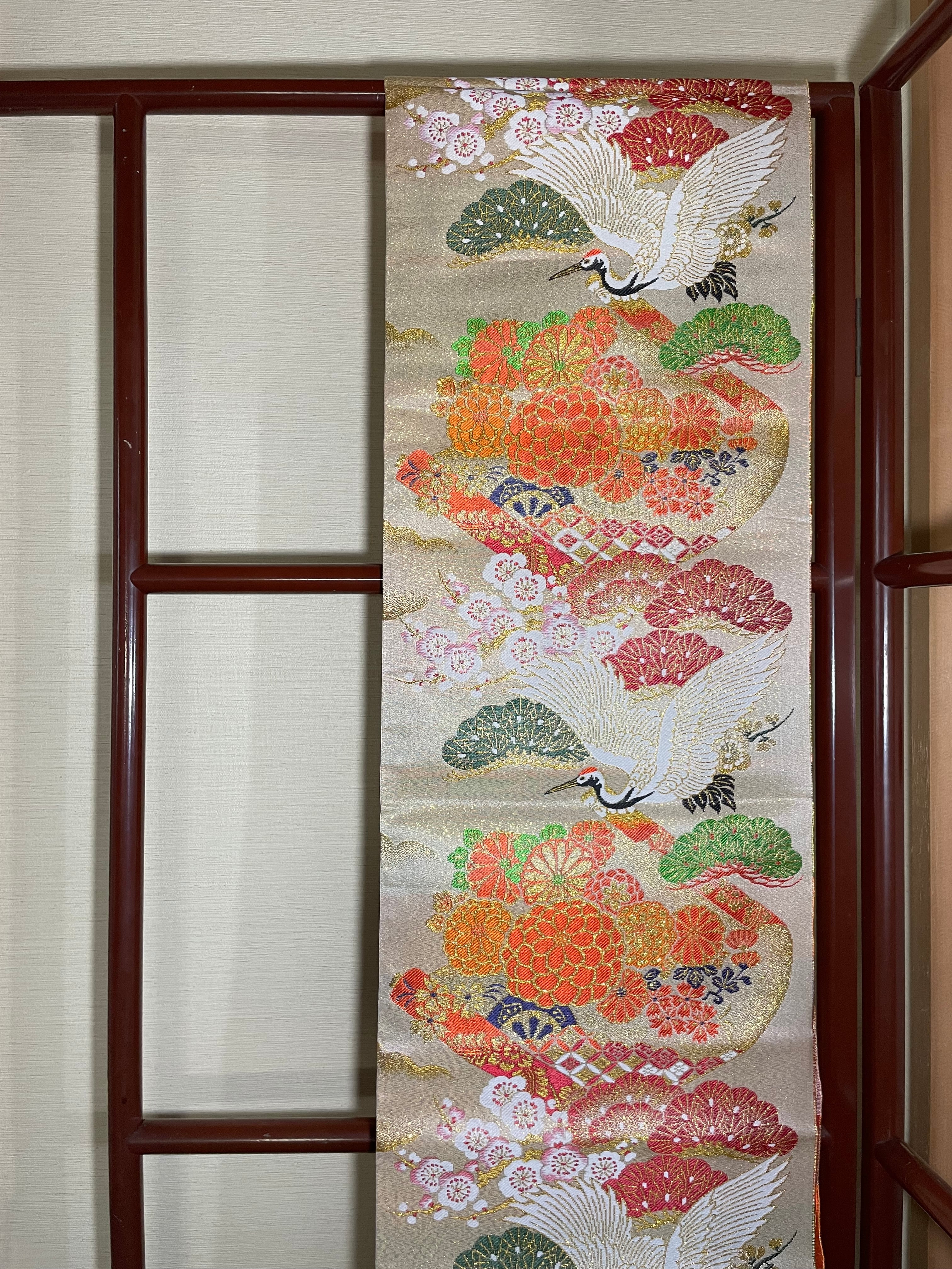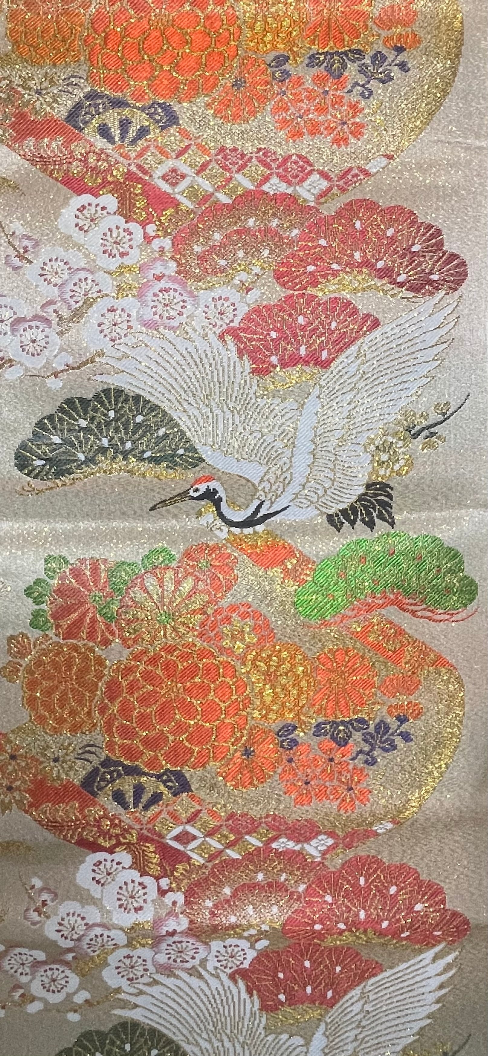 未来に向か鶴に松や梅、菊などがキラキラと輝く金糸とともに、the Japan!を感じる優雅な柄で織りあげられている丸帯からのリメイクです。