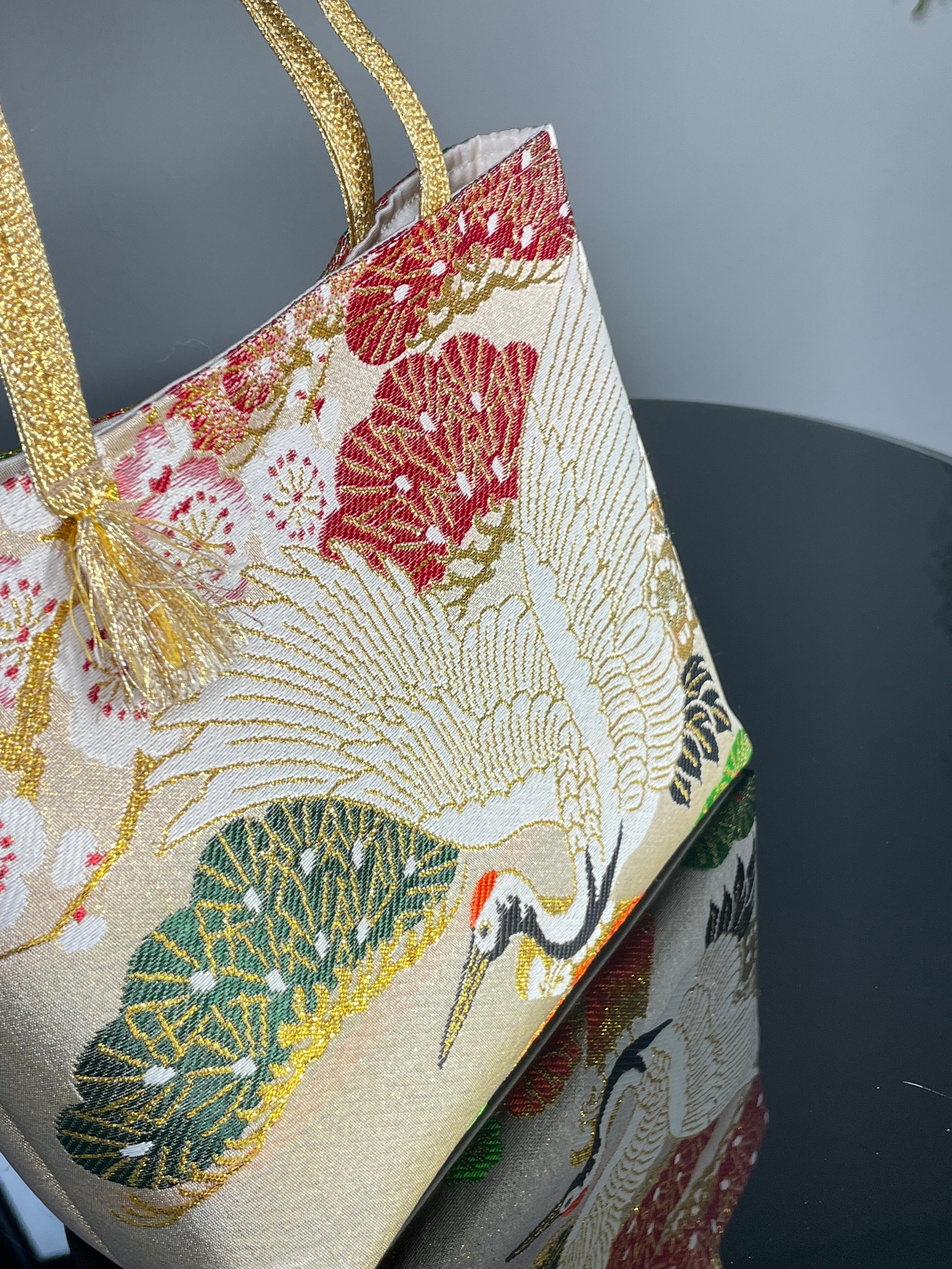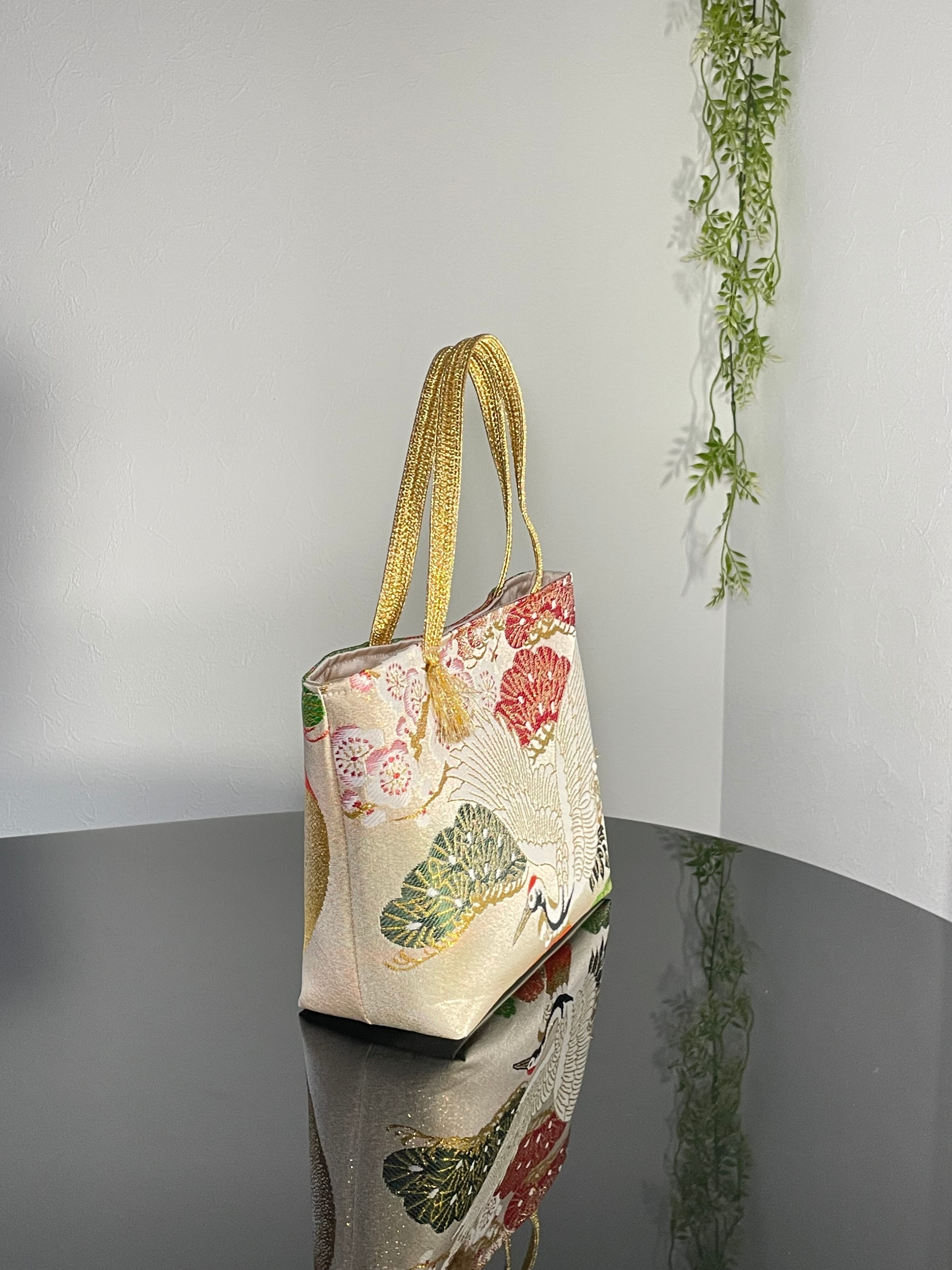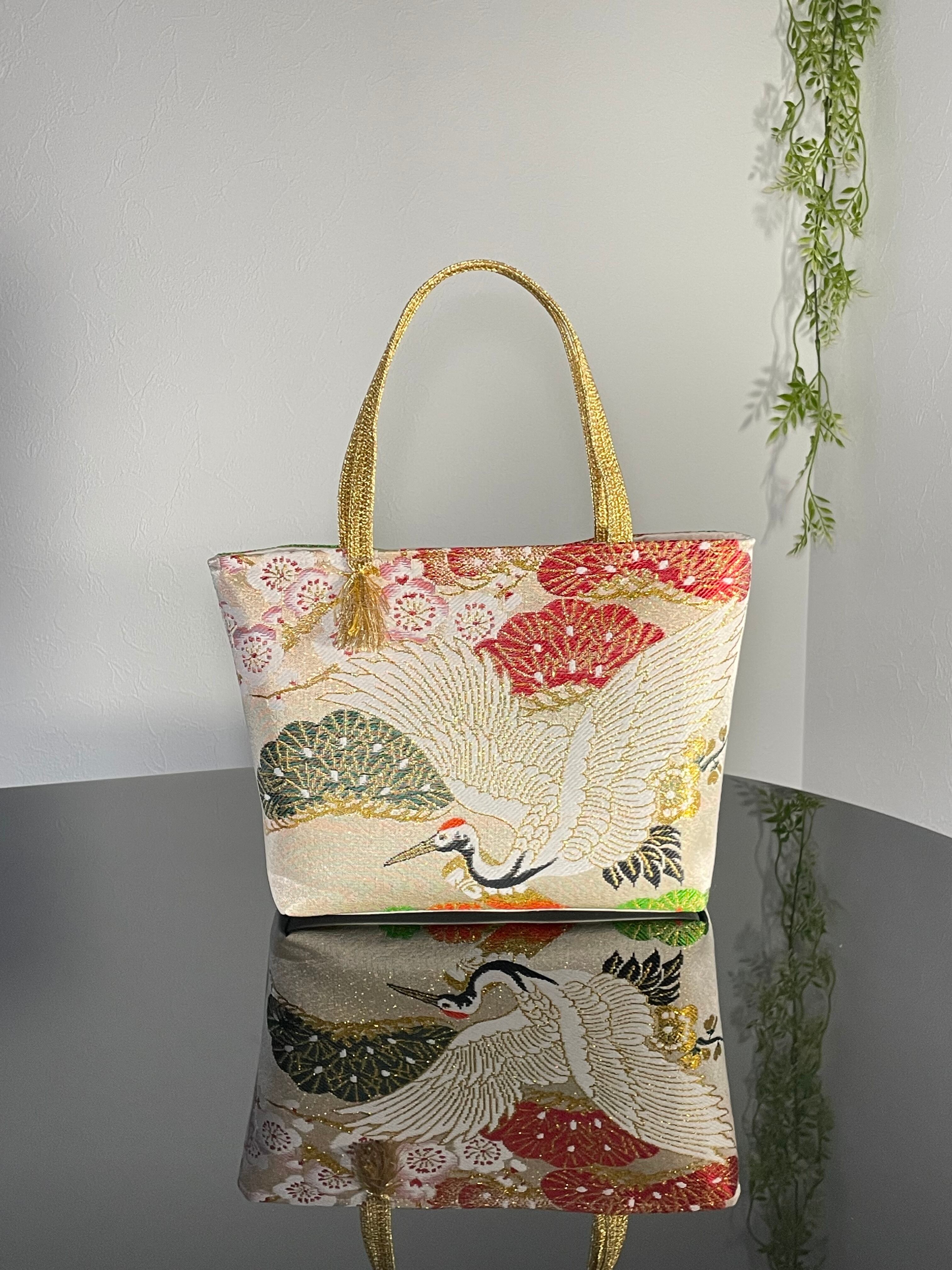 帯リメイクバッグ 鶴と菊 Japan 丸帯 トートバッグ 和装バッグ 帯バッグ