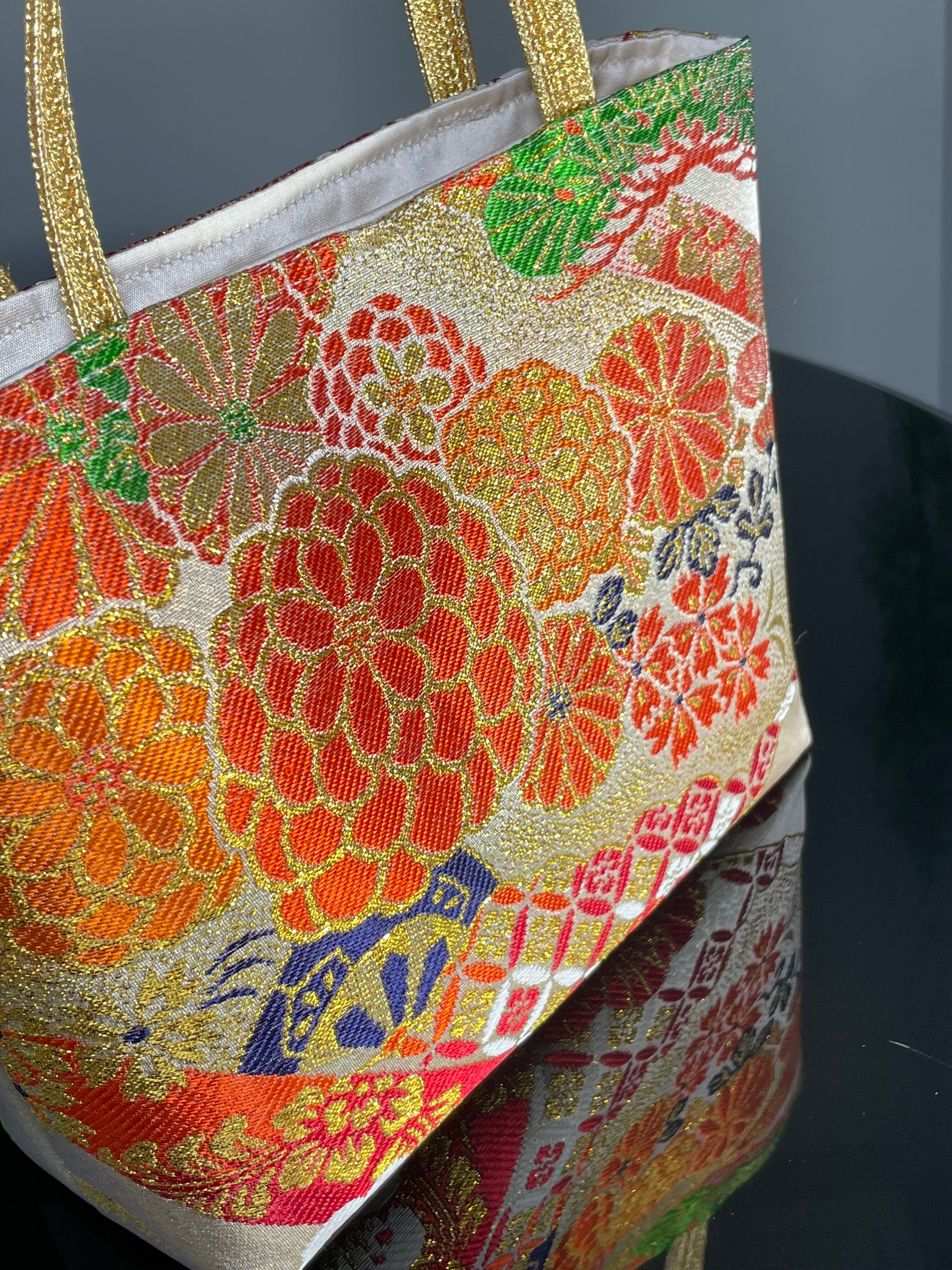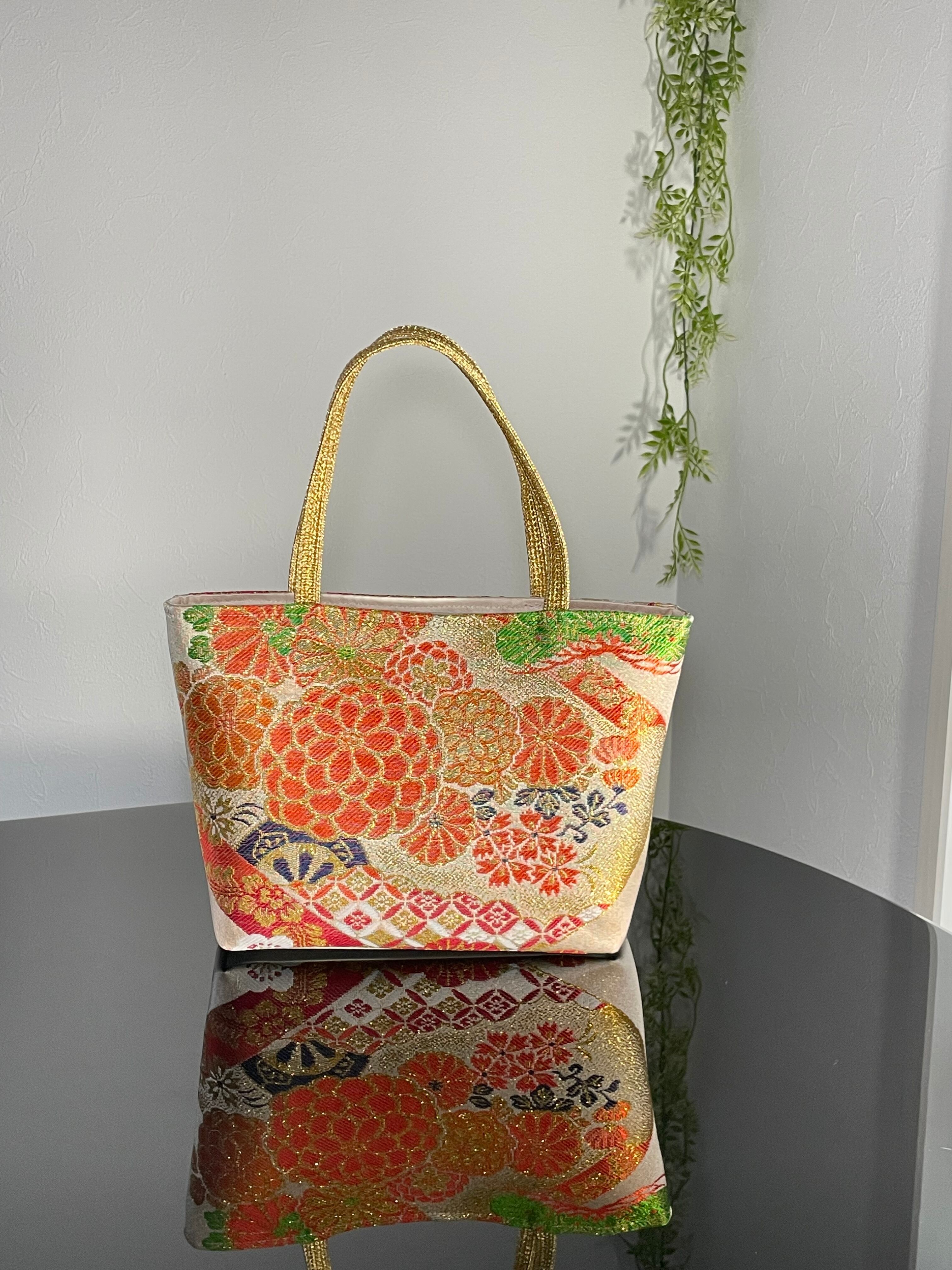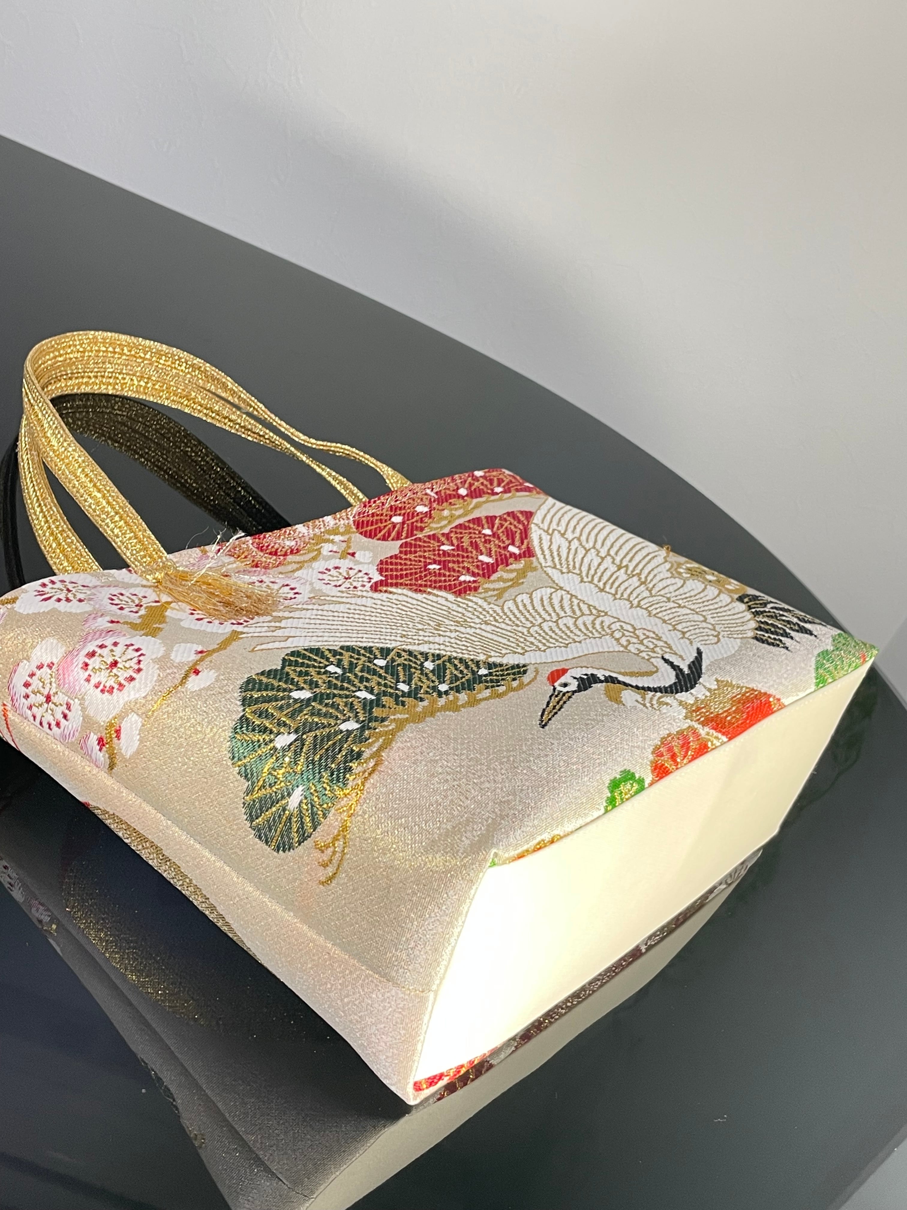 帯リメイクバッグ 鶴と菊 Japan 丸帯 トートバッグ 和装バッグ 帯バッグ