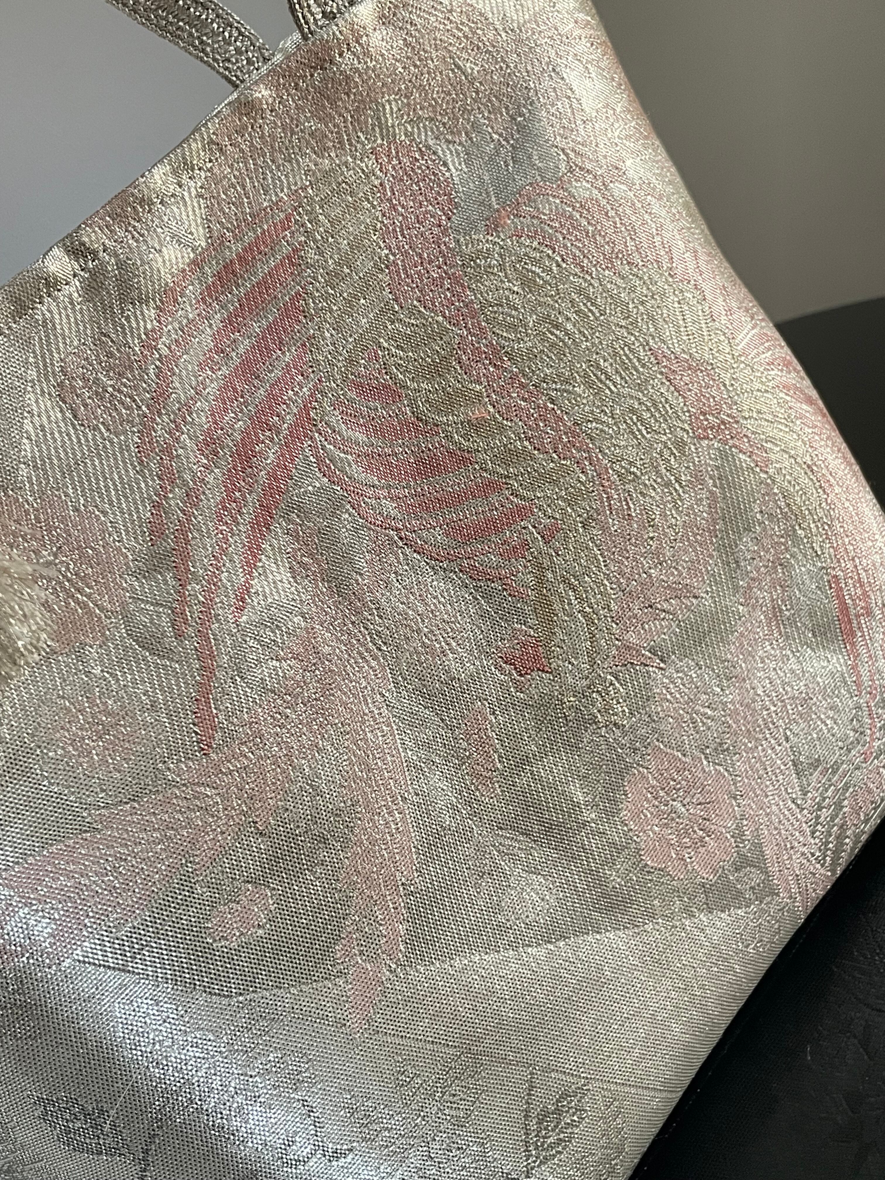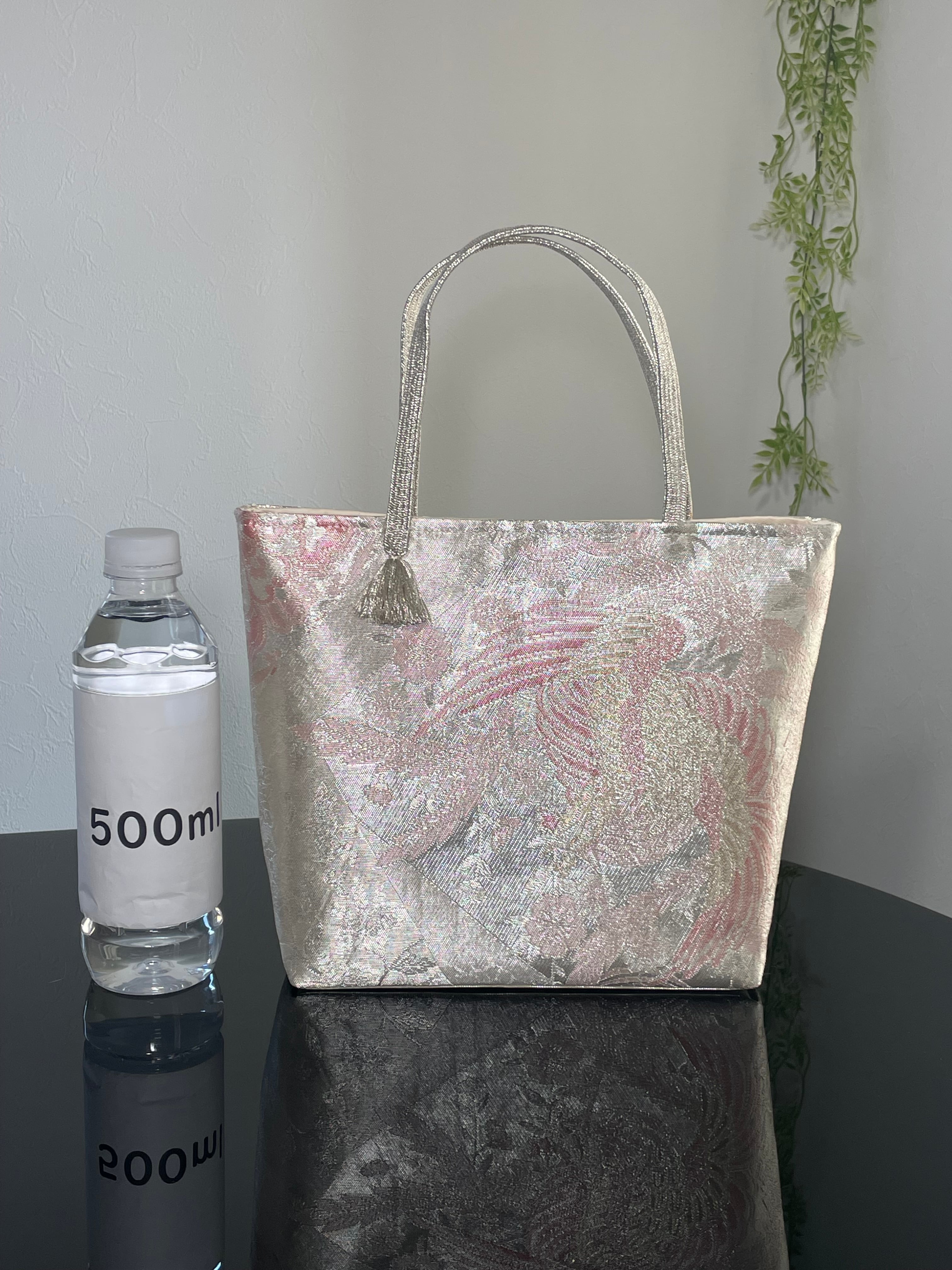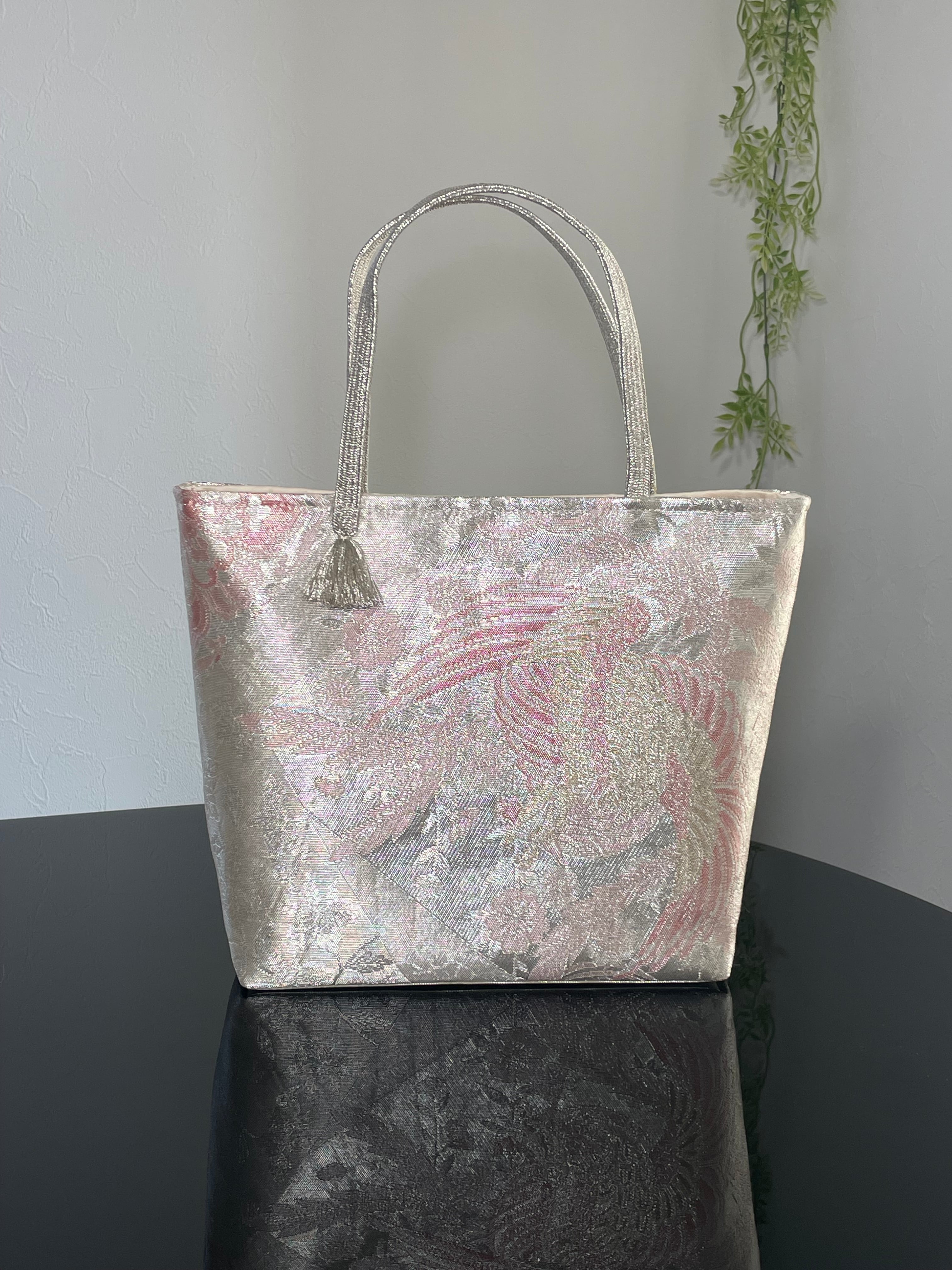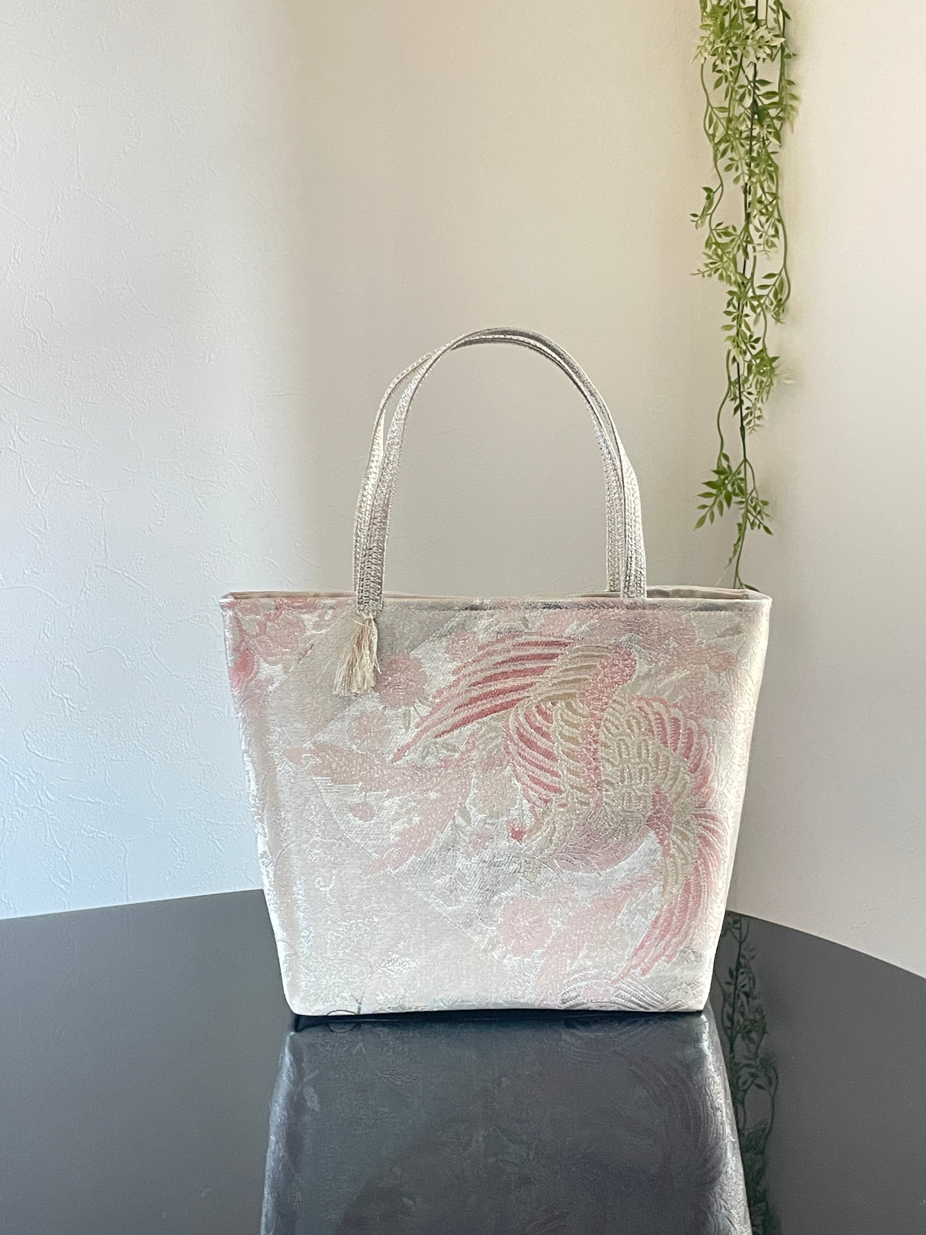 帯リメイクバッグ 九百織佐賀錦 ピンクの鳳凰と華文様 Mサイズ 和装バッグ