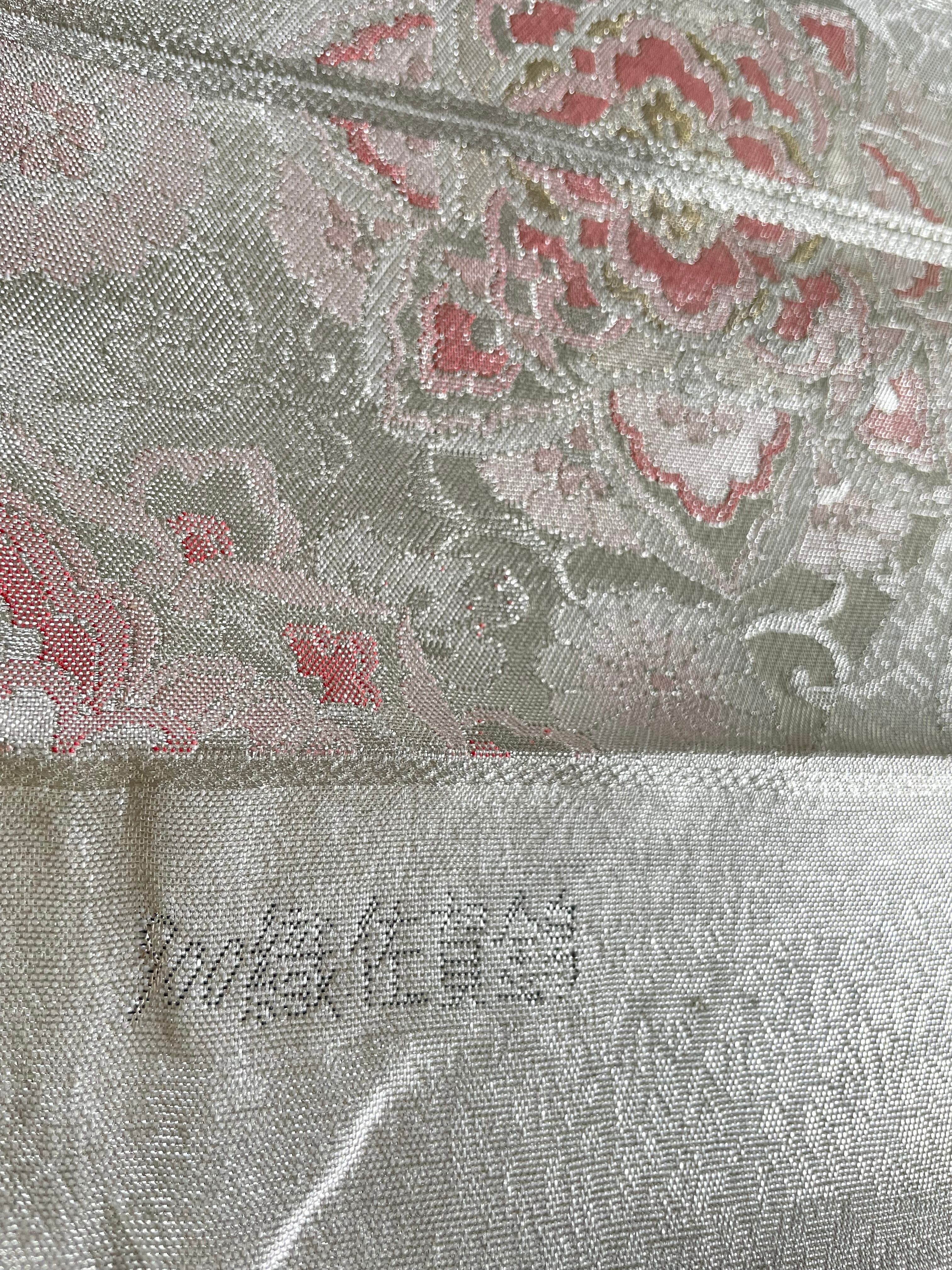 九百錦とは、普通の振袖用の袋帯など帯幅の中に入る経糸は500〜600本で織られていますが、九百錦ですから帯幅に900本の経糸が使われています。糸の本数が多くなるぼど使われる糸は細くなり、織り柄が緻密になります。