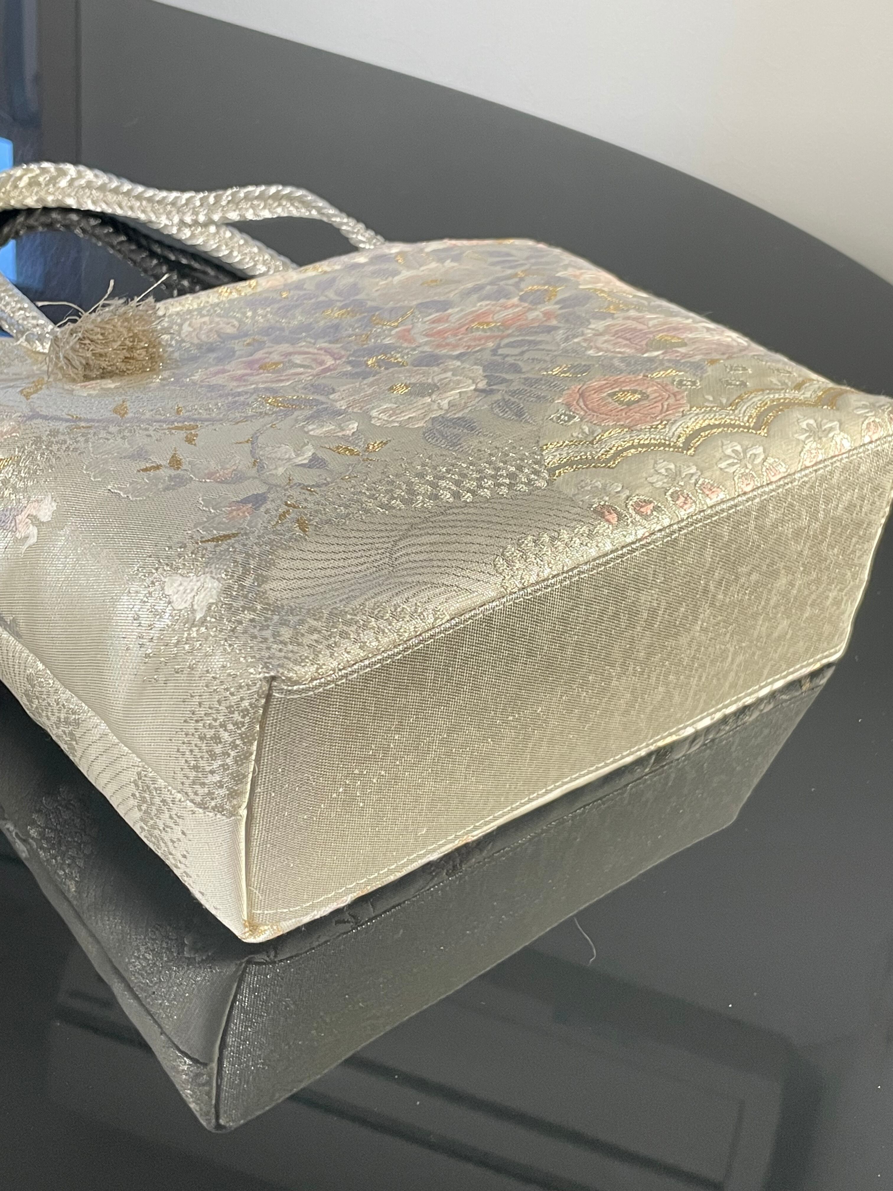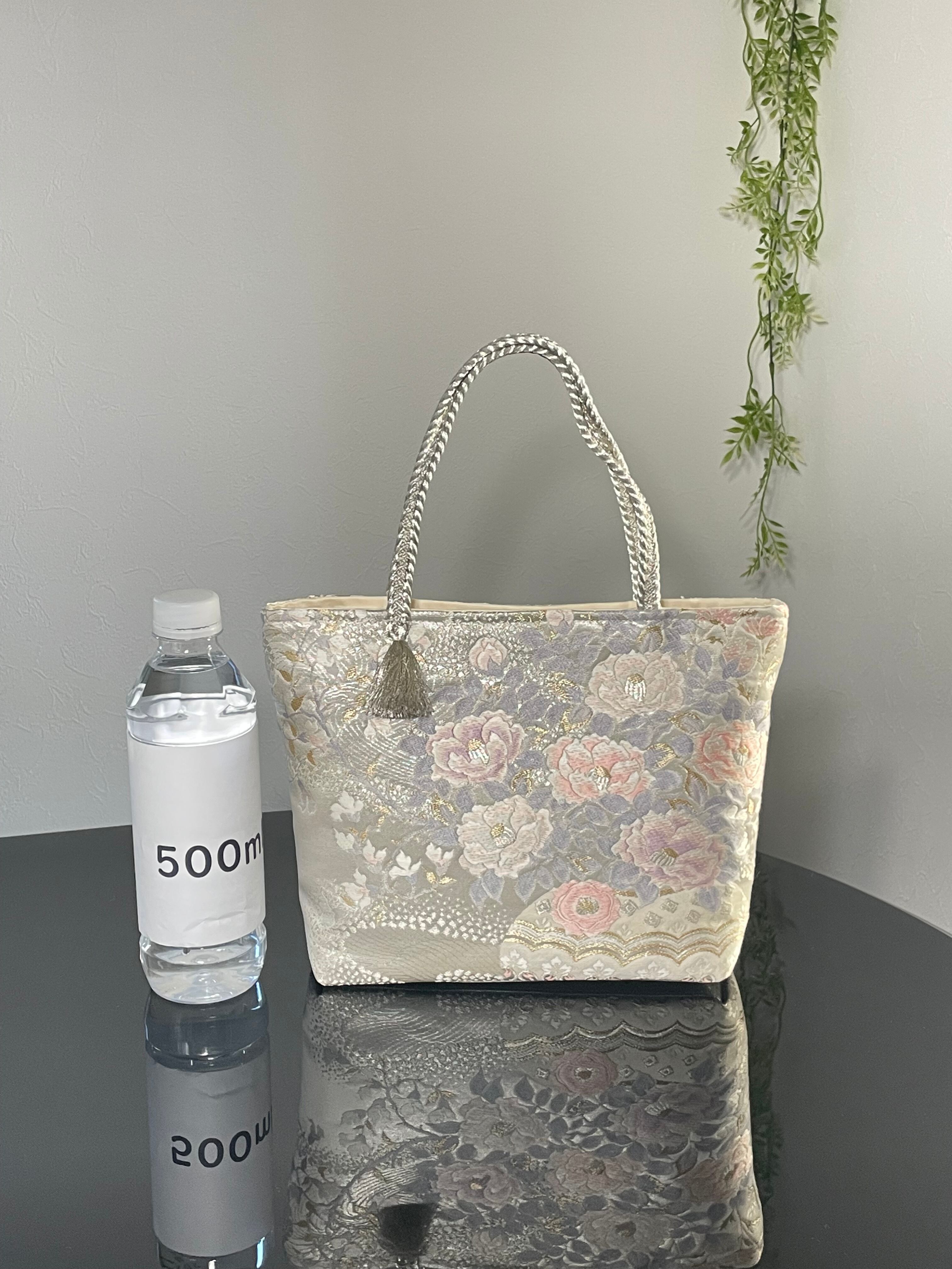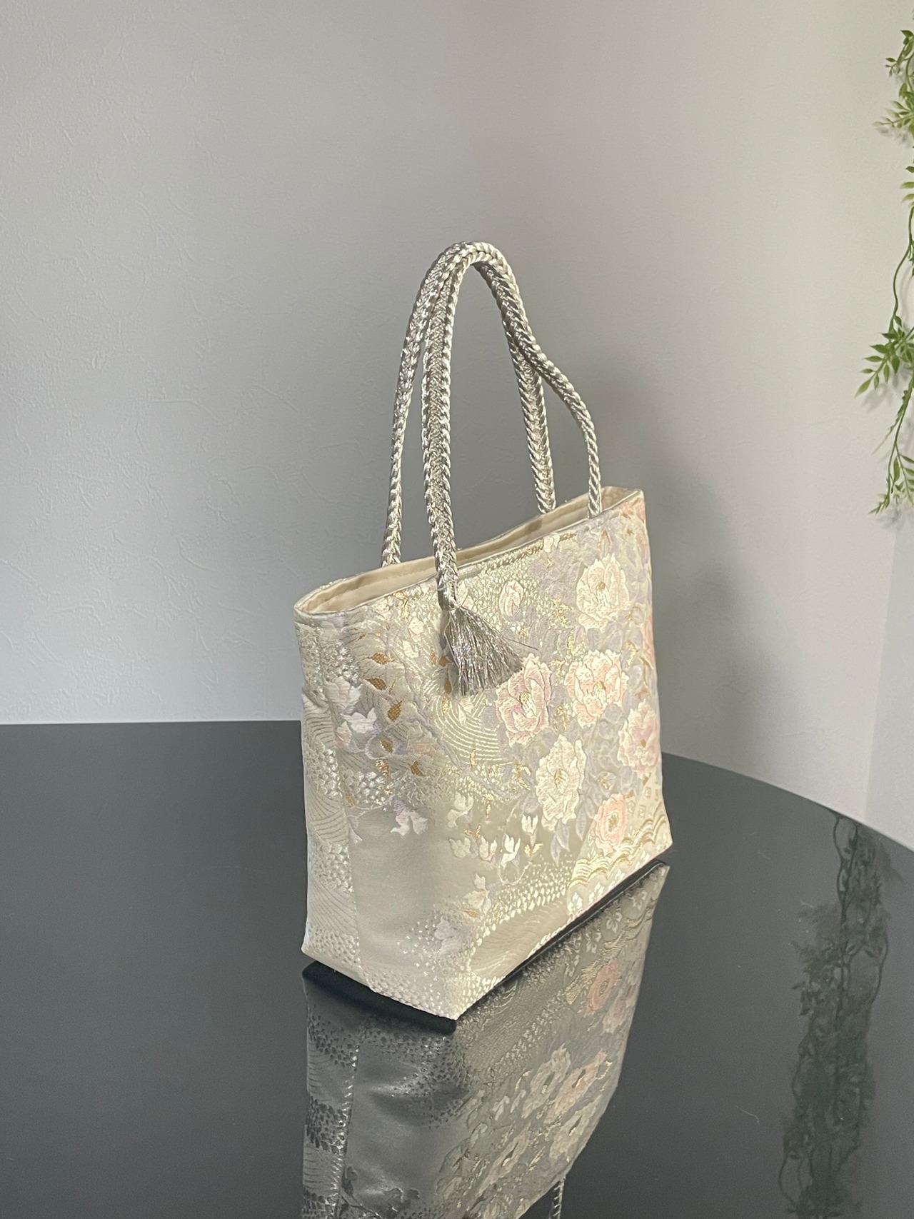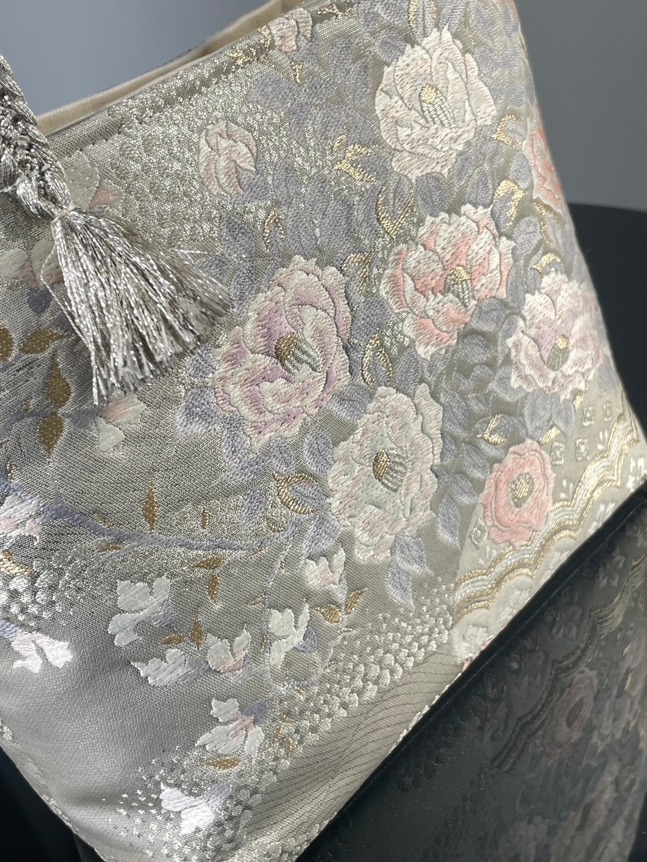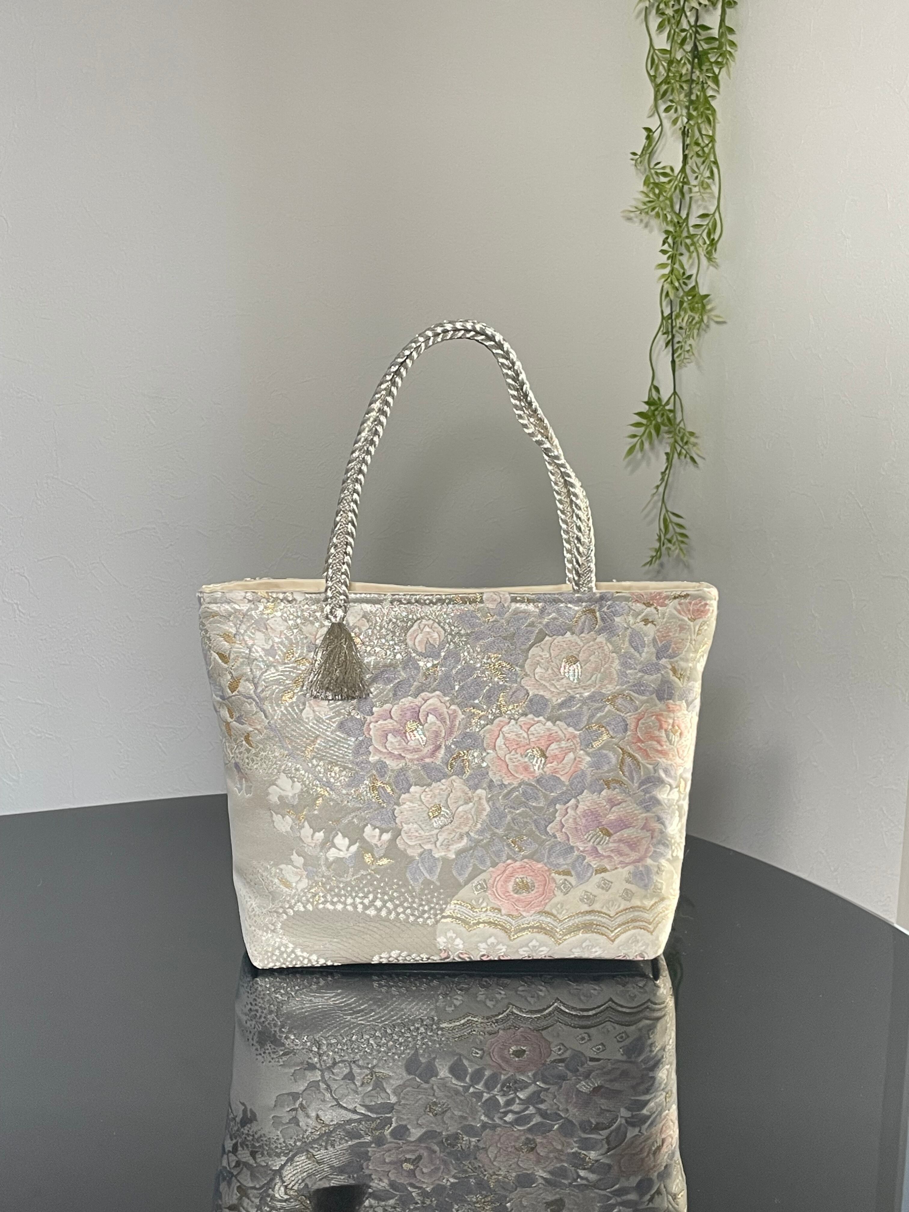 帯リメイクバッグ 淡い色合いの椿 Mサイズ 和装バッグ 帯バッグ