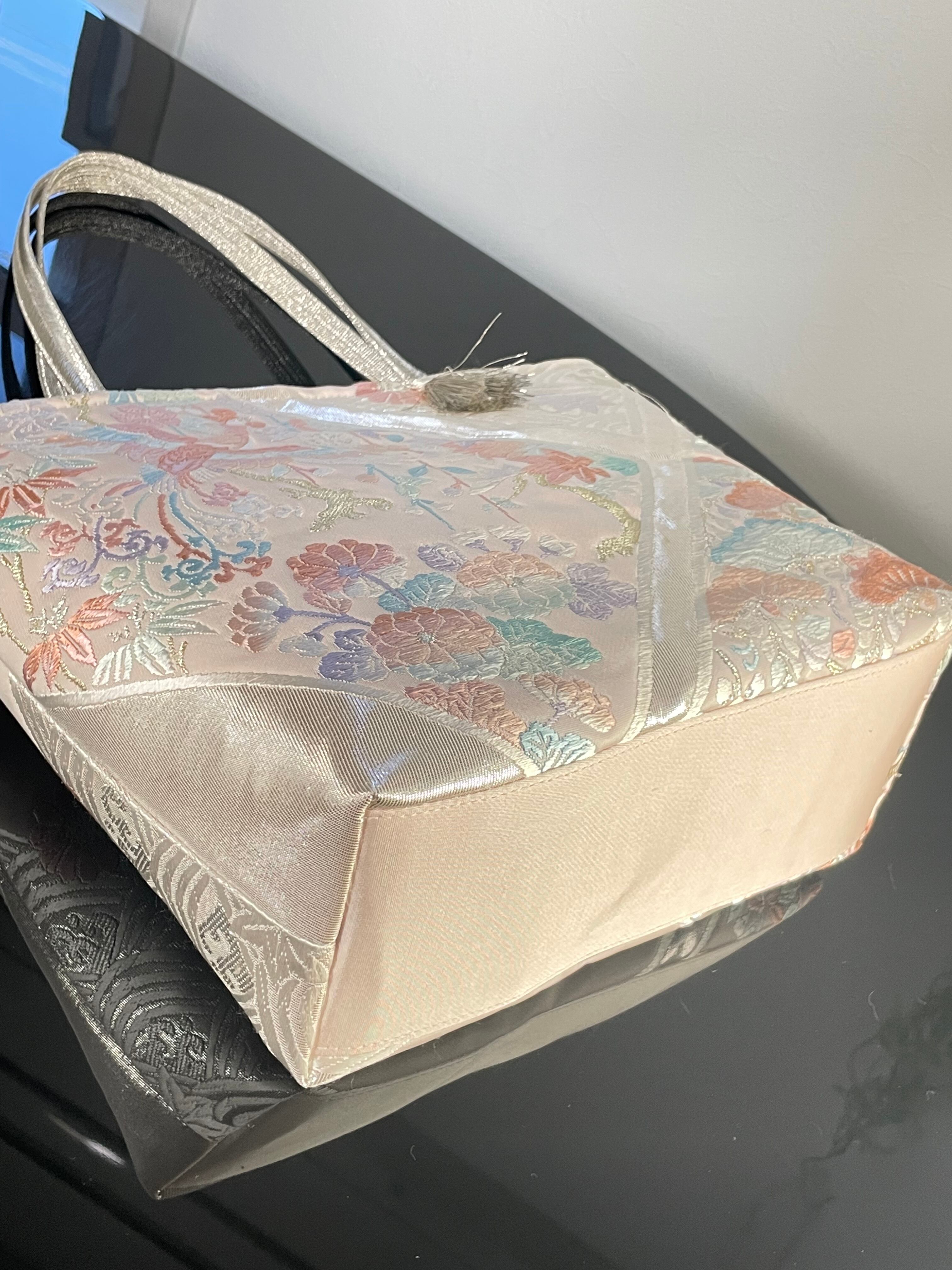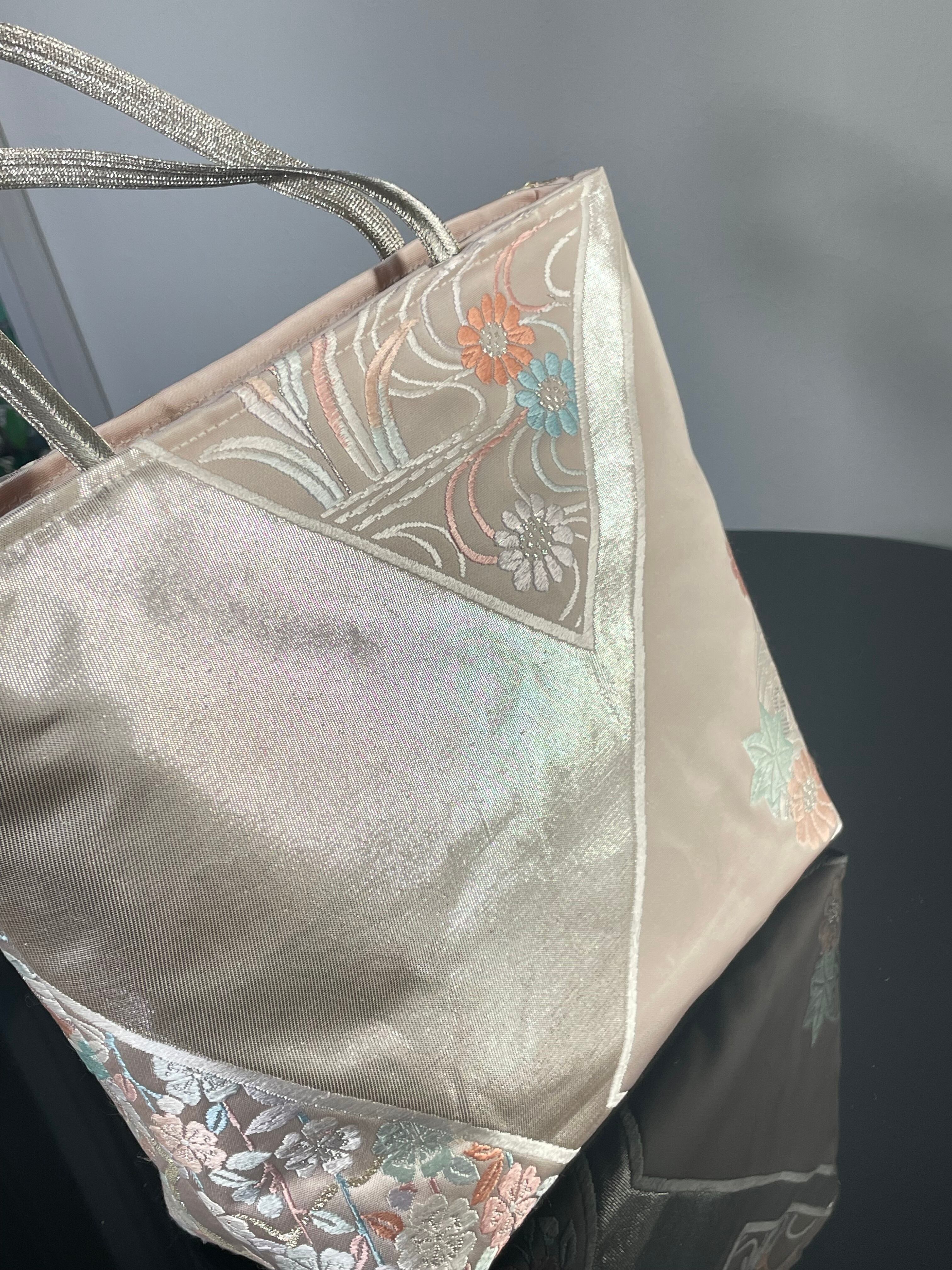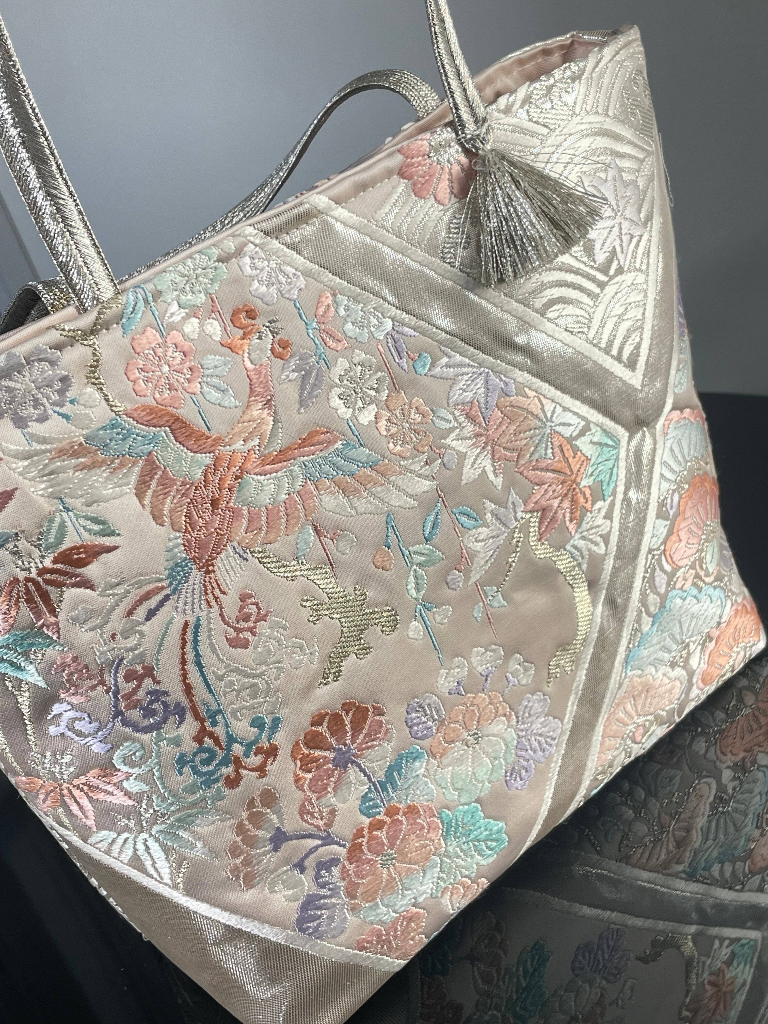 大変に状態の良いリユース帯をリメイ クし、トートバッグを作成いたしました。こちらの柄はこれで終了です。