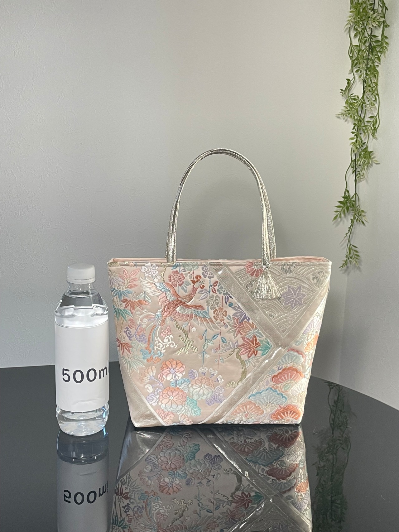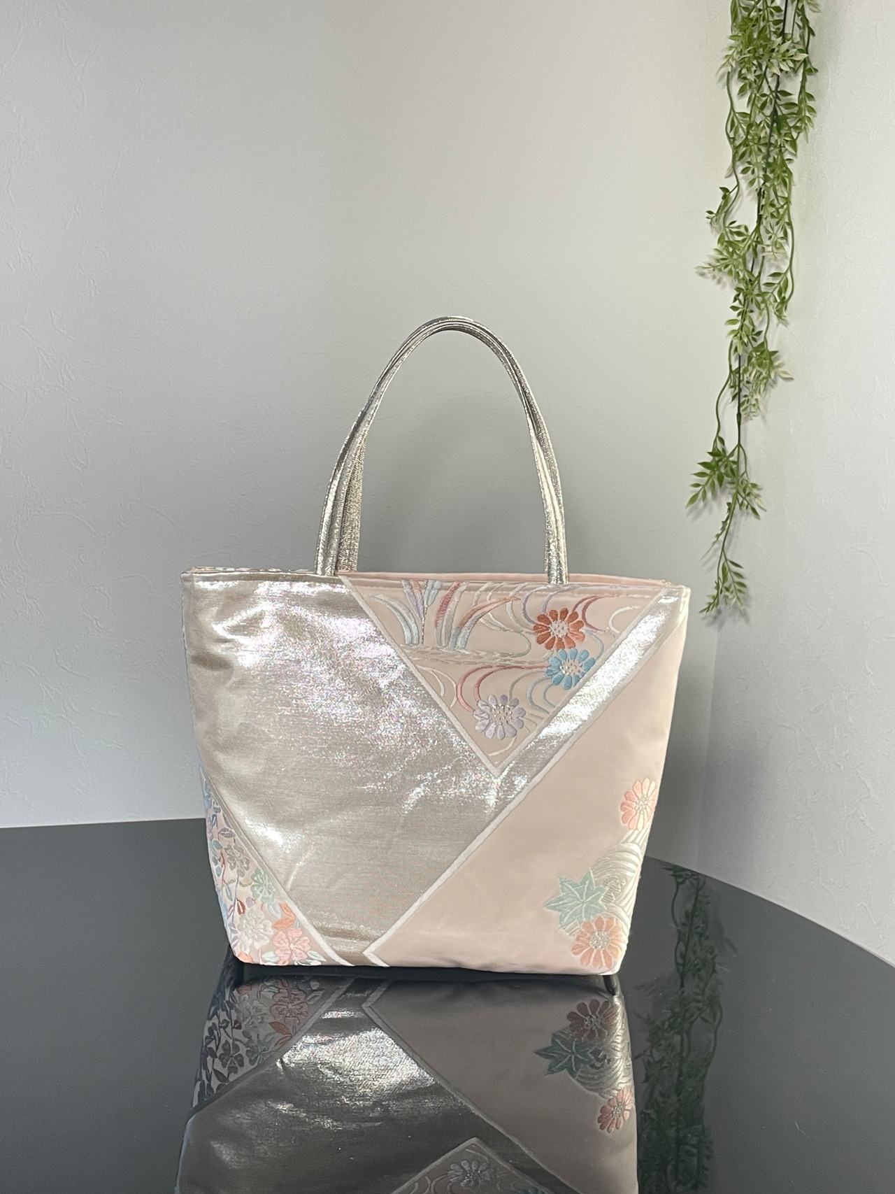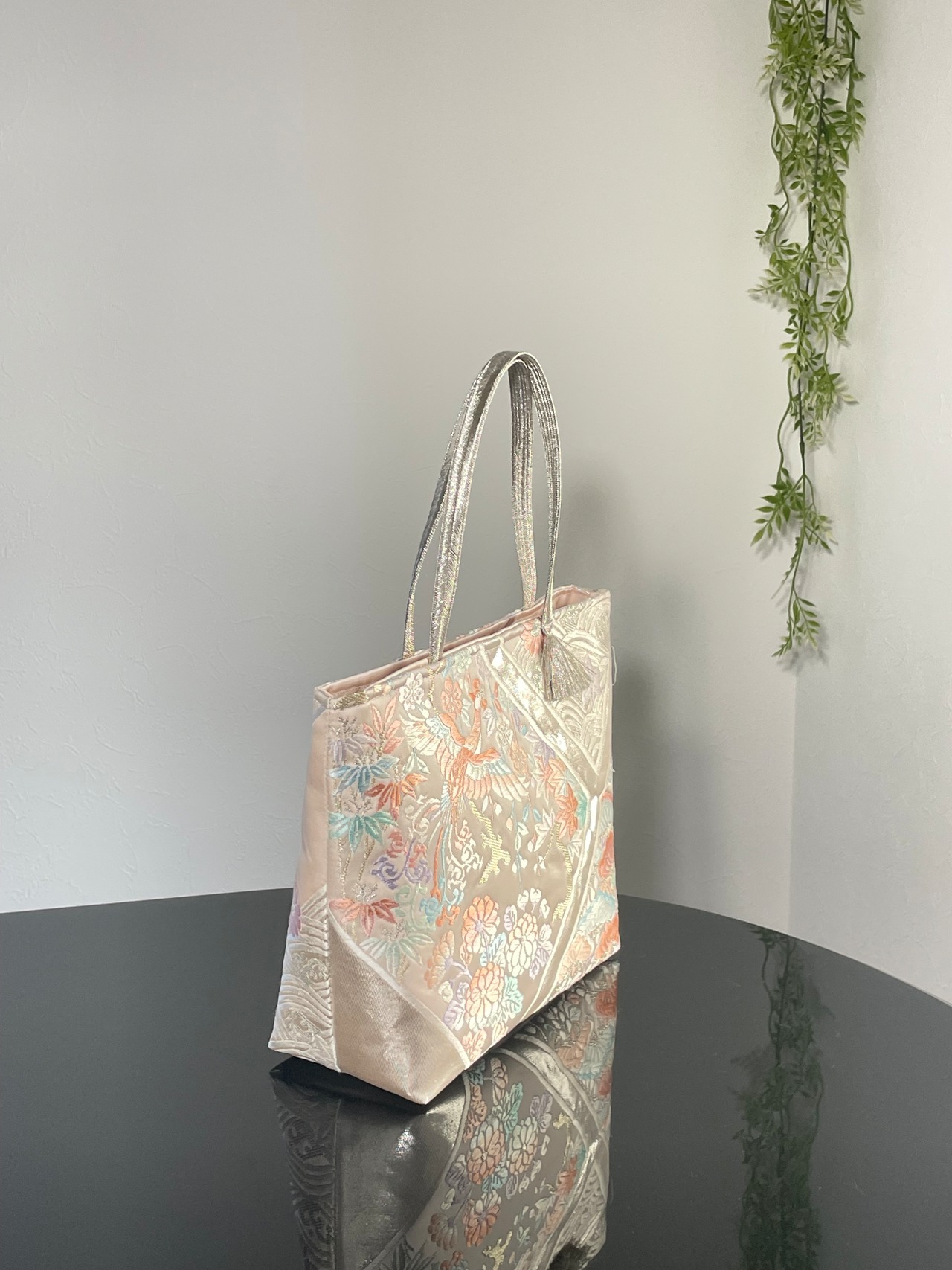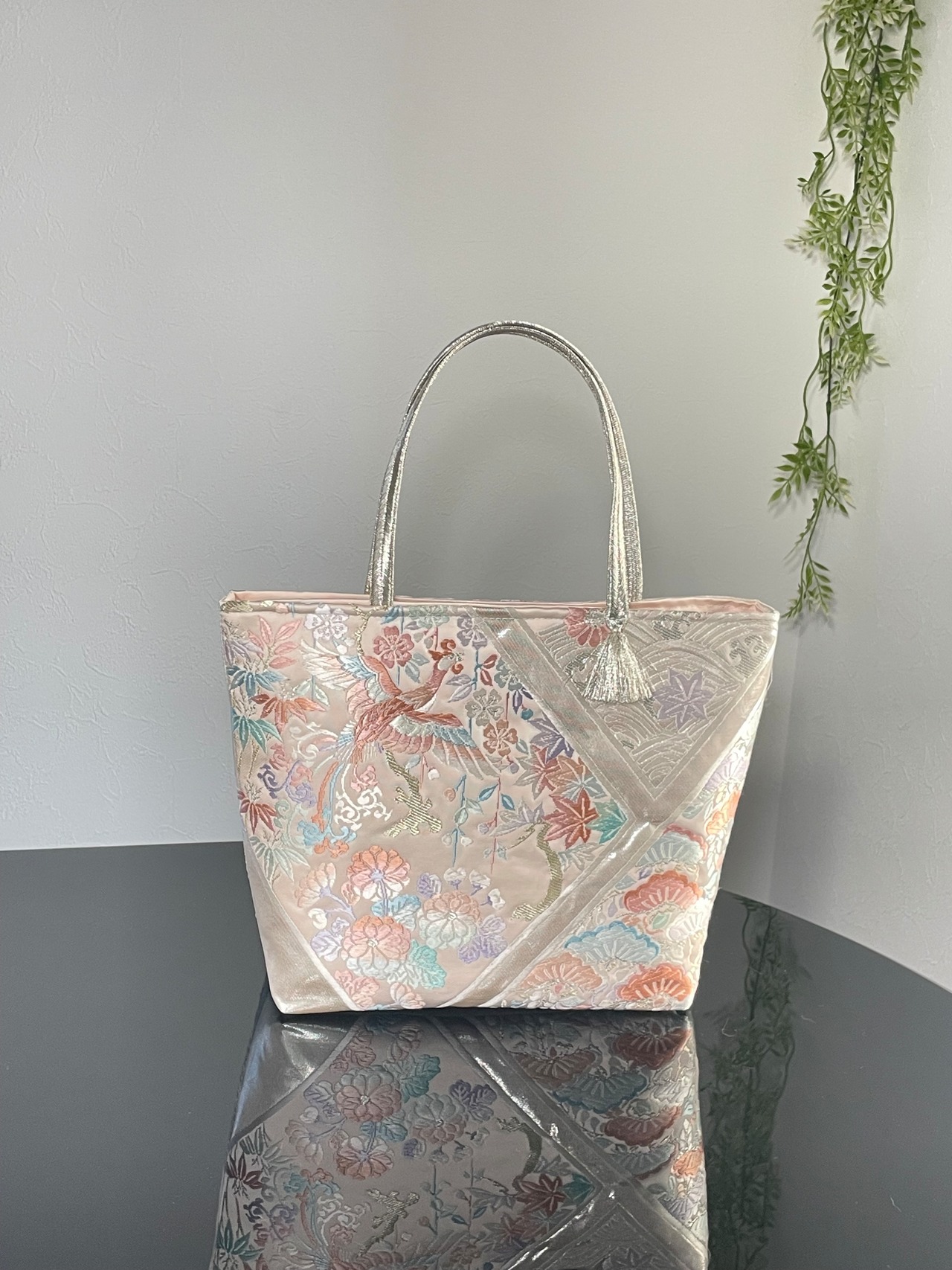大変に状態の良いリユース帯をリメイ クし、トートバッグを作成いたしました。こちらの柄はこれで終了です。
