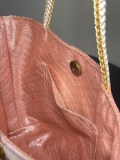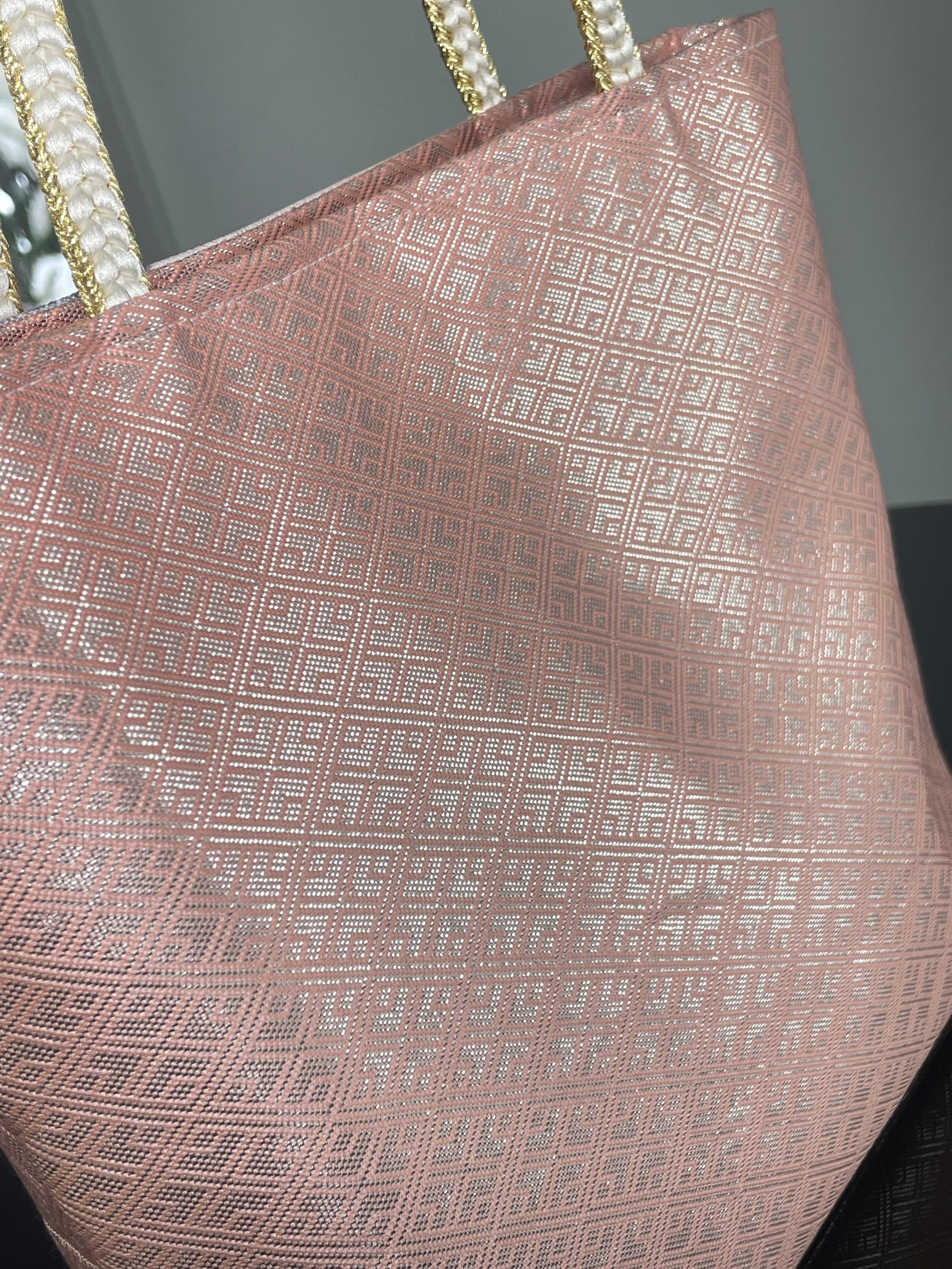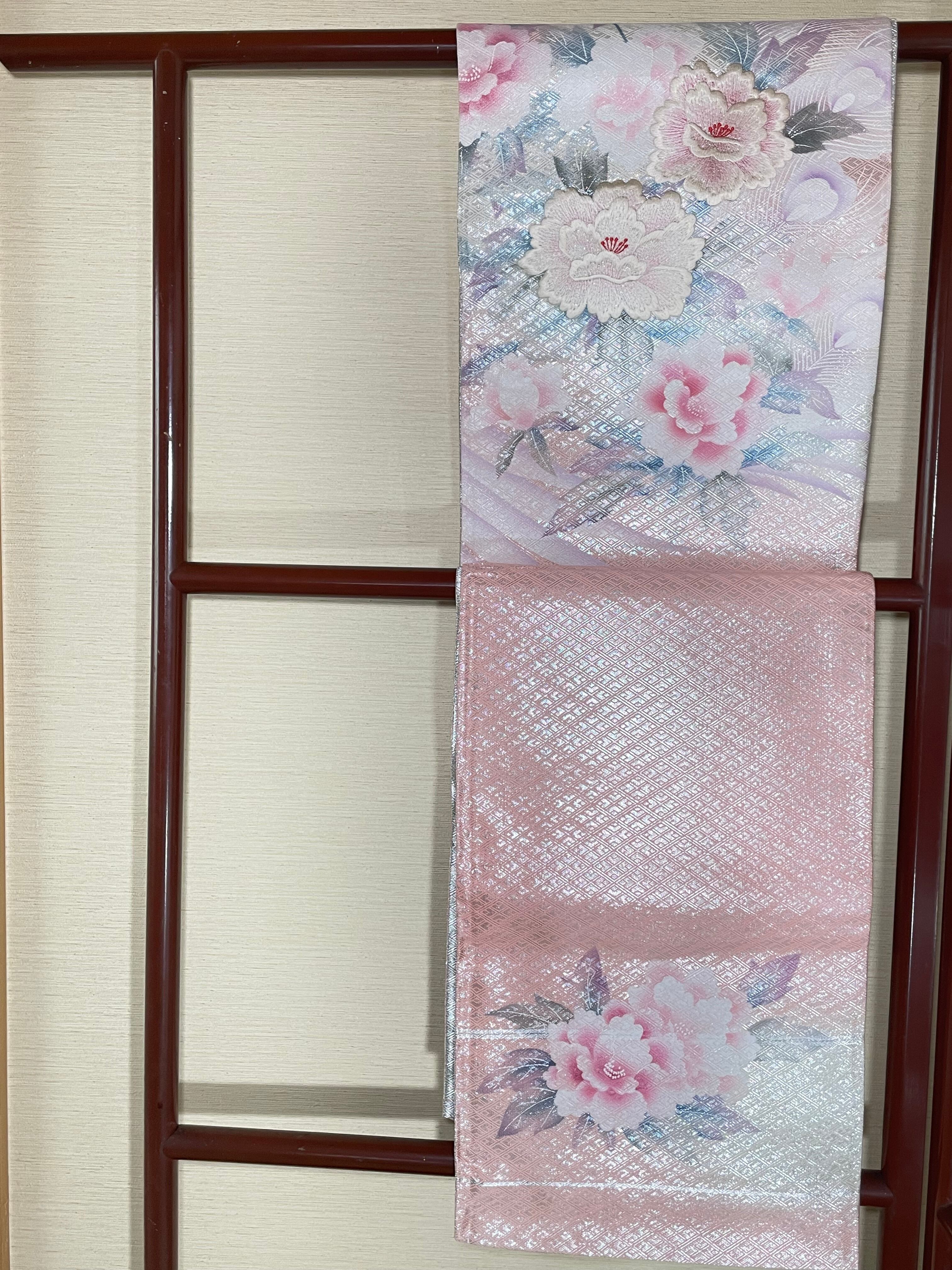 美しい佐賀錦の帯に牡丹の花が刺繍で施され、葉はグラデーションの色合いで染められています。帯の前幅の部分の柄を使い、無地の佐賀錦の部分と合わせ切り替えを入れて作成いたしました。佐賀錦の織に刺繍がされている帯は私自身初めて出会いました。とても上品で清楚なバッグとなりました。