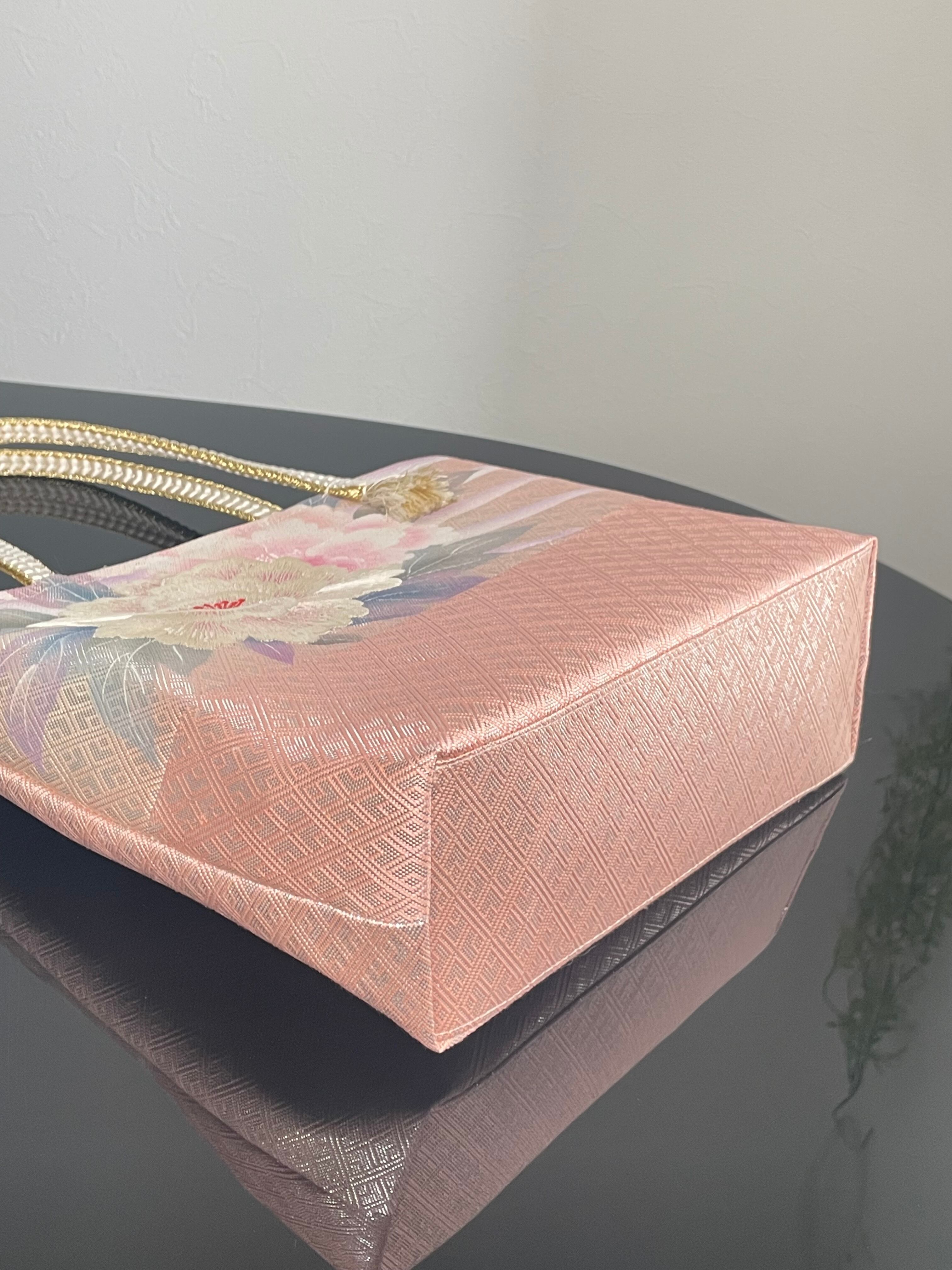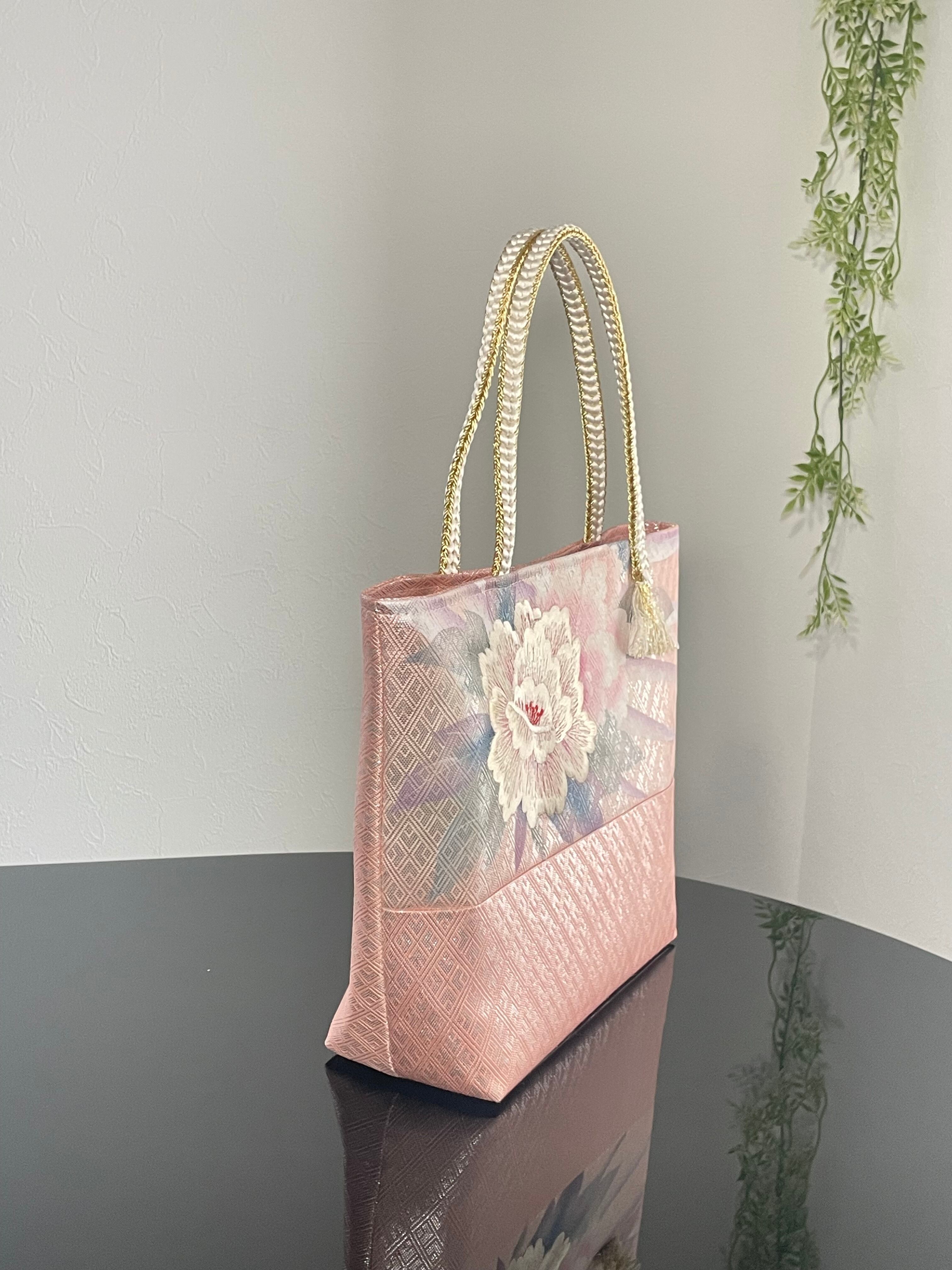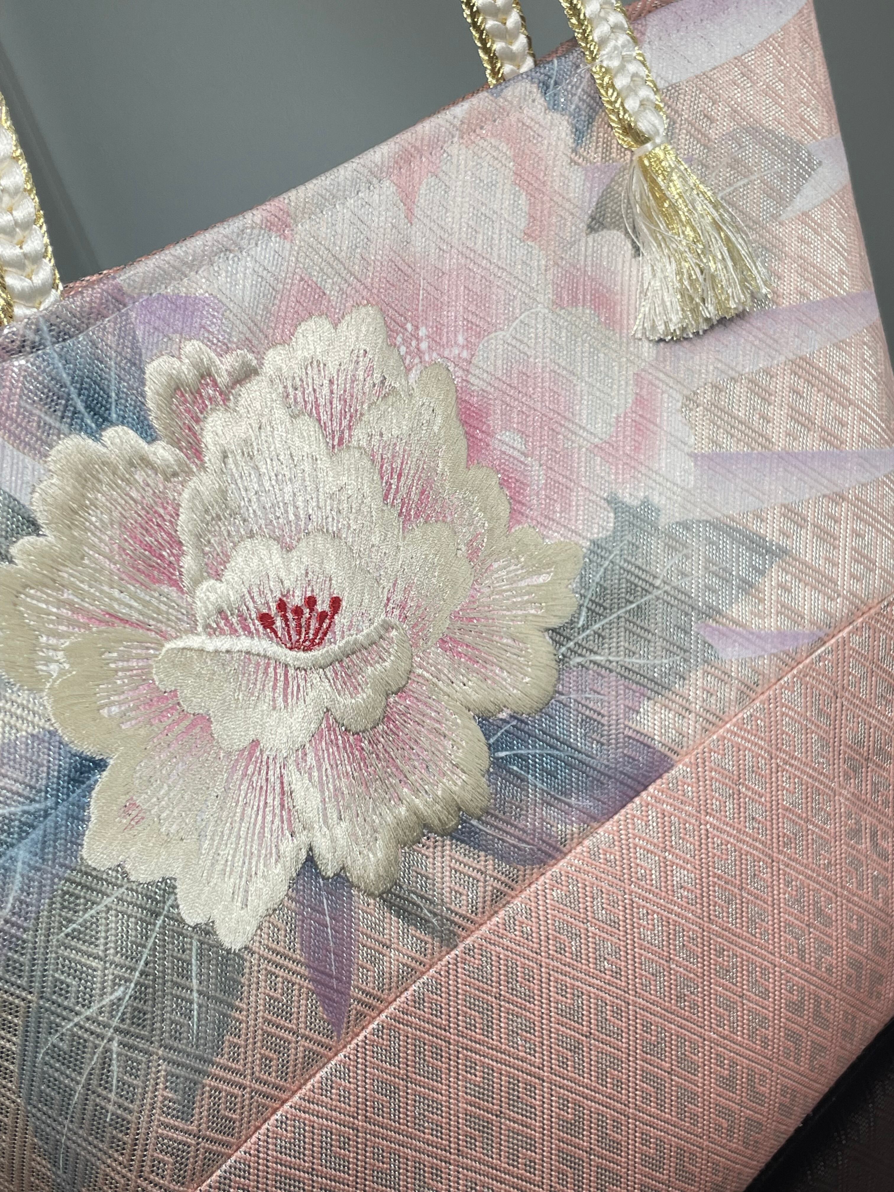 帯リメイクバッグ 佐賀錦 牡丹模様刺繍 トートバッグ 和装バッグ