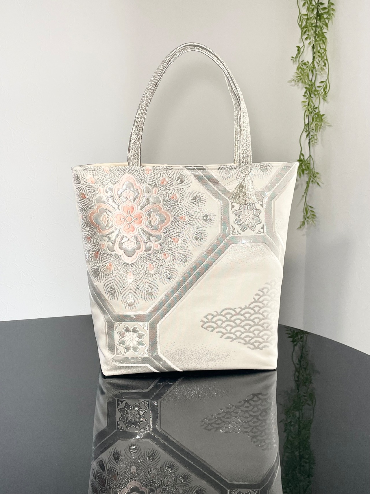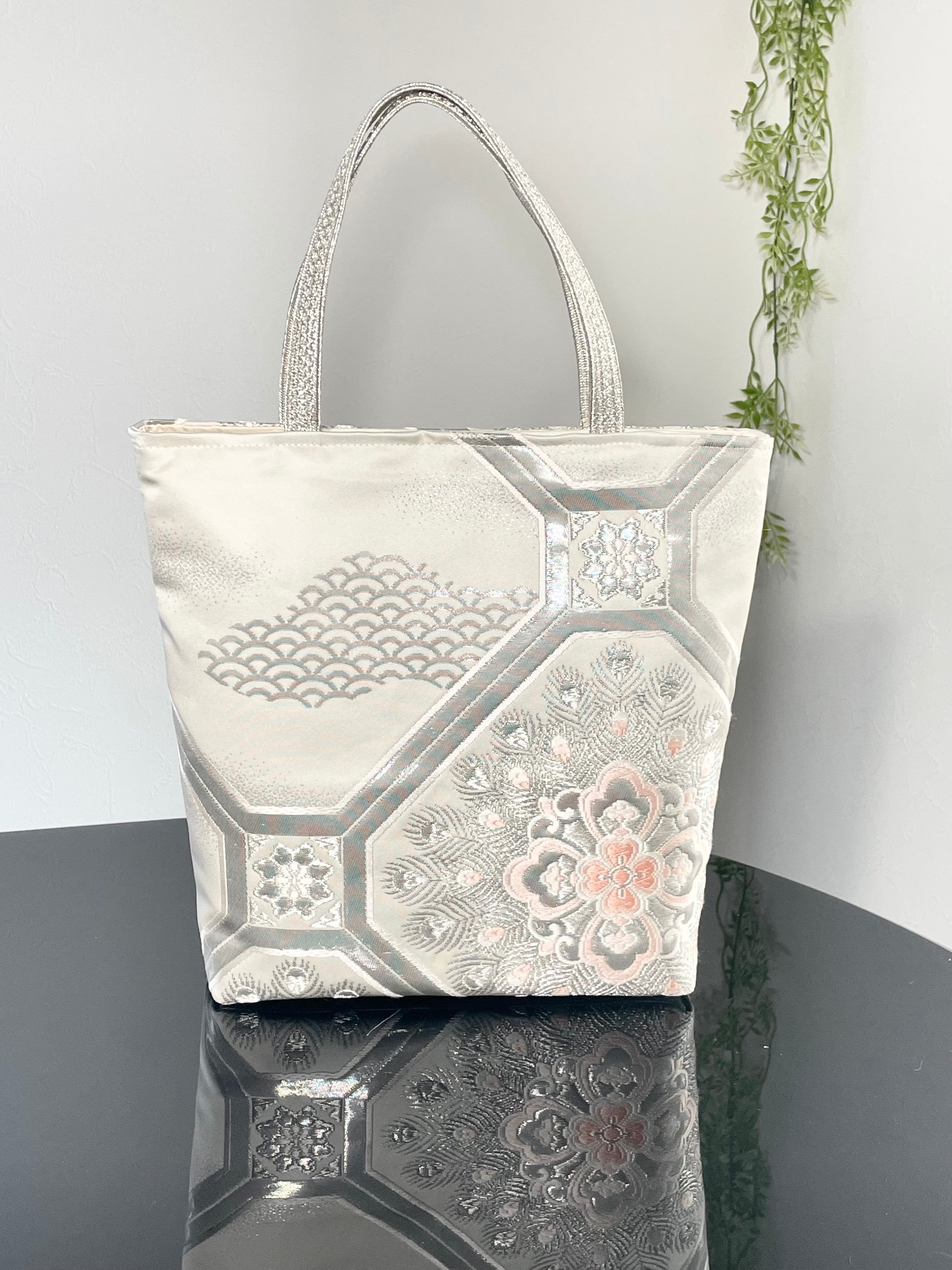 帯リメイクバッグ プラチナ二重箔 蜀江に華紋様 B5サイズ 和装バッグ 帯バッグ