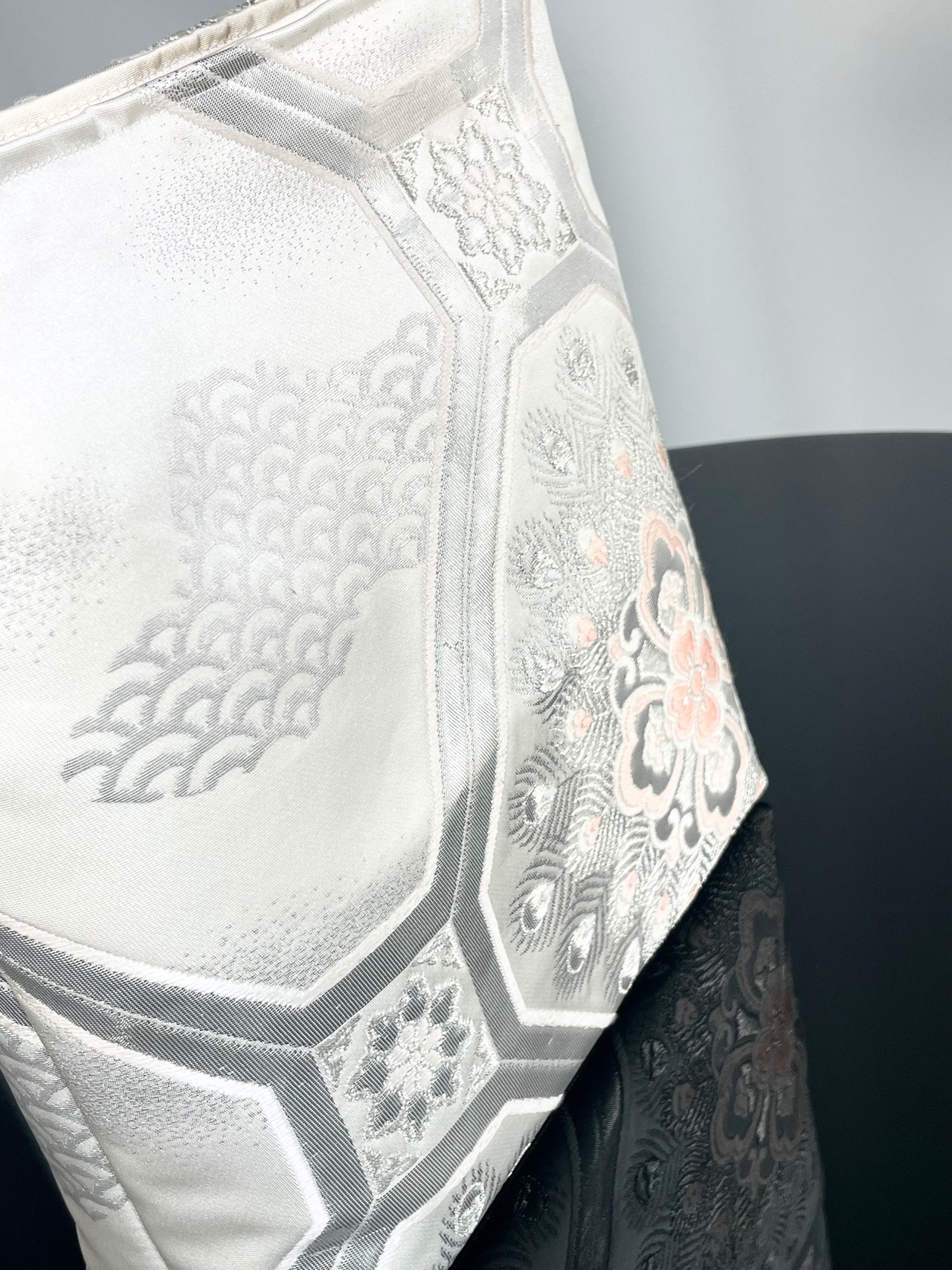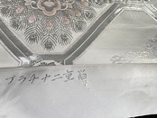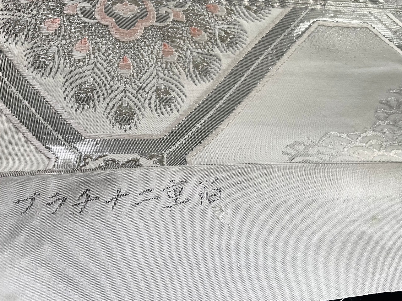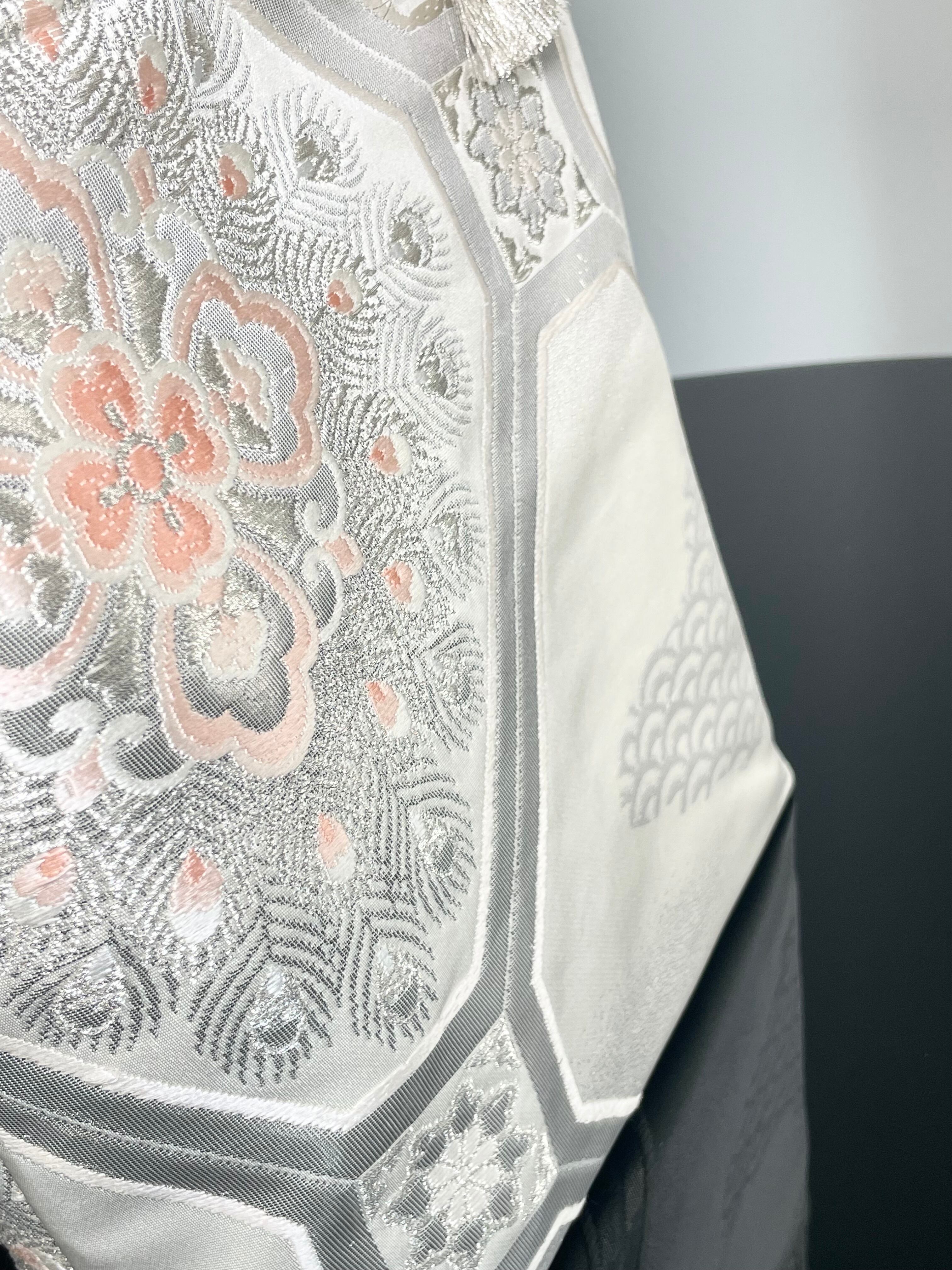 美しいプラチナ二重箔の袋帯からのリメイクです。蜀江紋様の中には、孔雀の羽と重なり合った大きな華紋様、青海波が織られています。プラチナの輝きが優しく上品で大変に美しいです。