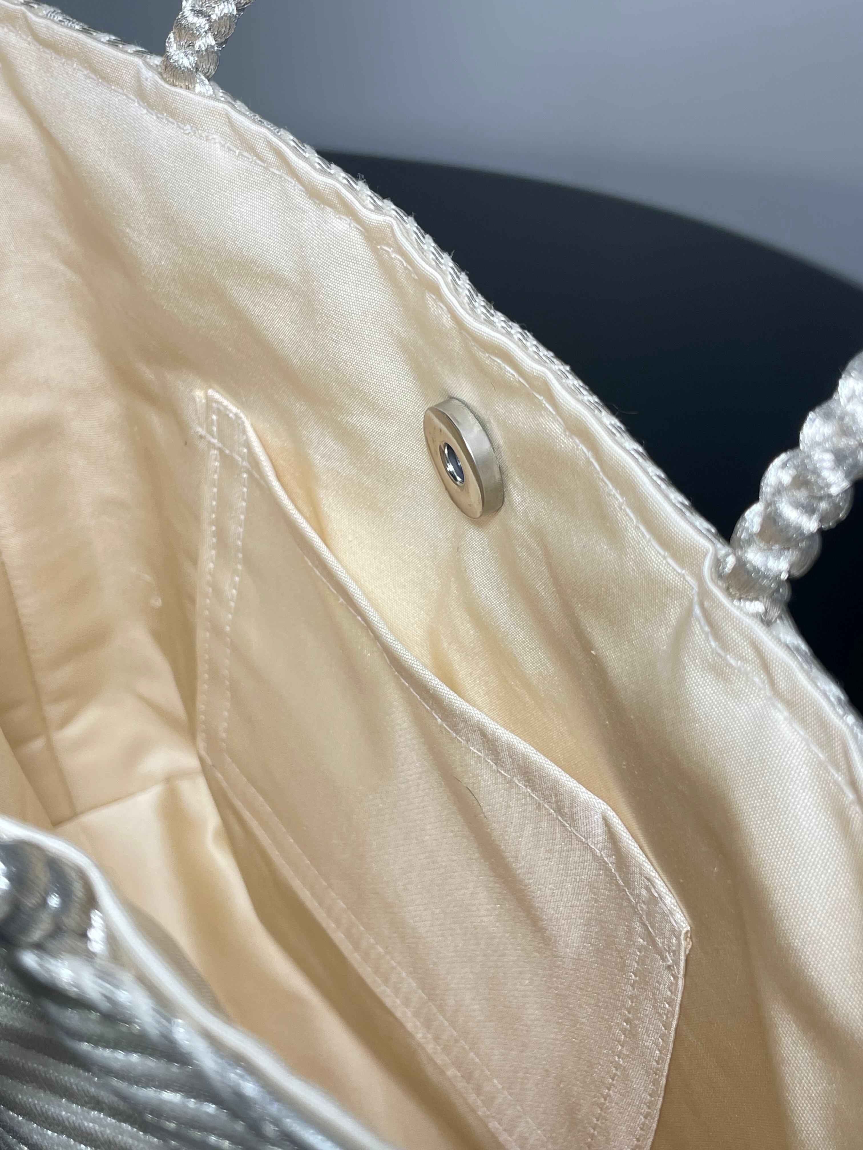 美しいプラチナ箔の帯からのリメイクです。小さな菱紋様が繋がり大きな紋様となり、いくつもの菱紋様で織られています。プラチナの輝きが優しく上品で、とっても美しいです。