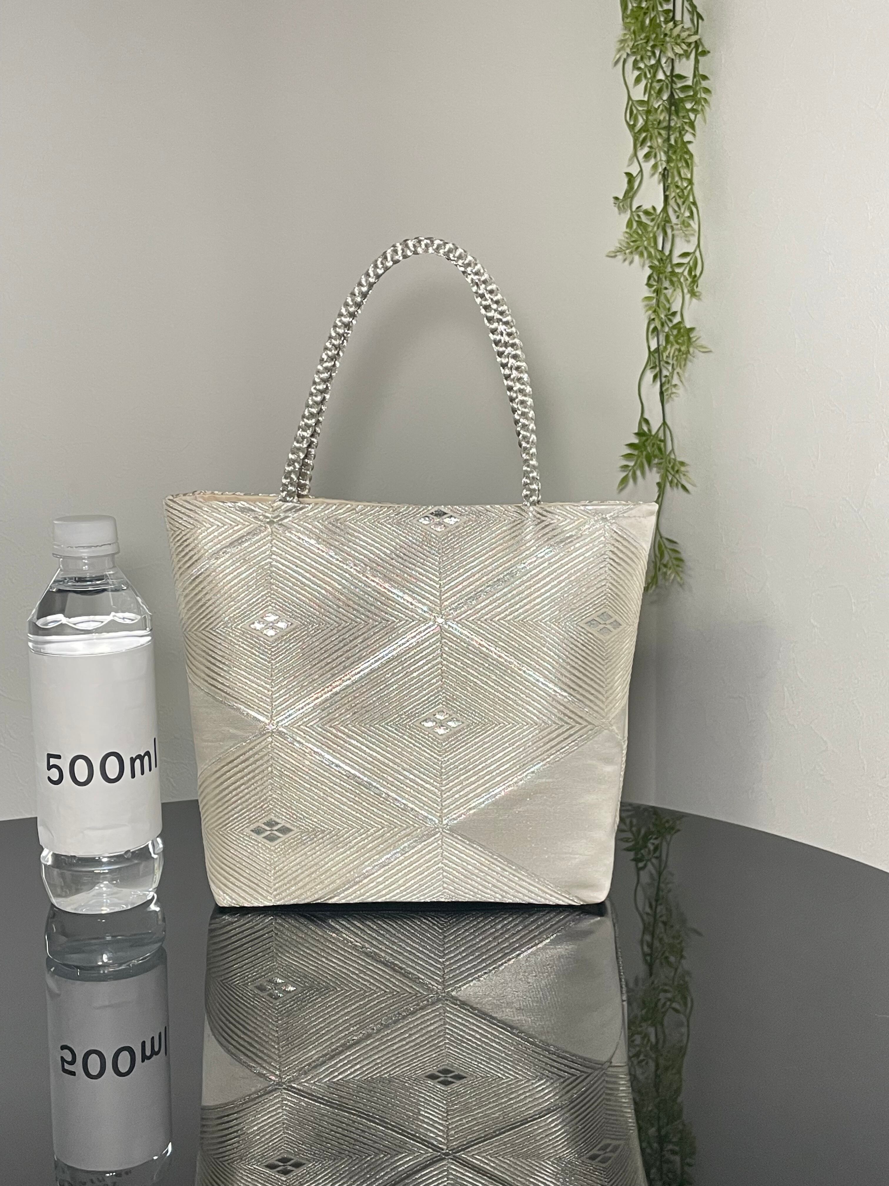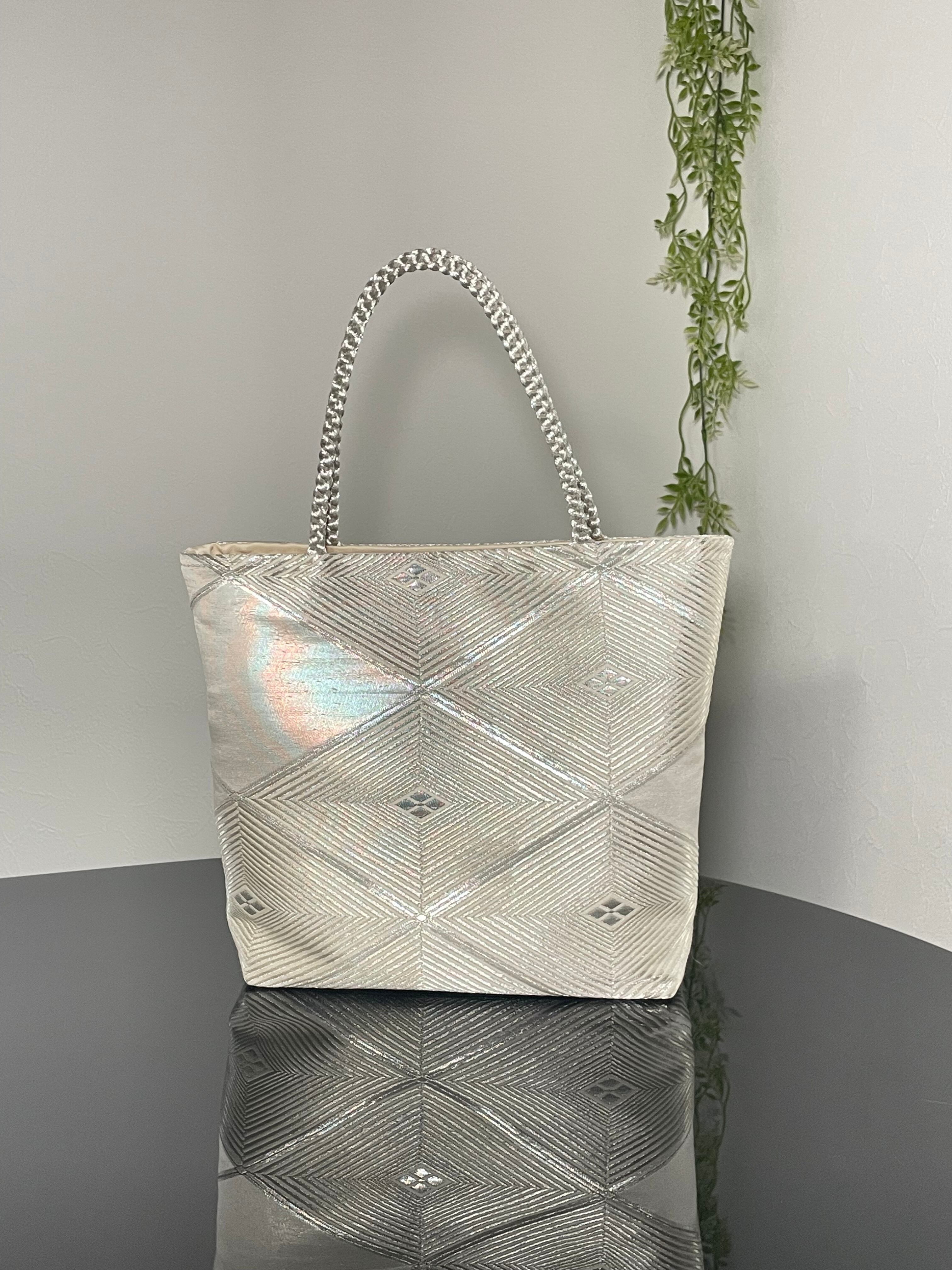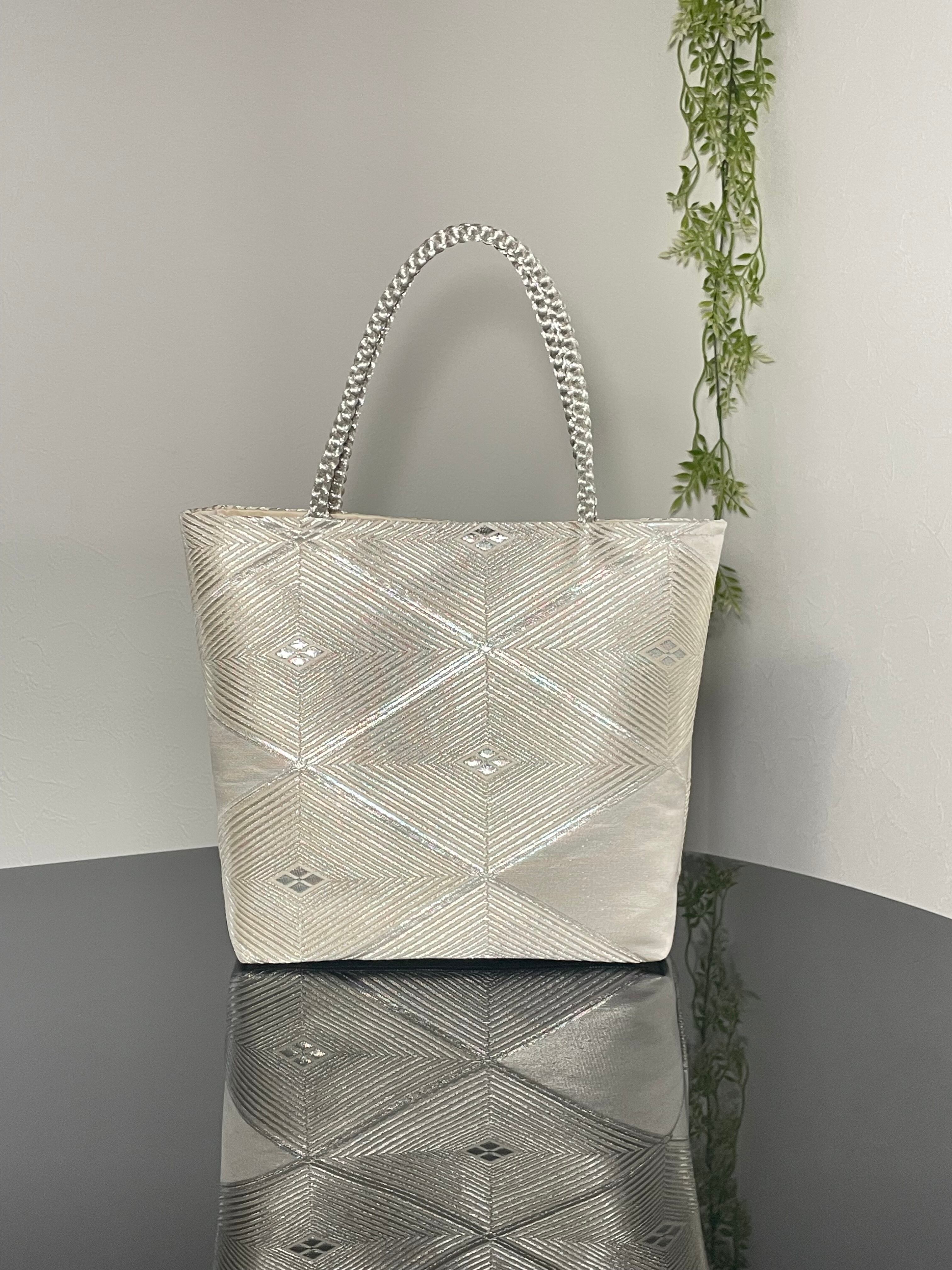 帯リメイクバッグ プラチナ箔 菱繋ぎ紋様 トートバッグ 和装バッグ